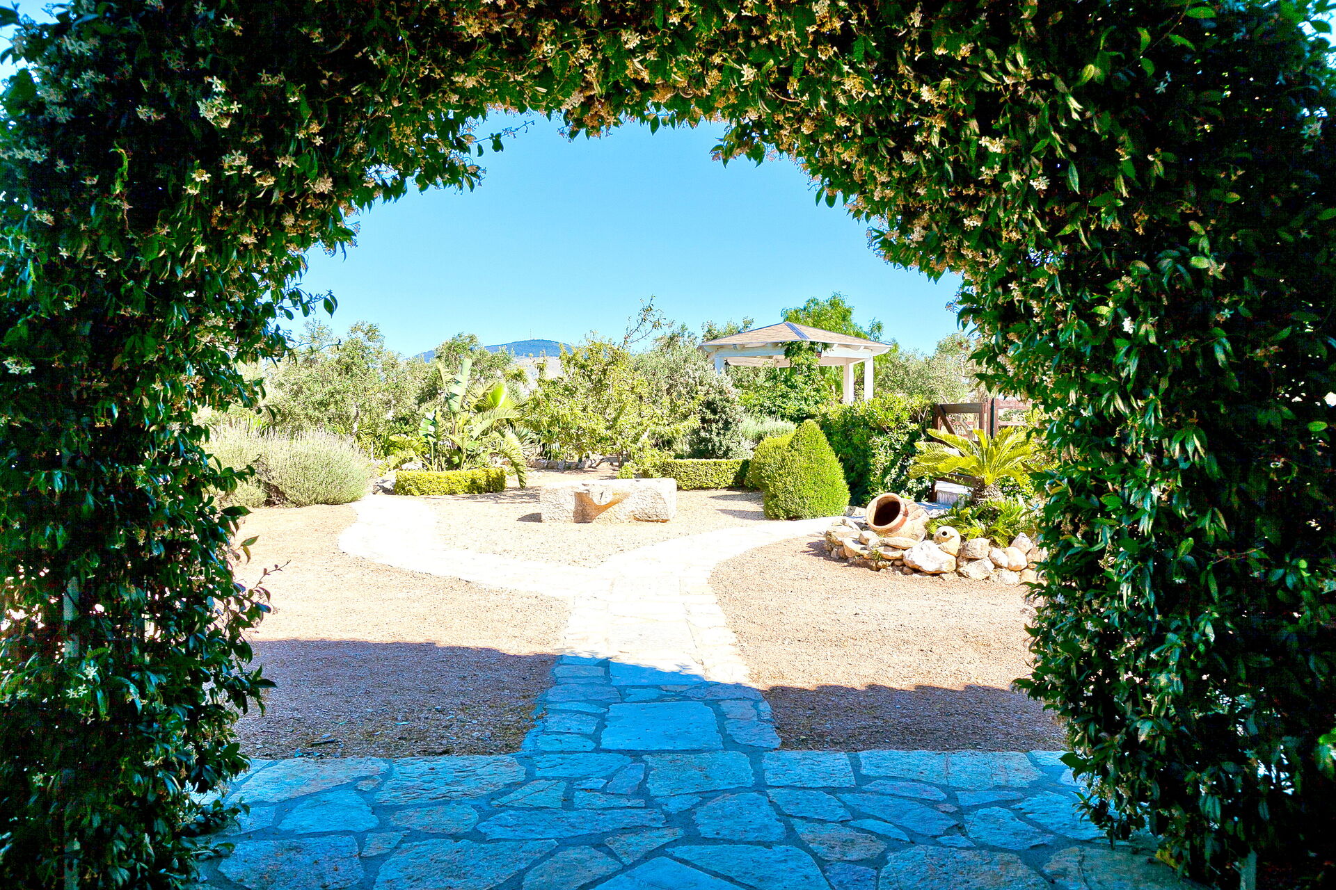 Der Hof auf dem sich die Villa befindet ist hauptsächlich mit Olivenhainen und typisch mediterraner Vegetation bepflanzt, so das die Umgebung sehr grün und üppig bewachsen ist.