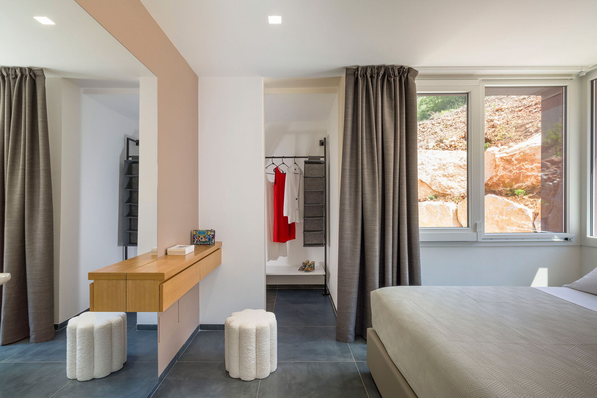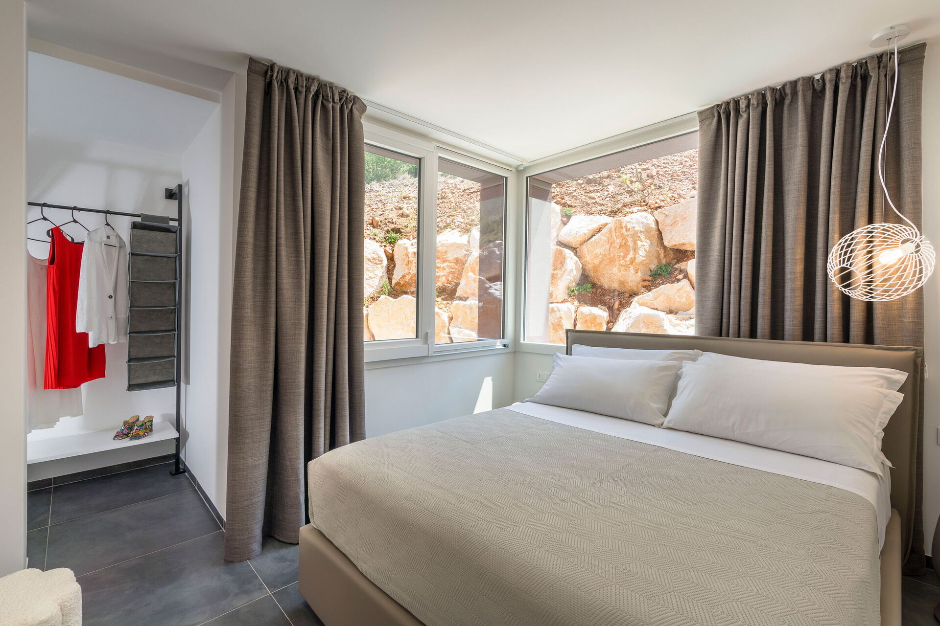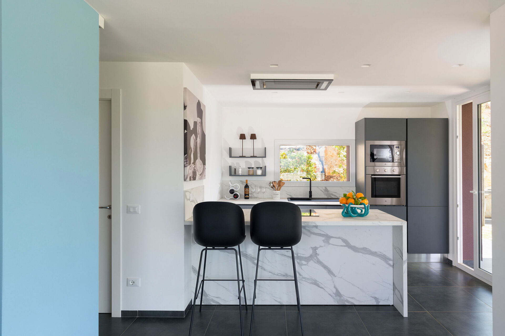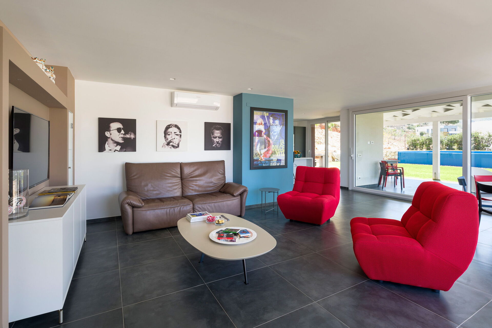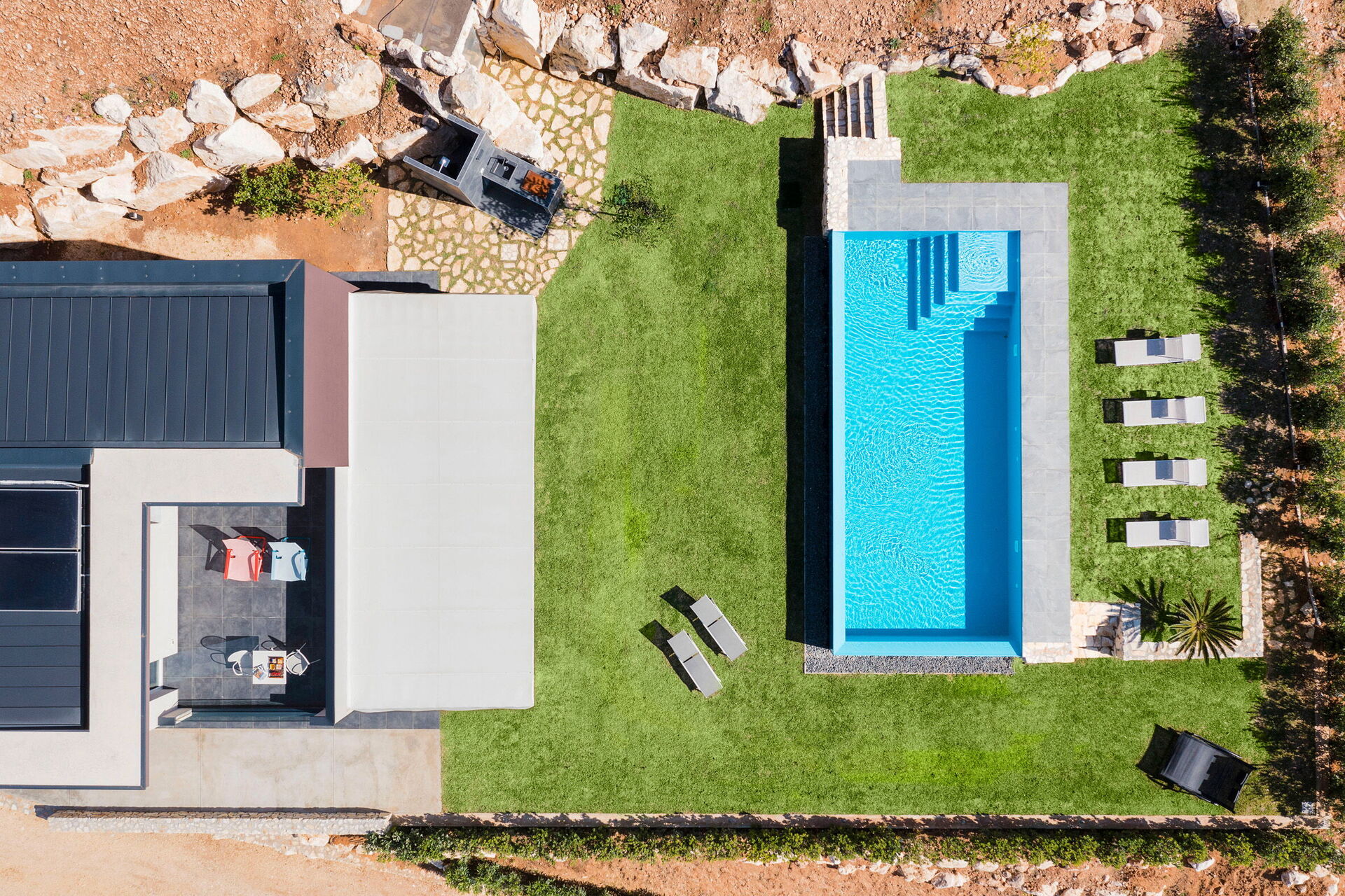 Große Außenbereiche wie die Sonnenterrasse am Schwimmbad stehen den Gästen zum Entspannen in Gesellschaft von Freunden oder der Familie in absoluter Privatsphäre zur Verfügung. Ein ausgestatteter Bereich unter einer Veranda ermöglicht es den Gästen, draußen zu essen und dabei den wunderbaren Panoramablick zu genießen.