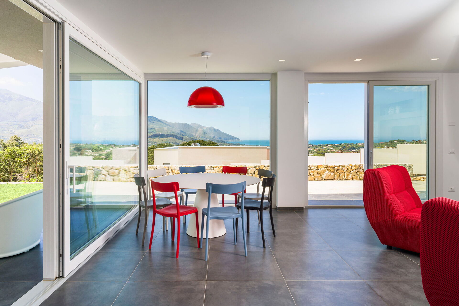 Die Ferien-Villa befindet sich in einer spektakulären Panoramalage mit atemberaubendem Blick auf den Golf von Castellammare und die sizilianische Landschaft, die sowohl vom Infinity-Schwimmbad als auch von den großen Terrassen aus bewundert werden kann.