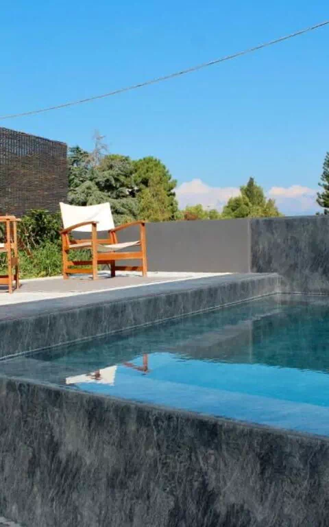 Im Außenbereich lädt eine Pergola mit Sofa und Essbereich dazu ein, die Tage im Freien zu genießen. Das elegante private Infinity-Schwimmbad, das exklusiv den Gästen zur Verfügung steht, ist über einige Stufen erreichbar und wird von zwei Sonnenterrassen mit Sonnenliegen umgeben – ideal für entspannte Sonnenbäder und erfrischende Schwimmzüge.