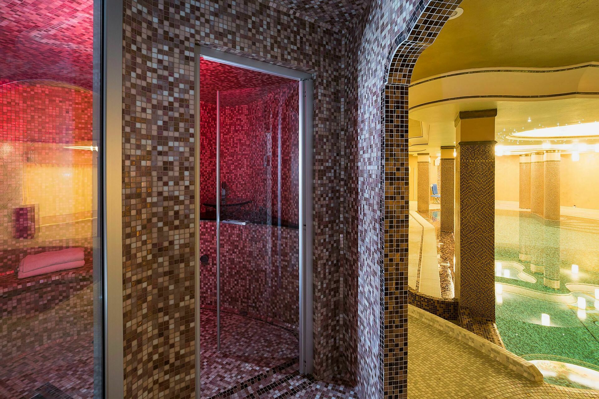 Im Erdgeschoss befindet sich der Wellness- Bereich mit einem Hammam, Whirlpool, 2 Bädern und das schöne beheizte Schwimmbad im Inneren.