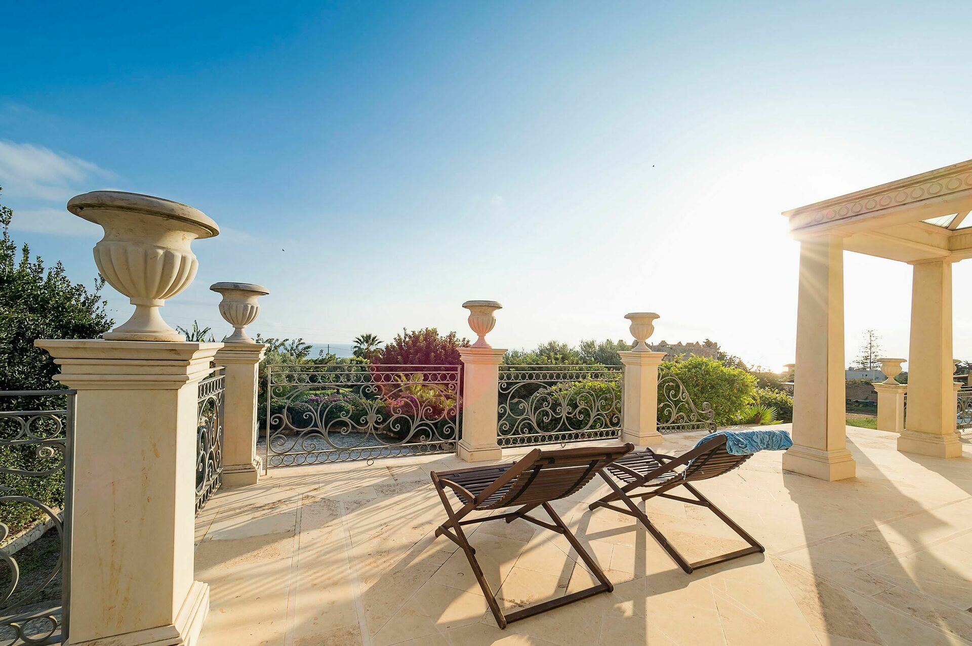 Die Villa ist umgeben von einem sehr gepflegten Garten, der eingerahmt ist von alten Steinmauern und in dem sich grosse Panorama- Terrassen befinden von denen aus man einen wunderschönen Blick über die umliegende Gegend und das Meer hat.