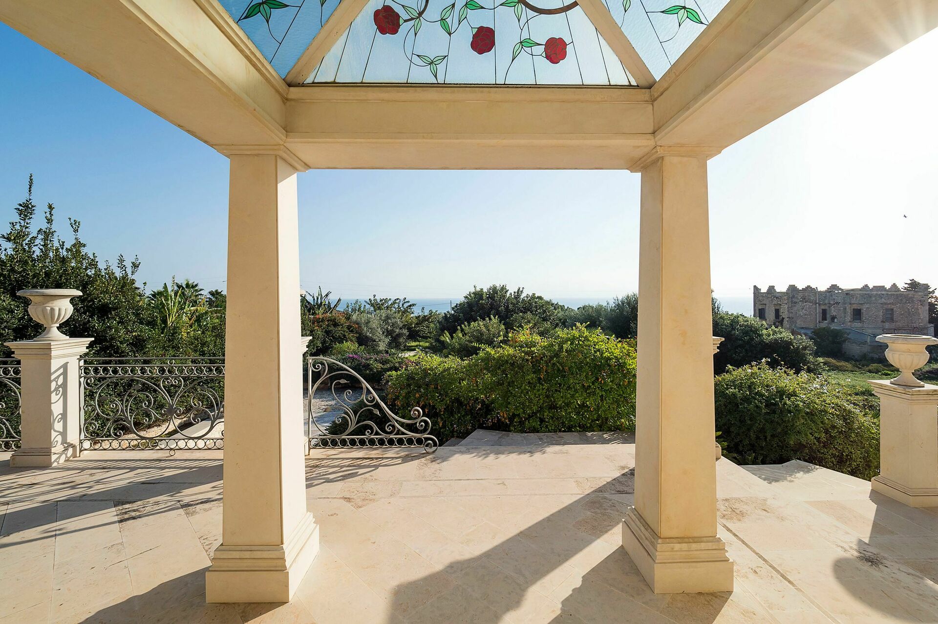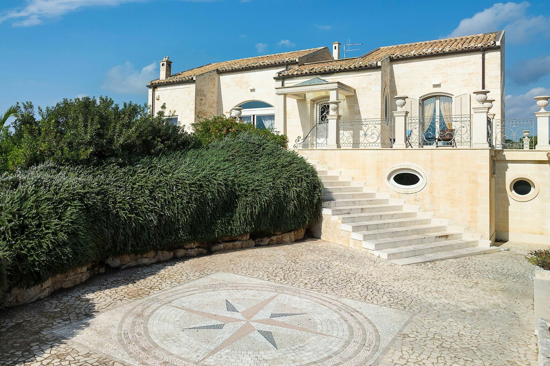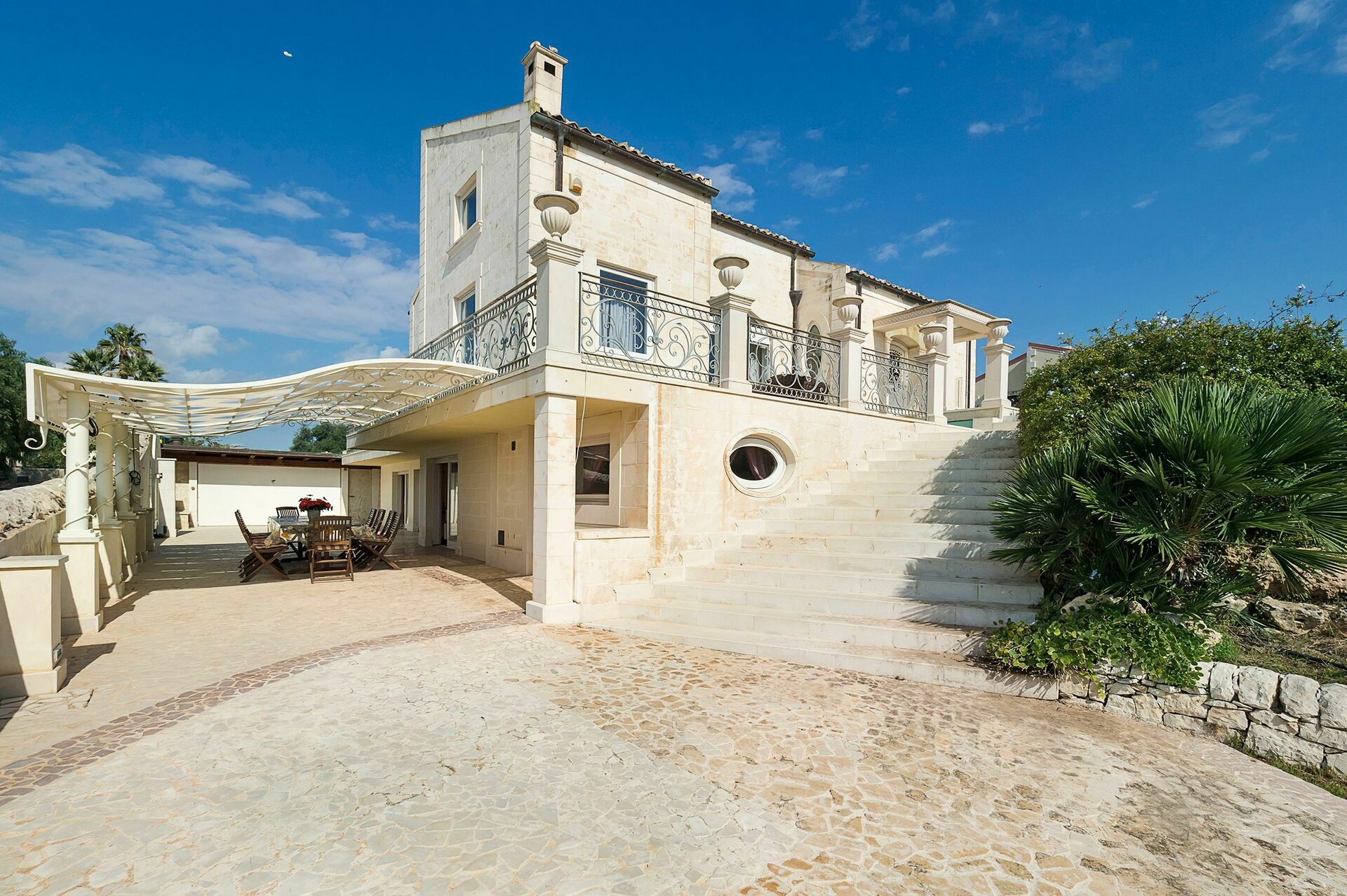 Die Villa ist mit natürlichen Materialien gebaut worden nach der Tradition der typischen Bauweise dieser Gegend in Sizilien. Die luxeriöse Villa erstreckt sich über 3 Stockwerke, die auch durch einen Aufzug miteinander verbunden sind.