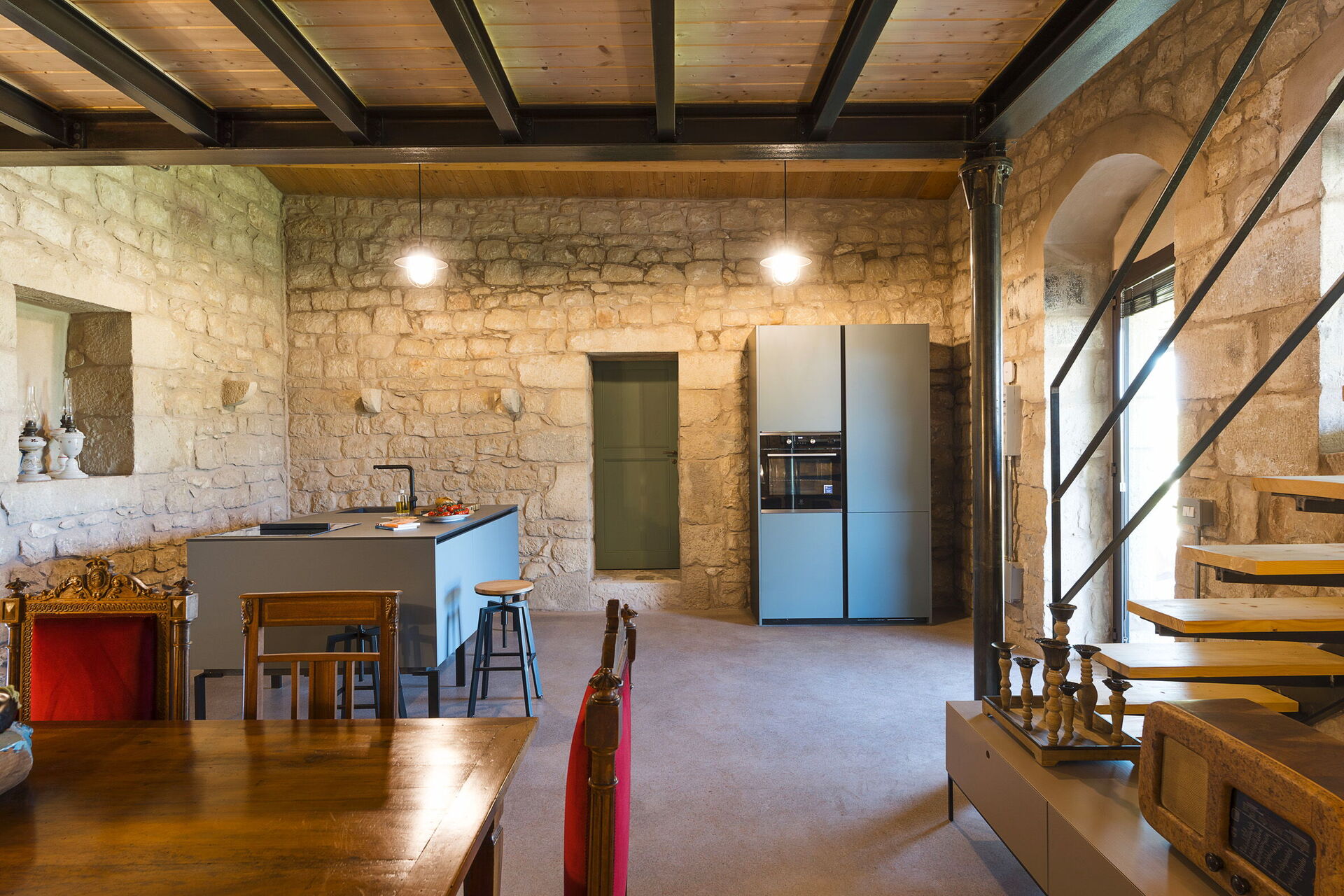 Erhöhtes Erdgeschoss: Zugang zum Wohnbereich mit Küche (Induktionskochfeld, Backofen, Kühlschrank, Gefrierschrank, Geschirrspüler, Mikrowelle, Toaster, Espressomaschine, Kaffeemaschine) und Essbereich sowie Lounge mit Sofa auf der Galerieebene; Wohnzimmer mit Kamin und Doppelzimmer auf der Galerieebene; Badezimmer mit Dusche, Doppelzimmer (Bettgröße: 160 x 200 cm) mit privatem Badezimmer mit Dusche.