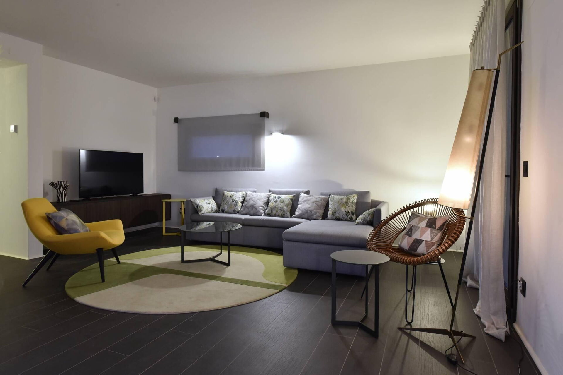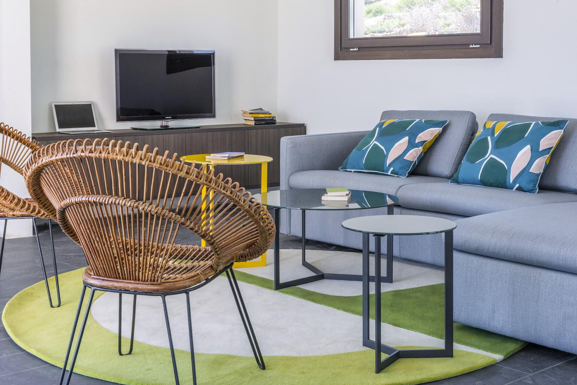 Hochparterre: Eingang zum Wohnzimmer mit Doppelschlafcouch, Küche (Backofen, Kühlschrank, Espressomaschine) mit Essbereich und Zugang zur Panoramaterrasse, Doppelzimmer (Klimaanlage) mit privatem Bad mit Dusche.