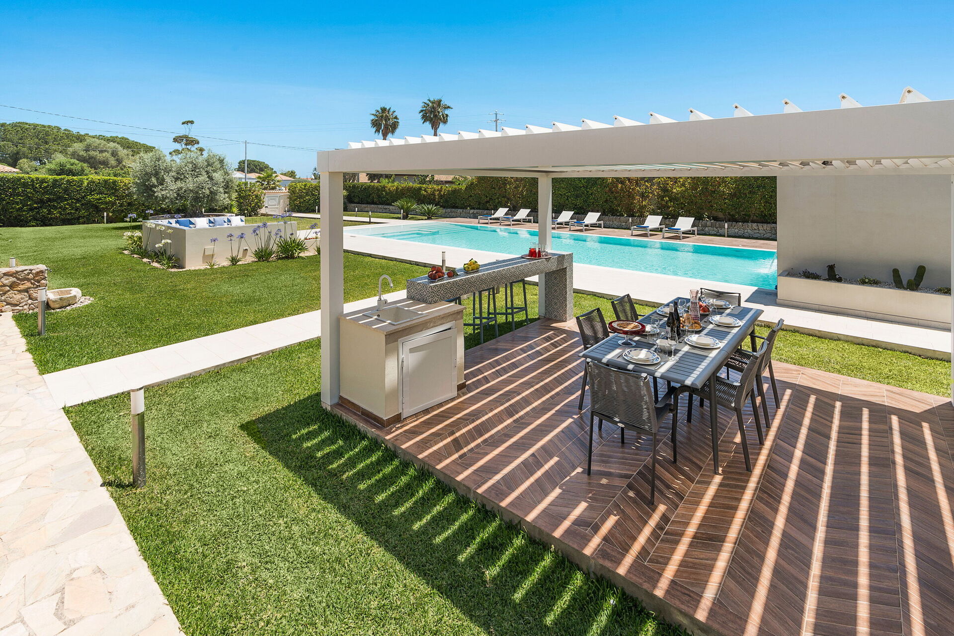 Diese charmante Villa wurde geschmackvoll im modernen Stil eingerichtet und bietet dank ihrer 3 Schlafzimmer und Gemeinschaftsräume, die mit allem Komfort ausgestattet sind, Platz für bis zu 6 Personen. Im Aussenbereich beherbergt ein gepflegter Garten ein schönes Schwimmbad (mit Salzreinigung) und große, gut ausgestattete Terrassen mit Tischen und Stühlen, auf denen die Gäste ihre Mahlzeiten im Freien organisieren können. Dies ist der ideale Ort, um die heißesten Tage am Schwimmbad in Gesellschaft von Freunden und Familie zu verbringen!