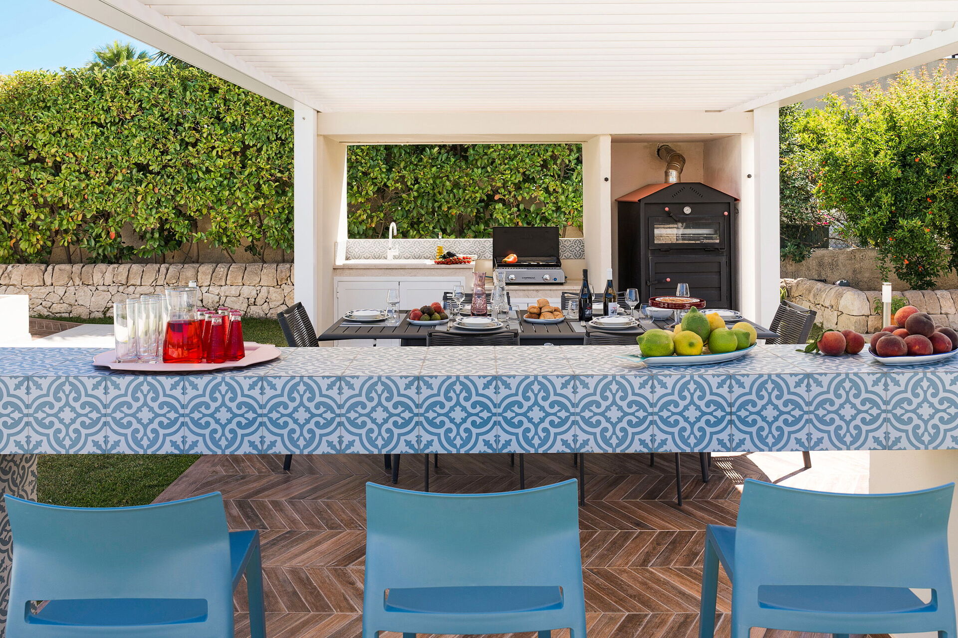 - >Pavillon ausgestattet mit Tisch und Stühlen, Holzofen und Grill li >