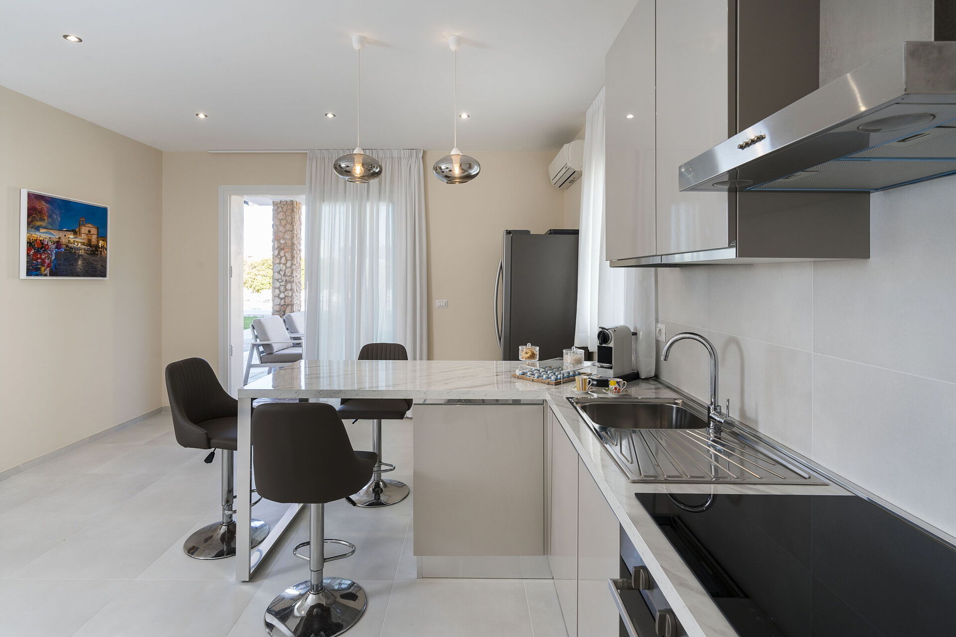 Erdgeschoss: Wohnzimmer mit Essbereich, Küche (Backofen, Kühlschrank, Gefrierschrank, Geschirrspüler, Mikrowelle, Toaster, Espressomaschine, amerikanische Kaffeemaschine), Waschküche, Badezimmer mit Dusche. Erster Stock: Doppelzimmer mit privatem Bad mit Dusche, Zweibettzimmer, Doppelzimmer, Badezimmer mit Dusche.