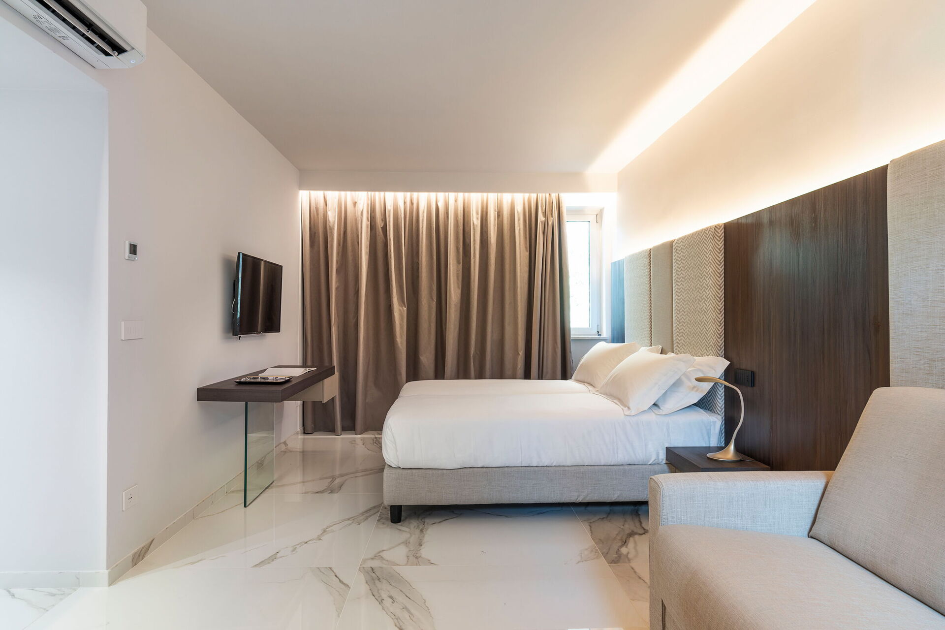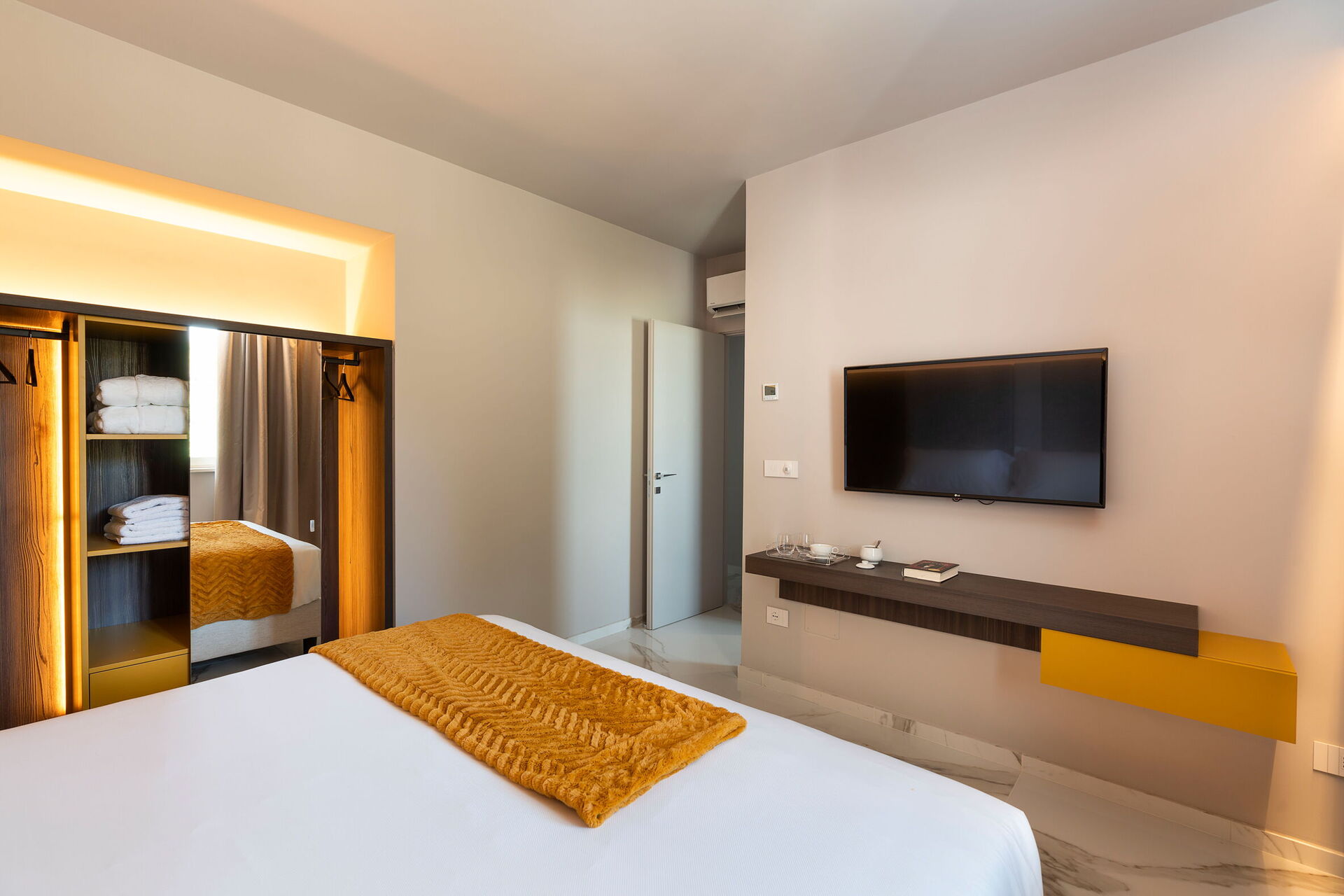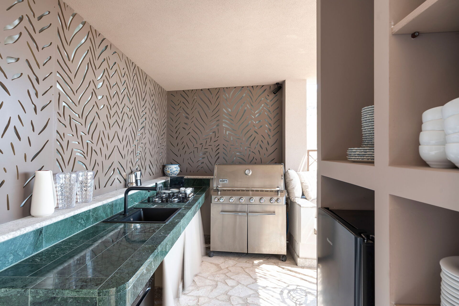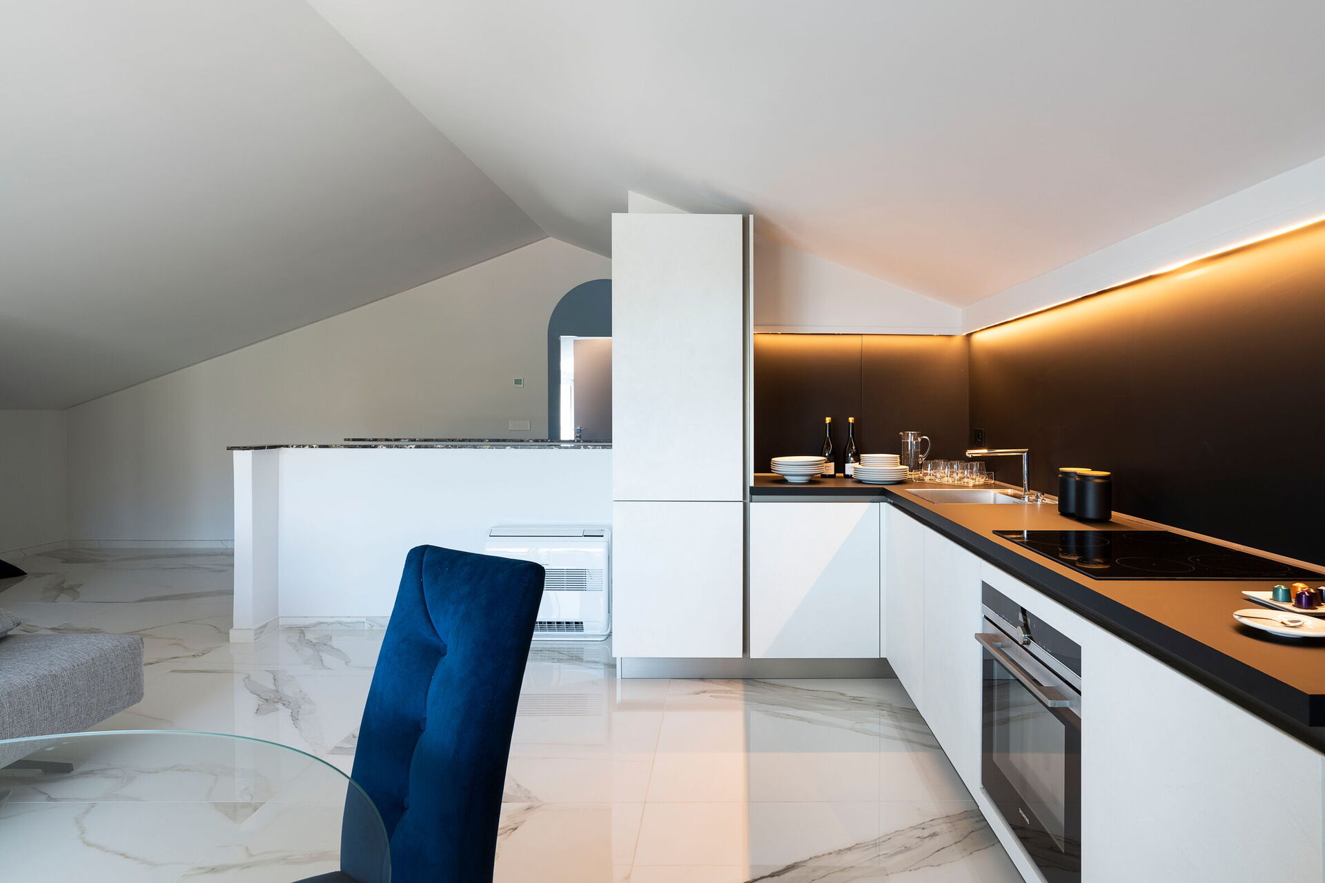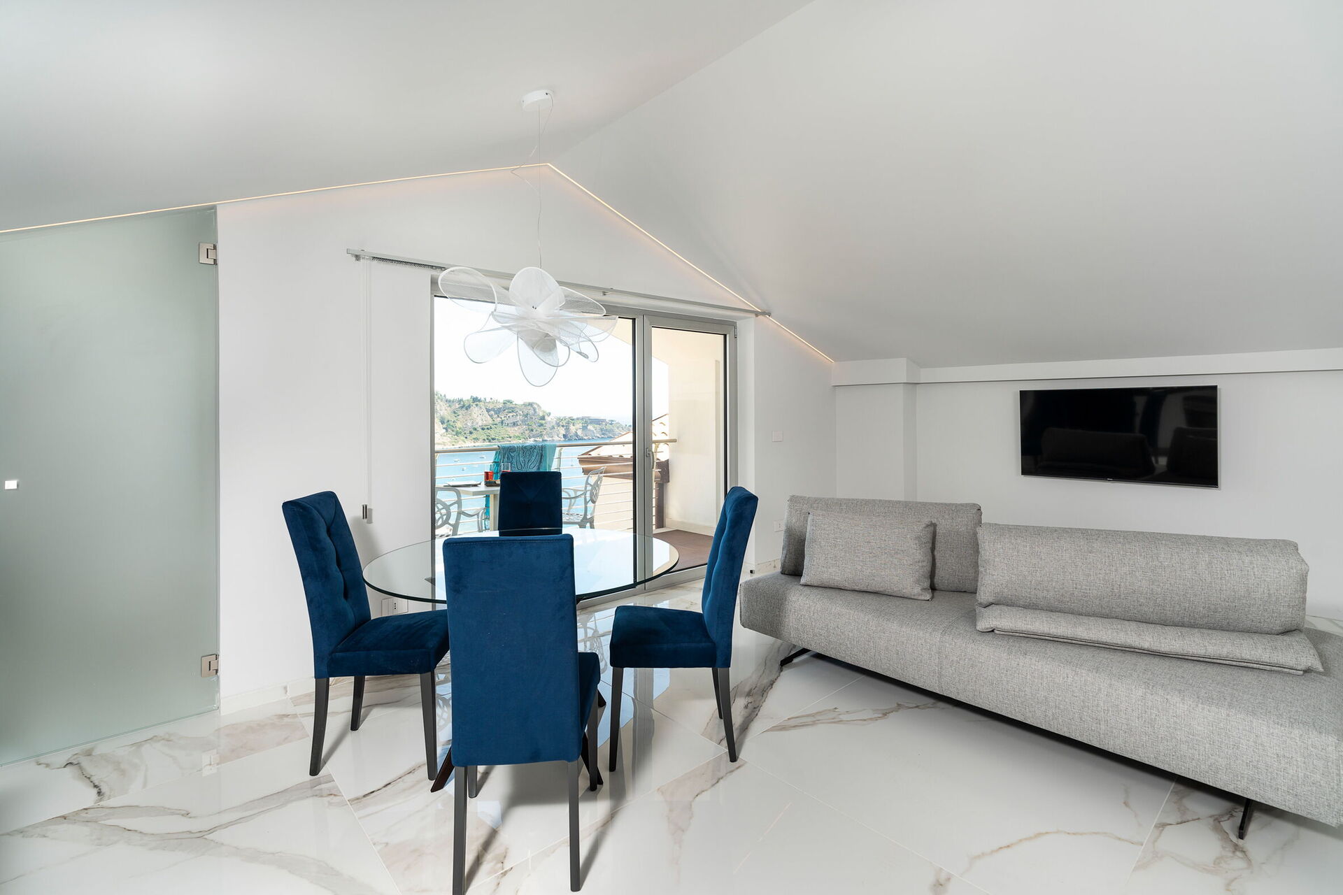 Dritte Etage: Wohnzimmer (Klimaanlage, TV) mit Essbereich, Küche (Herd, Backofen, Kühlschrank, Gefrierschrank, Geschirrspüler, Mikrowelle, Toaster, Espressomaschine), Doppelzimmer (Klimaanlage, TV). ) mit privatem Bad mit Dusche.