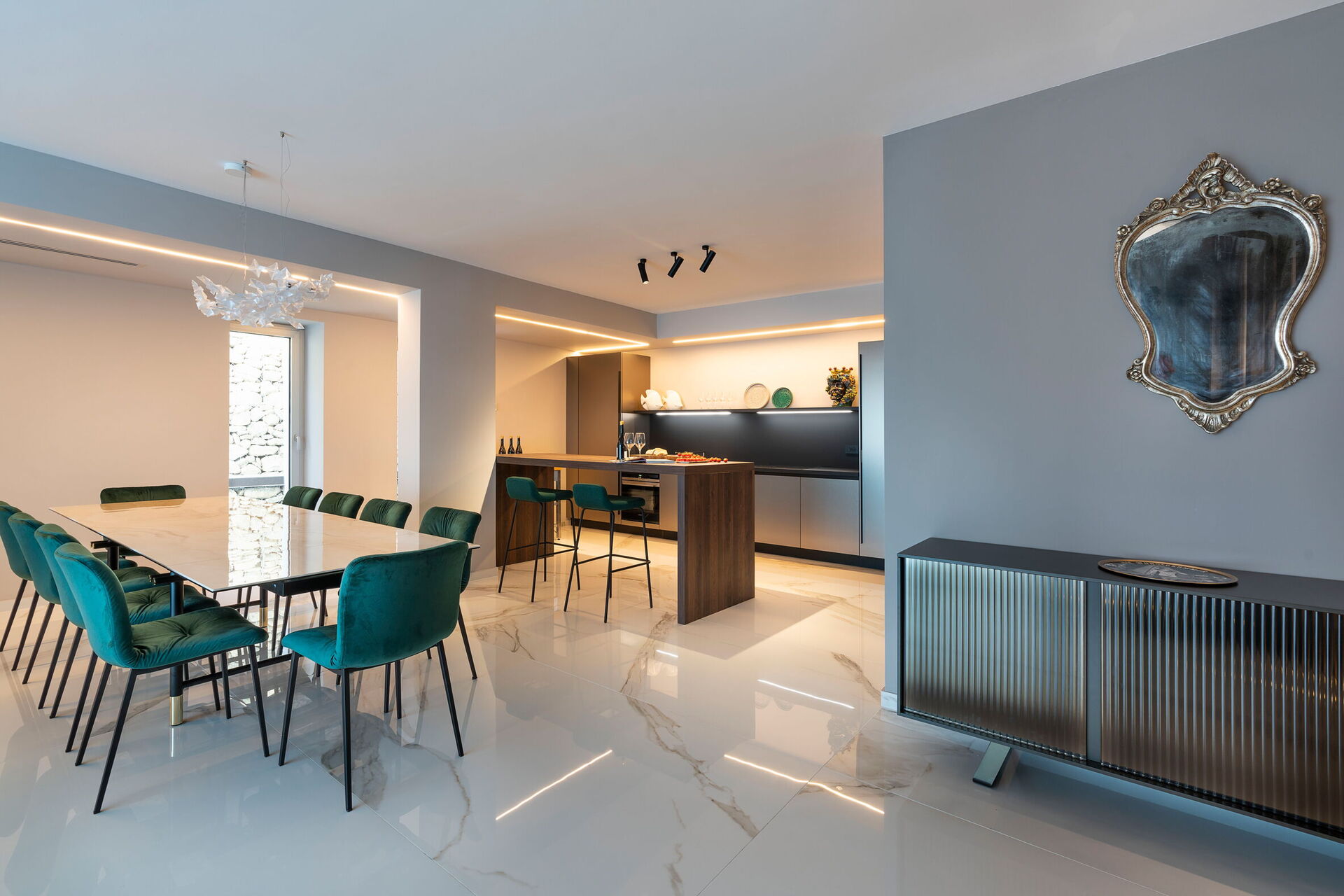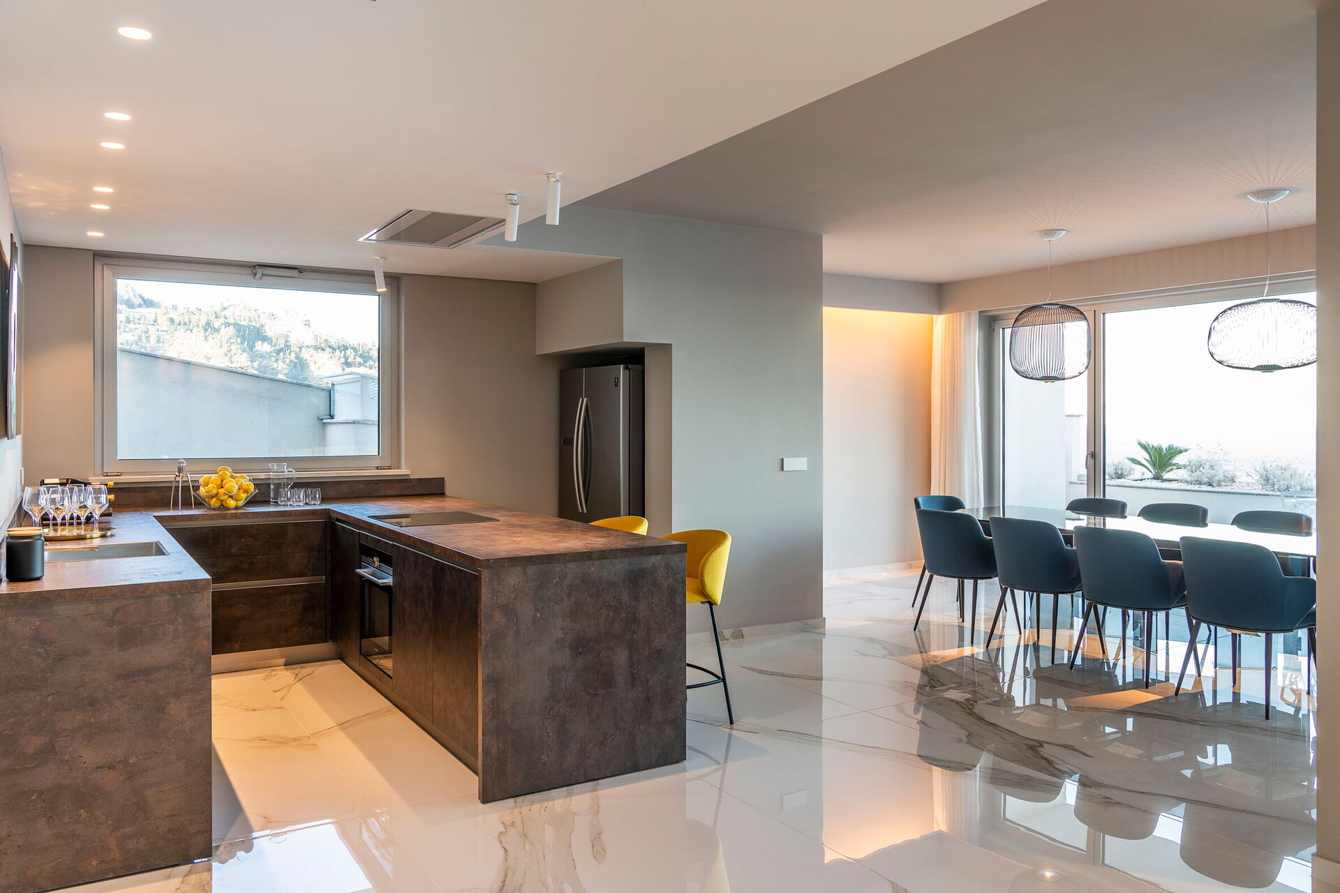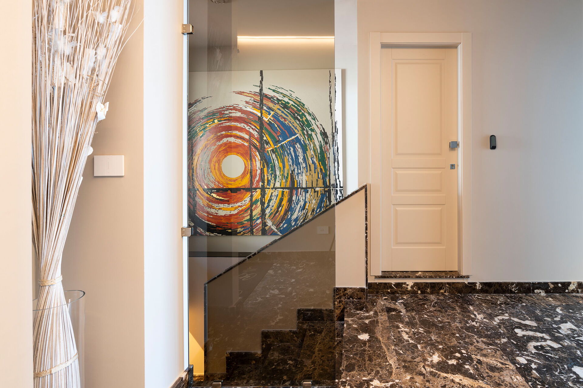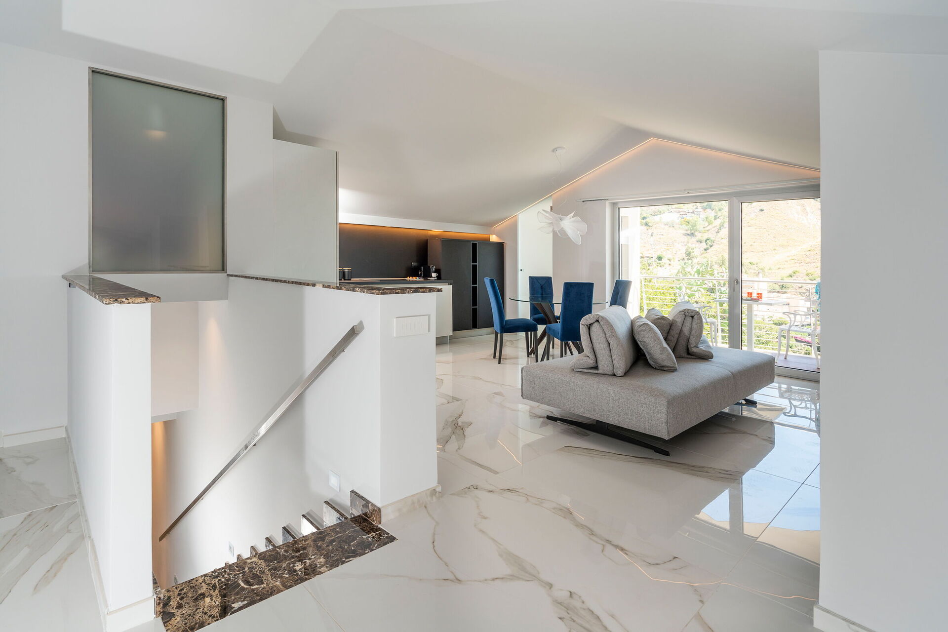 Die Villa erstreckt sich über vier Etagen: Die komfortablen Innenräume sind im modernen Stil eingerichtet und mit allem Komfort ausgestattet (Aufzug, Klimaanlage, W-Lan, TV). Die Villa verfügt über 10 Schlafzimmer mit jeweils privatem Bad und große Gemeinschaftsbereiche, darunter vier Wohnbereiche mit Küche, Esszimmer und Wohnzimmer sowie einen Wellnessbereich mit Fitnessraum und Sauna. Diese Villa bietet bequem Platz für bis zu 20 Personen.