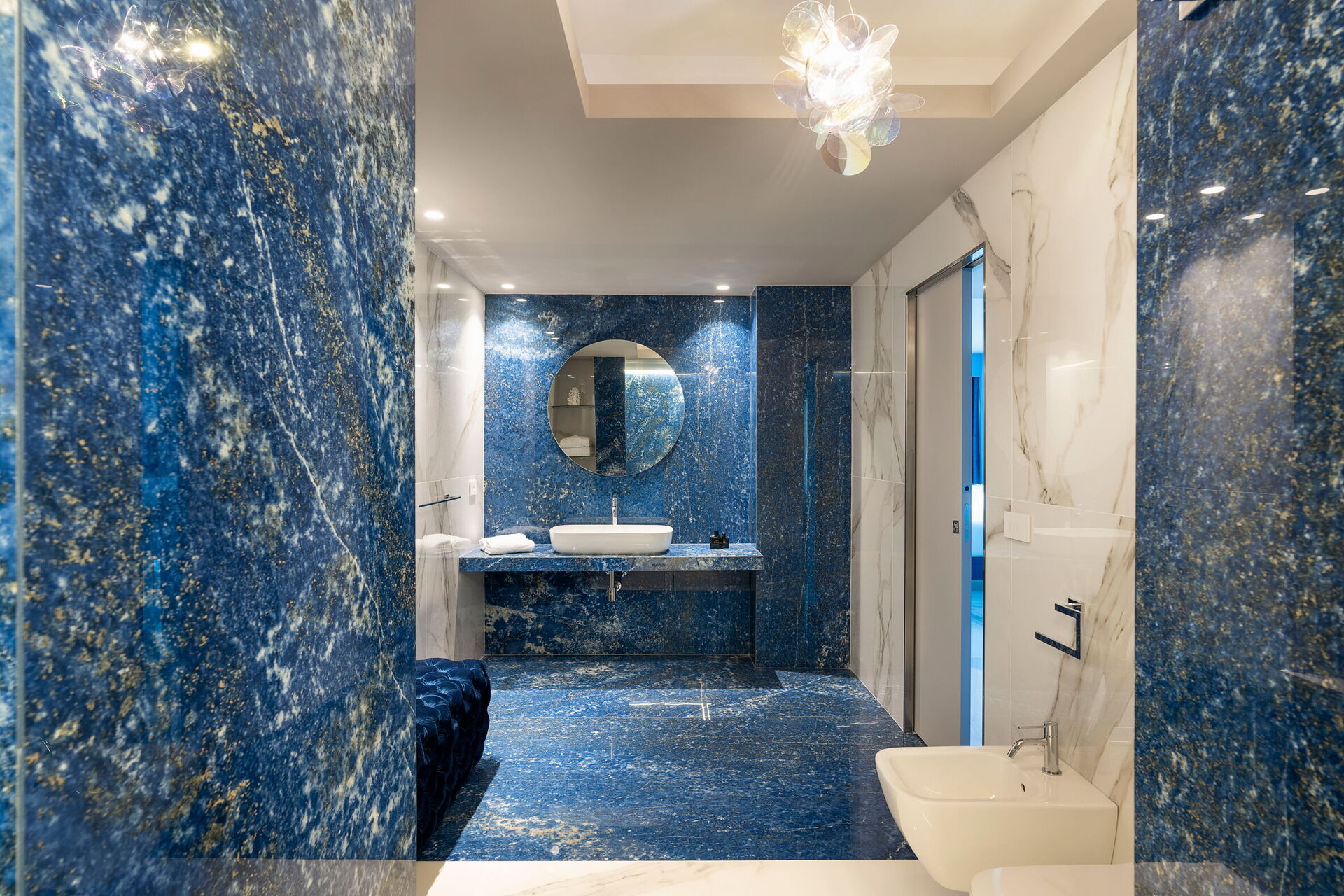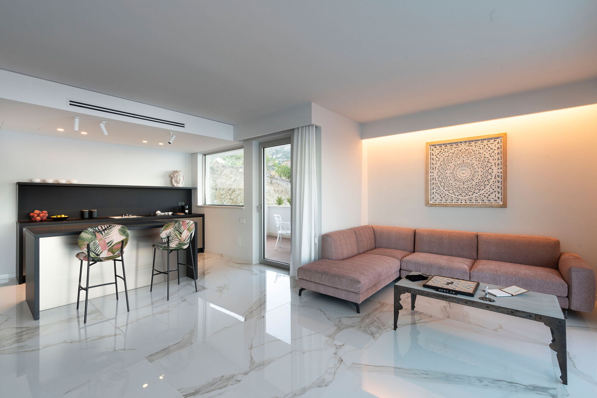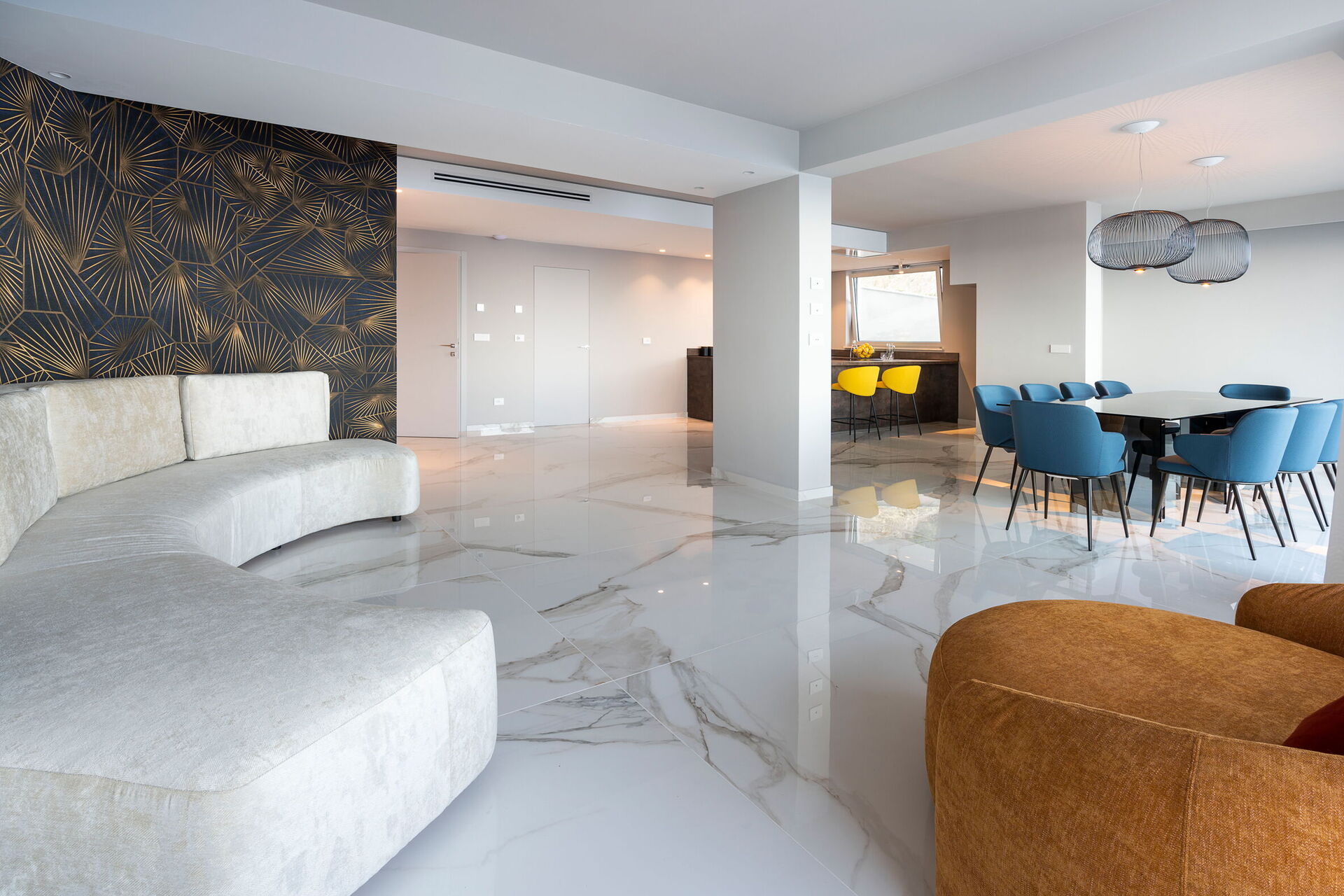 Die Villa erstreckt sich über vier Etagen: Die komfortablen Innenräume sind im modernen Stil eingerichtet und mit allem Komfort ausgestattet (Aufzug, Klimaanlage, W-Lan, TV). Die Villa verfügt über 10 Schlafzimmer mit jeweils privatem Bad und große Gemeinschaftsbereiche, darunter vier Wohnbereiche mit Küche, Esszimmer und Wohnzimmer sowie einen Wellnessbereich mit Fitnessraum und Sauna. Diese Villa bietet bequem Platz für bis zu 20 Personen.