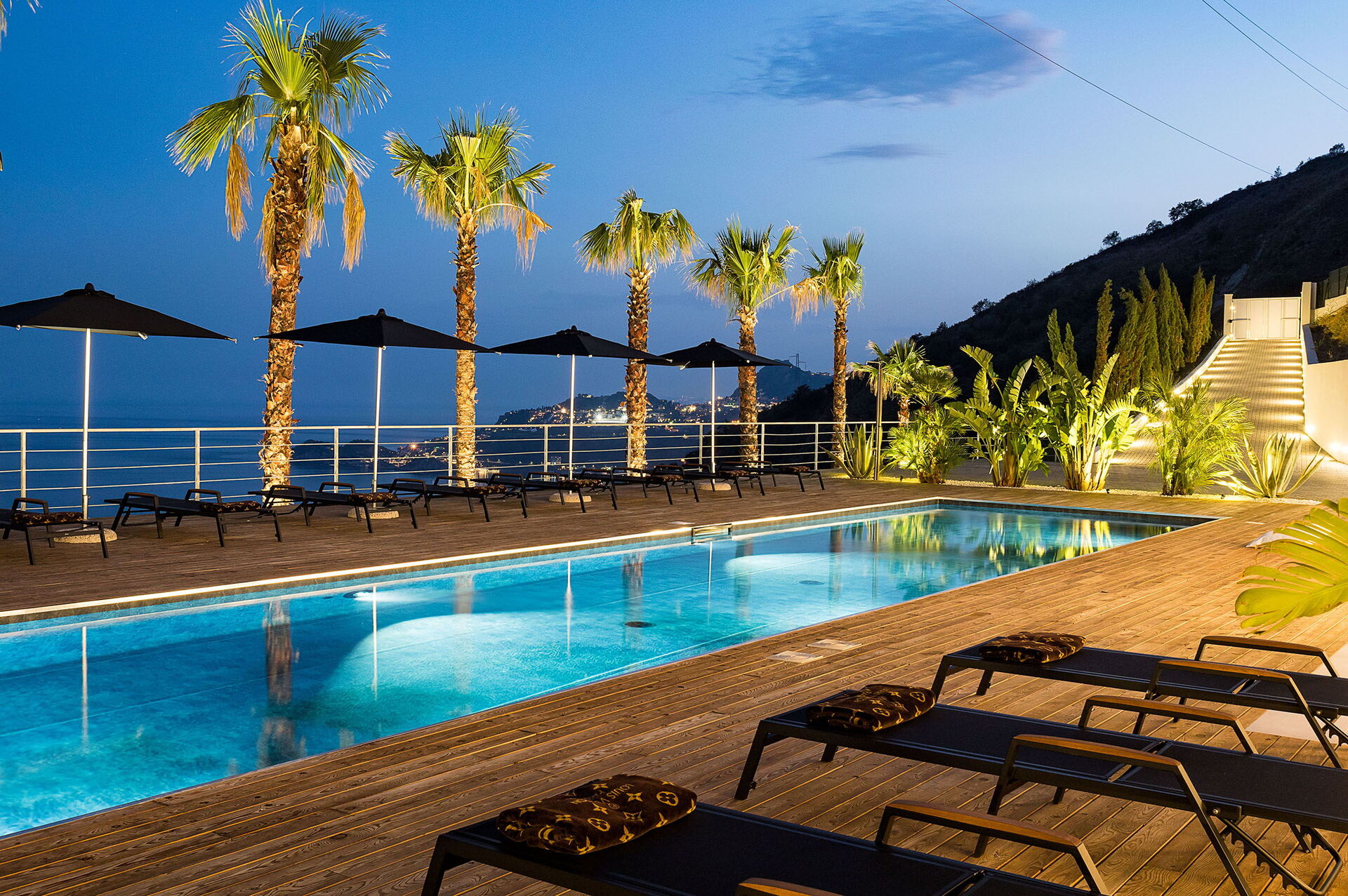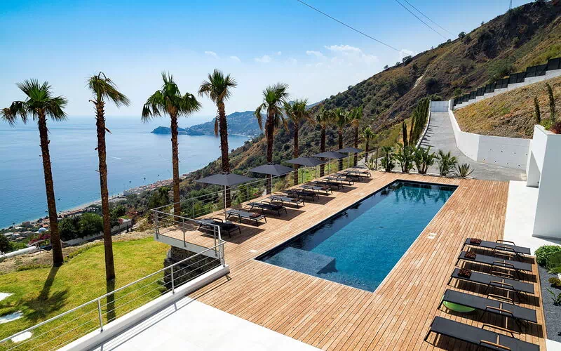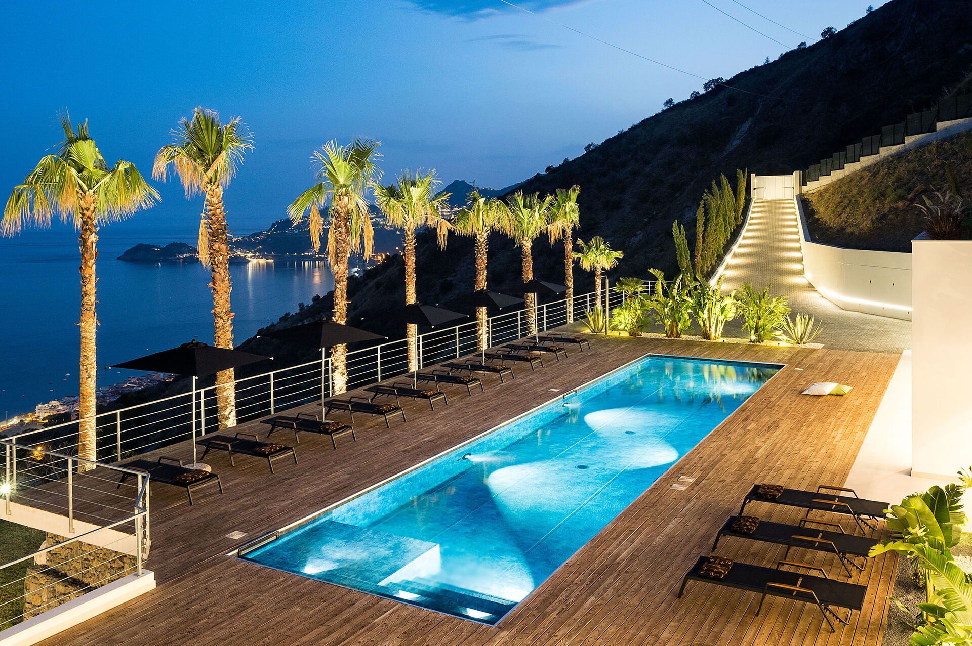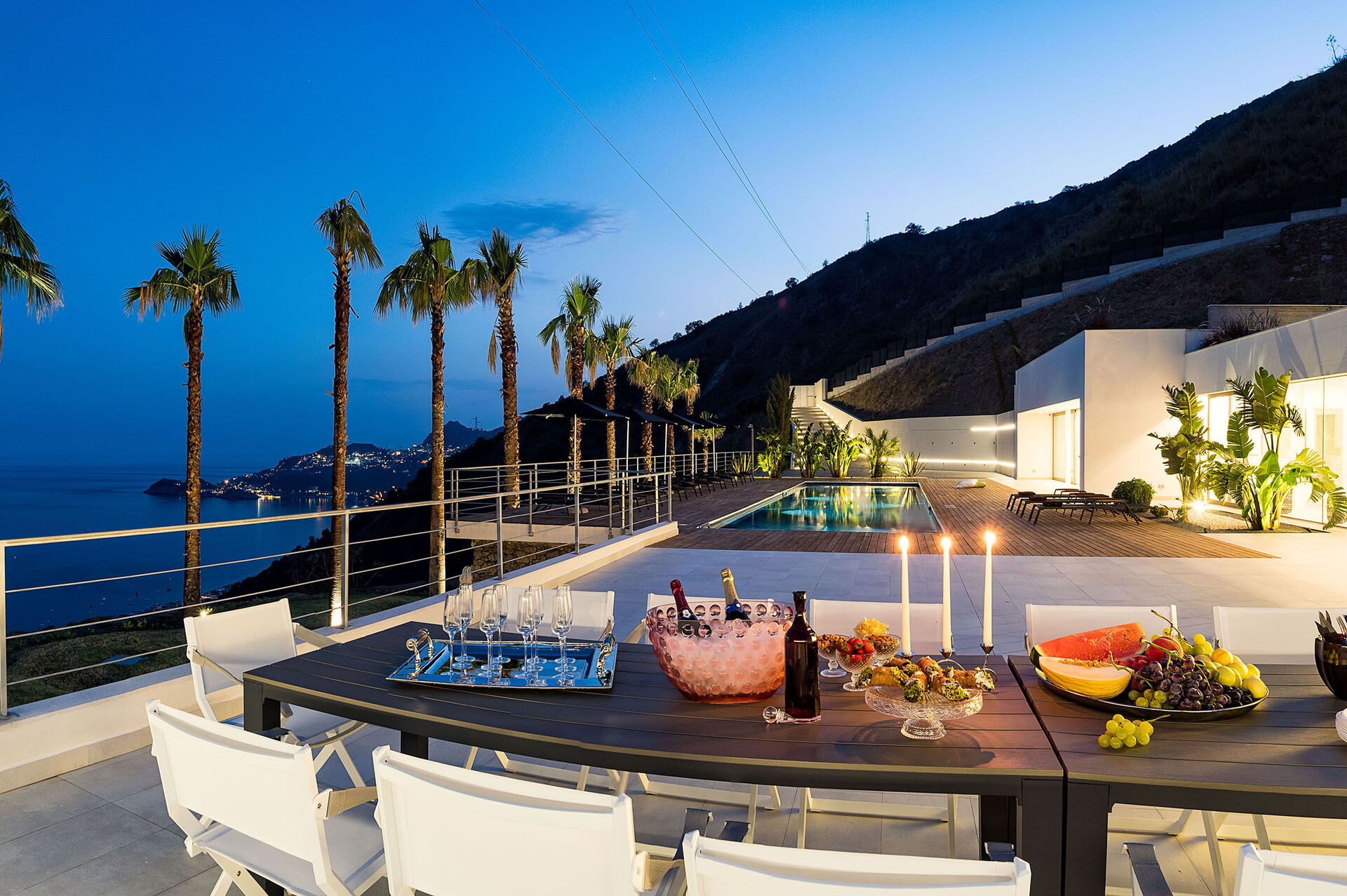 Diese exklusive luxuriöse Ferienvilla befindet sich in spektakulärer Panoramalage mit einem atemberaubenden Blick auf das Meer und die Bucht von Taormina, die sowohl vom Schwimmbad als auch von den großen Terrassen und vom Garten aus bewundert werden kann.