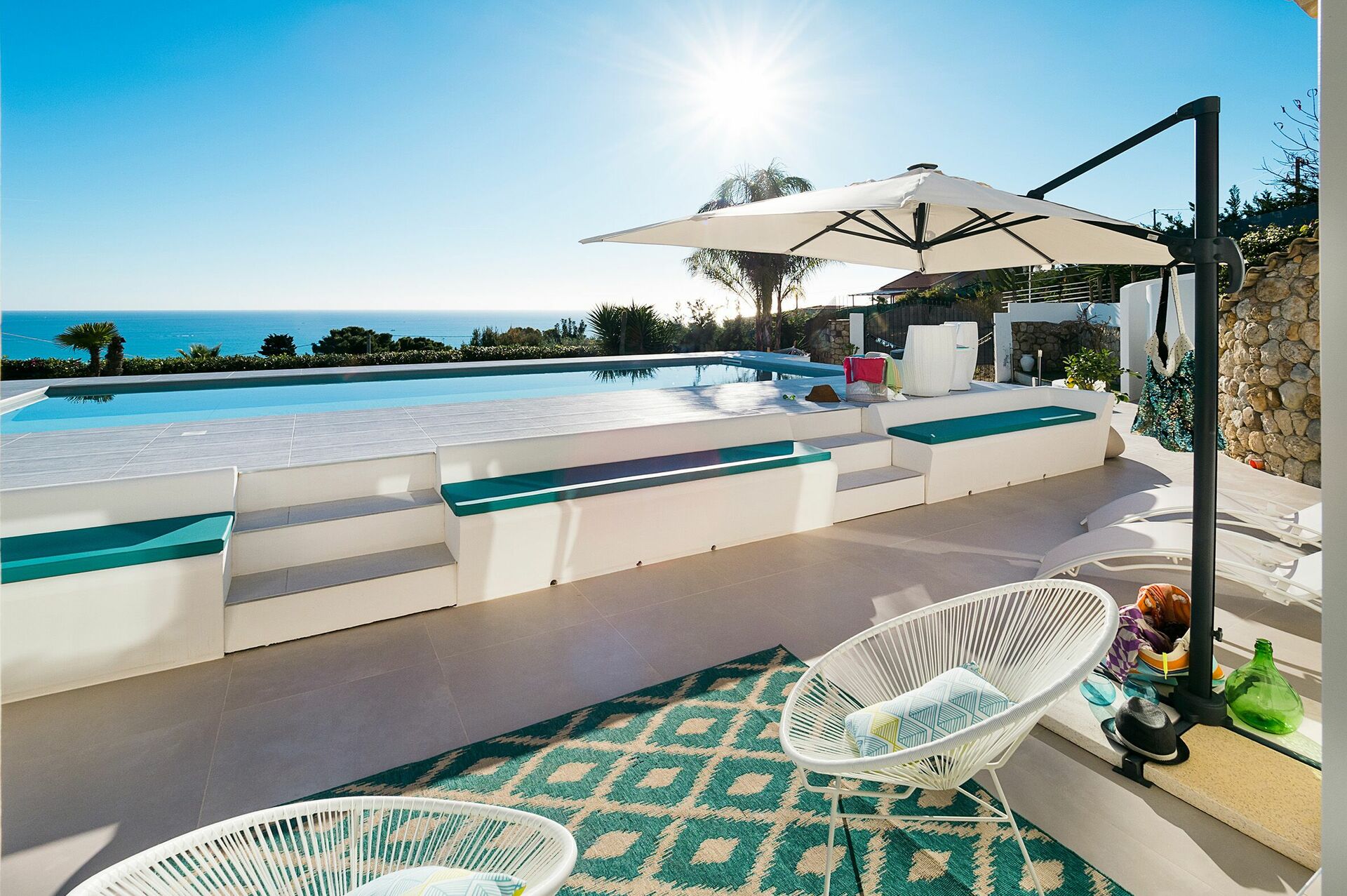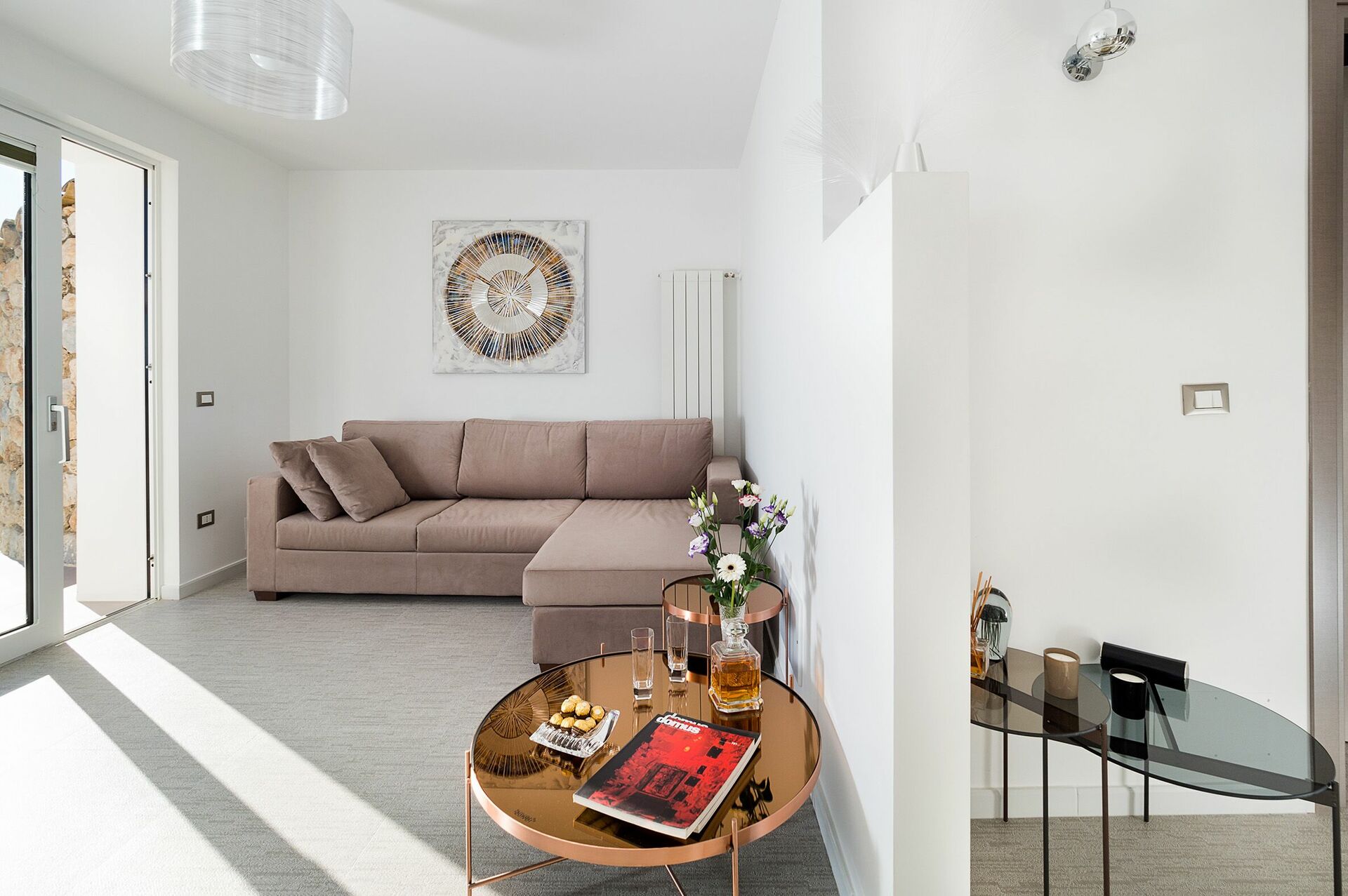 Im Aussenbereich ist die Villa von einem wunderschönen mediterranen Garten voller typischer Pflanzen der Gegend umgeben und verfügt über einen mit Sesseln, Sonnenliegen und Sonnenschirmen ausgestatteten Schwimmbadbereich: der ideale Ort, um sich an heißen Sommertagen in Gesellschaft von Freunden oder der Familie zu entspannen und abzukühlen. Das Schwimmbad steht den Gästen exklusiv zur Verfügung und wird mit Salz gereinigt.