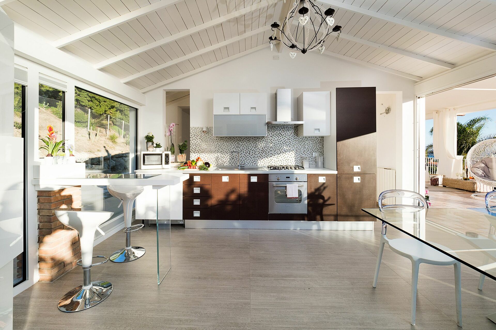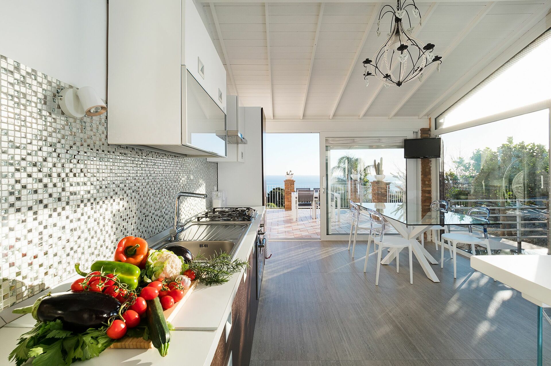 Erdgeschoss: Gut ausgestattete Küche (Geschirrspüler, Backofen, Mikrowelle, Wasserkocher), großes Wohnzimmer mit Kamin, SAT-TV und Stereoanlage. Von diesem Raum aus hat man Zugang zur herrlichen Panoramaterrasse mit Meerblick: ein perfekter Ort, um sich bei Sonnenuntergang zu entspannen und romantische Abendessen zu organisieren, dank der Tische, Stühle und Sessel, mit denen er ausgestattet ist.