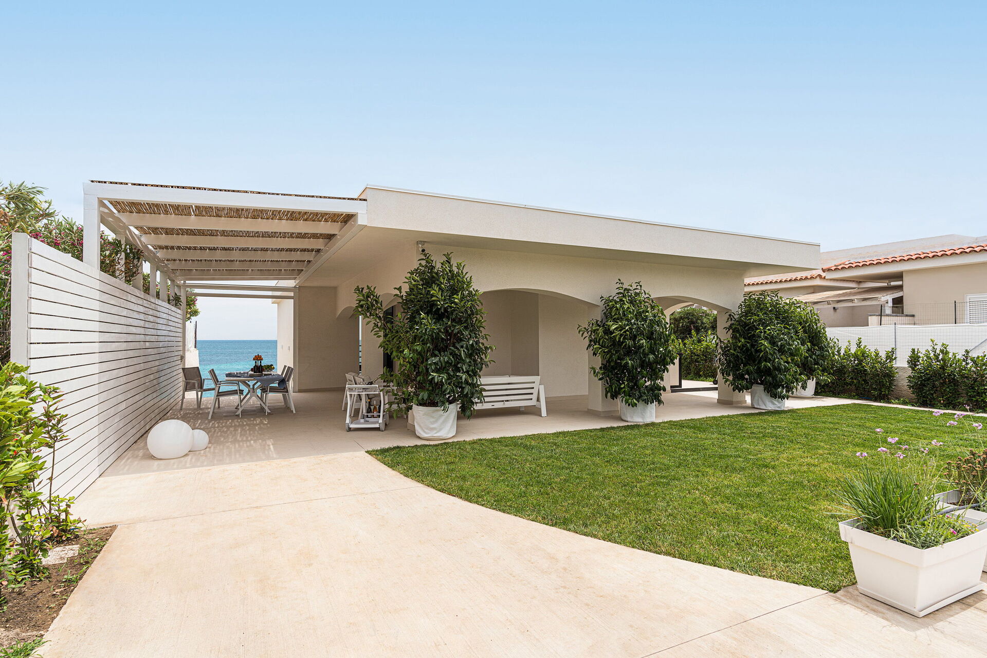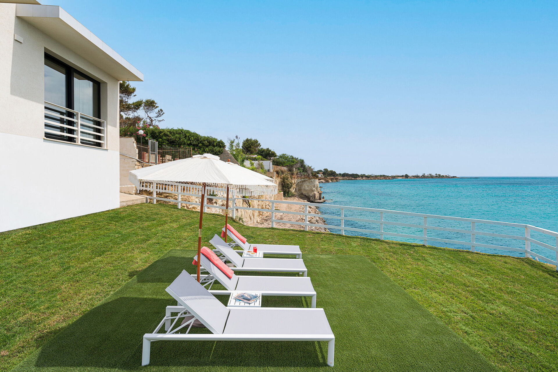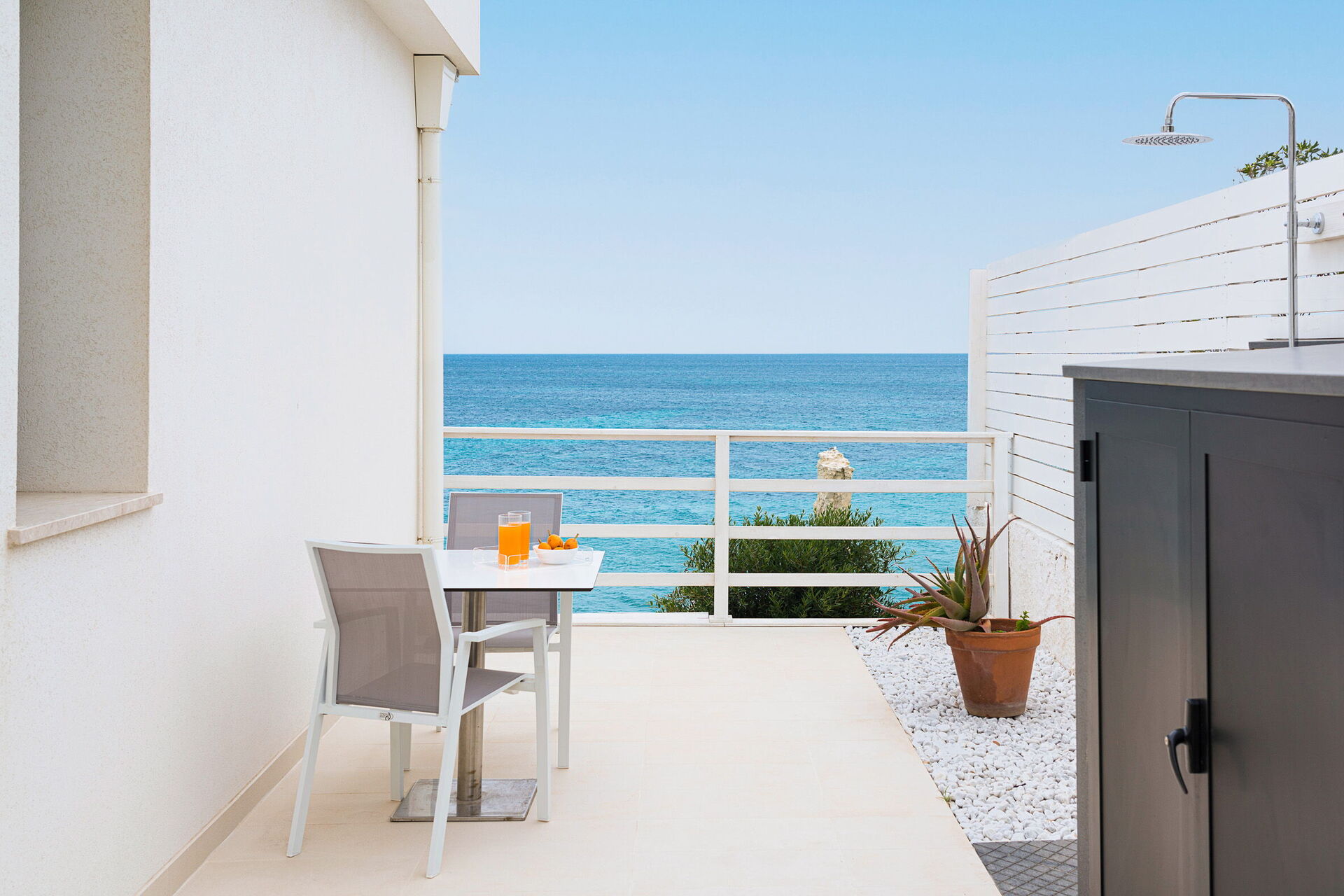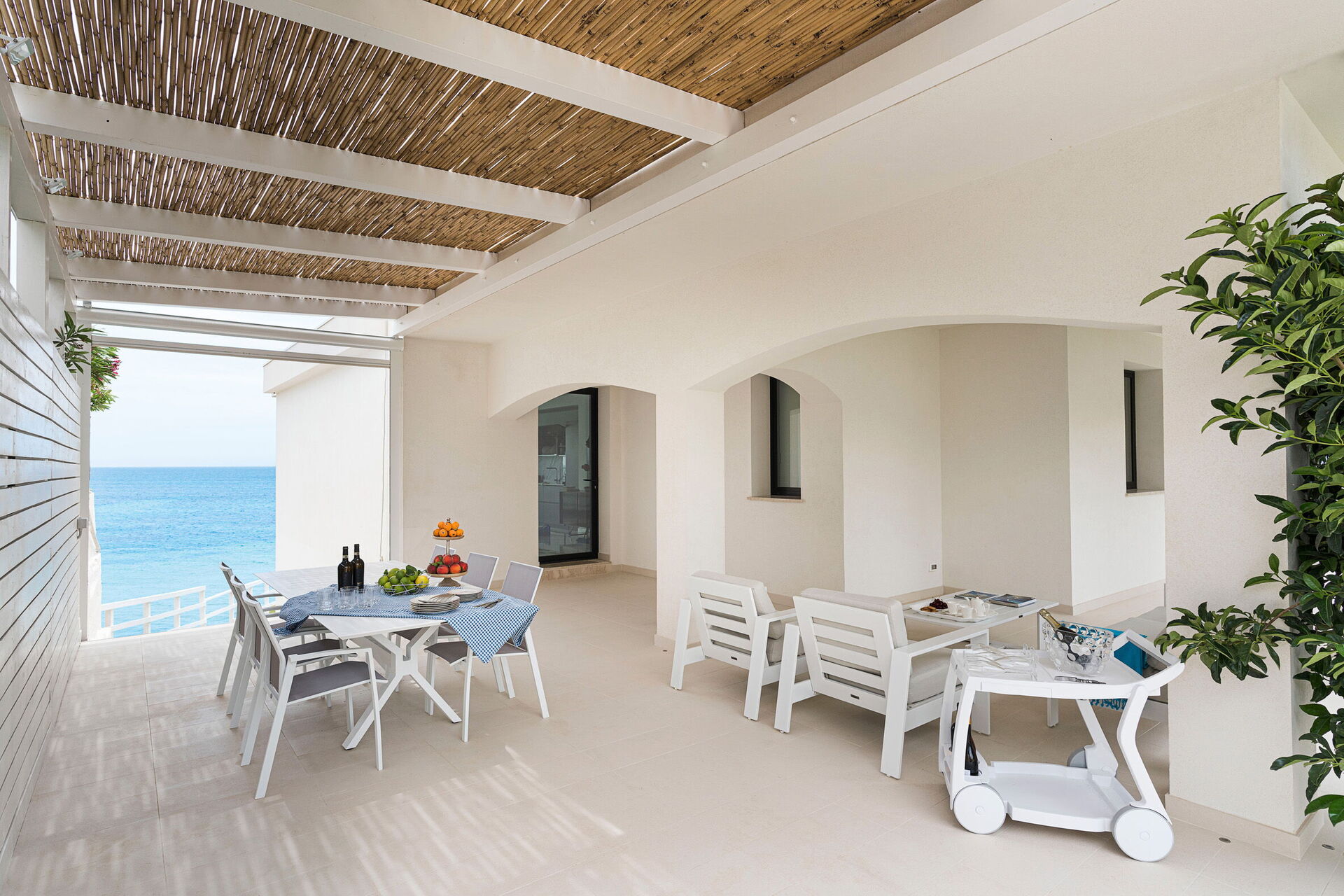 Die Panorama-Außenbereiche bieten zahlreiche Gemeinschaftsbereiche und ermöglichen es den Gästen, einen angenehmen Aufenthalt mit Familie oder Freunden zu verbringen, indem sie sich auf der für Mahlzeiten im Freien ausgestatteten Veranda entspannen oder auf dem großen Solariumbereich mit Blick auf das Meer entspannen, der sich ideal für angenehme Momente unter der Sonne Siziliens eignet. Darüber hinaus haben Sie Zugang zu einer beheizten Hydromassage-Badewanne im Freien und direktem Zugang zur Klippe und zum Meer.