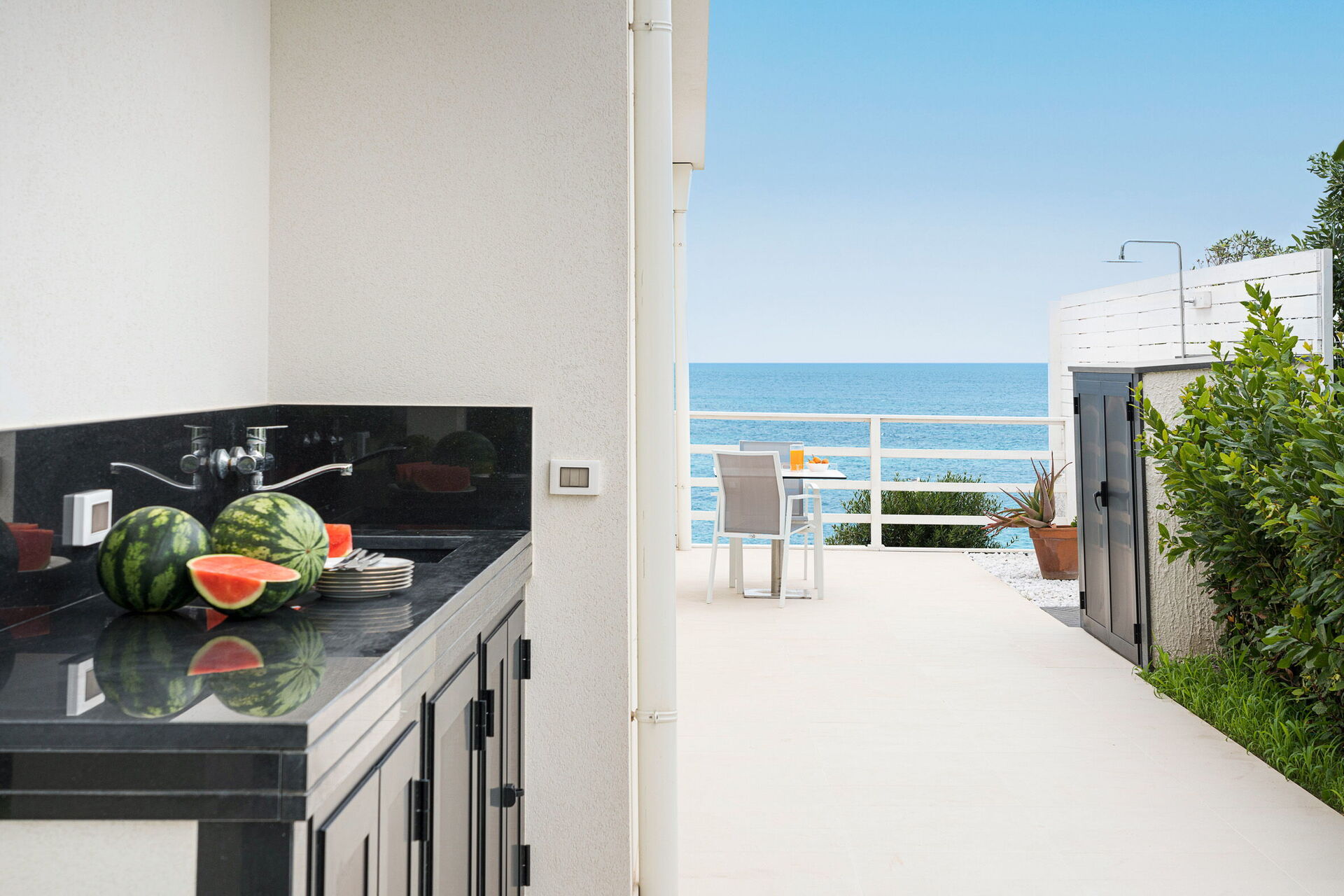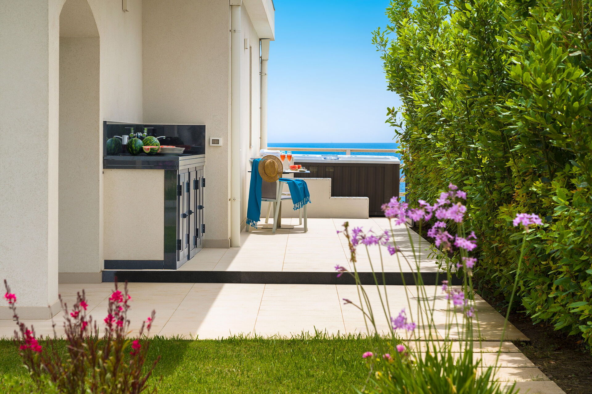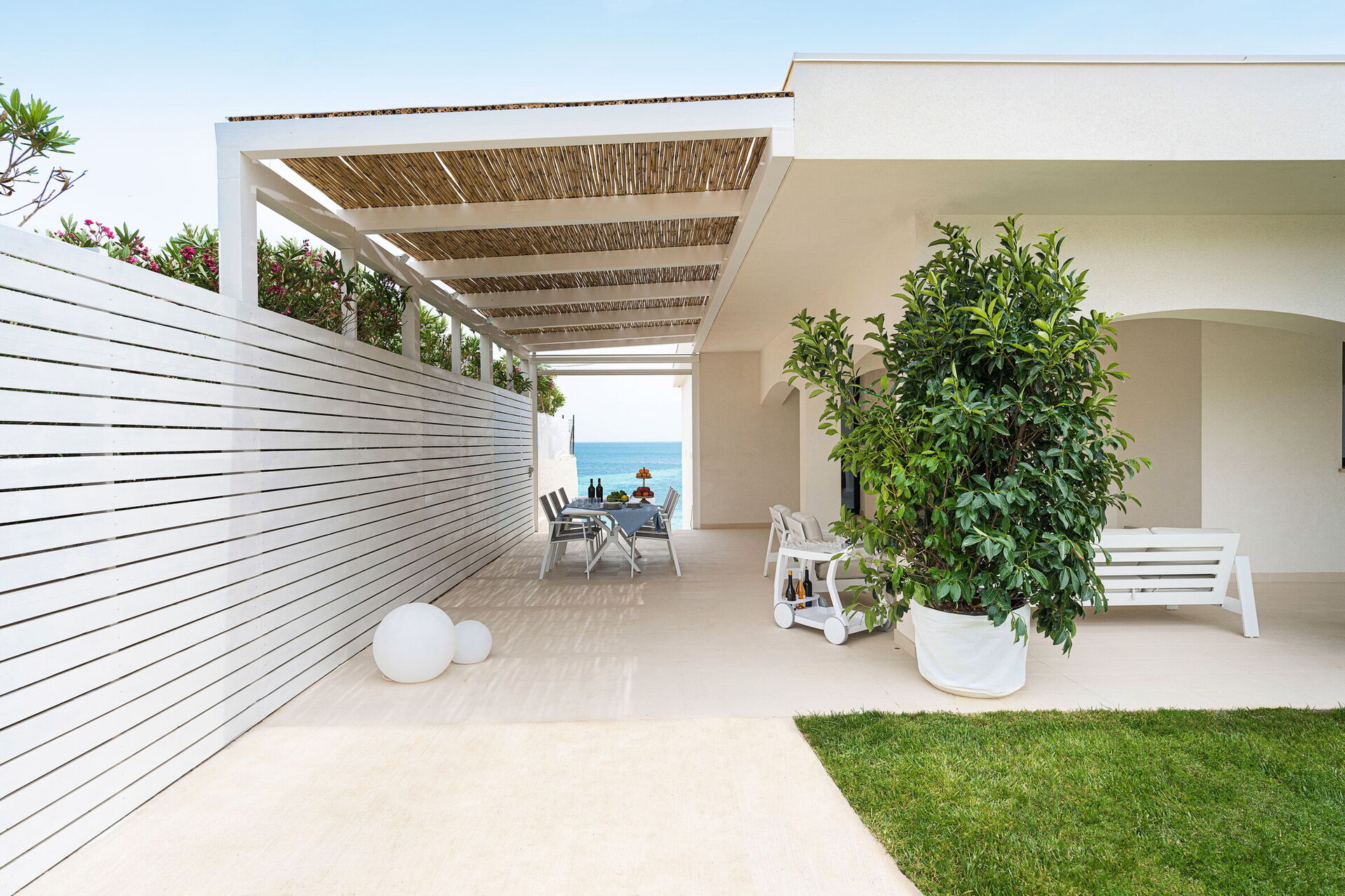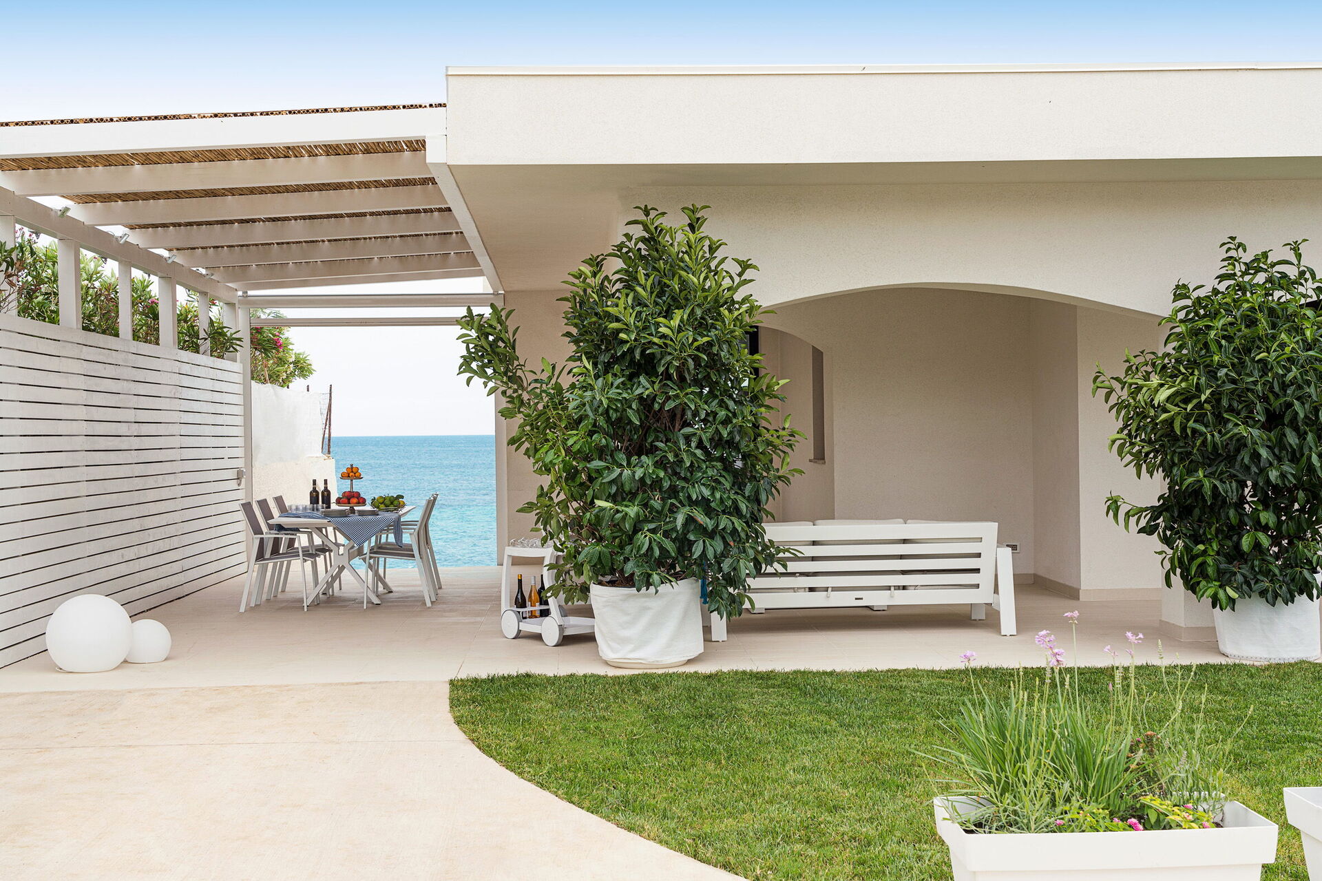 Die Panorama-Außenbereiche bieten zahlreiche Gemeinschaftsbereiche und ermöglichen es den Gästen, einen angenehmen Aufenthalt mit Familie oder Freunden zu verbringen, indem sie sich auf der für Mahlzeiten im Freien ausgestatteten Veranda entspannen oder auf dem großen Solariumbereich mit Blick auf das Meer entspannen, der sich ideal für angenehme Momente unter der Sonne Siziliens eignet. Darüber hinaus haben Sie Zugang zu einer beheizten Hydromassage-Badewanne im Freien und direktem Zugang zur Klippe und zum Meer.