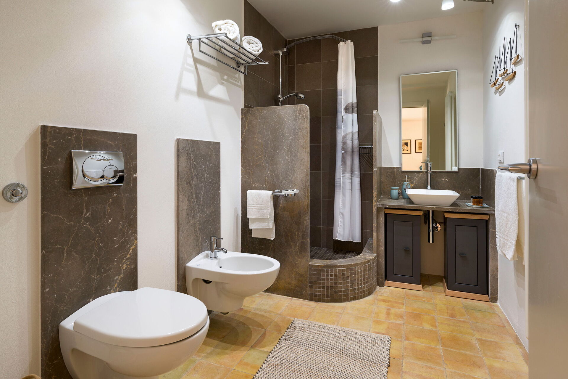 Erster Stock:Wohnzimmer mit Kamin, Küche (Herd, Backofen, Kühlschrank, Gefrierschrank, Geschirrspüler, Mikrowelle, Toaster, Espressomaschine, amerikanische Kaffeemaschine) mit Essbereich, Zugang zur Terrasse, 2 Doppelzimmer (Klimaanlage) mit privatem Bad mit Dusche, 1 WC.
