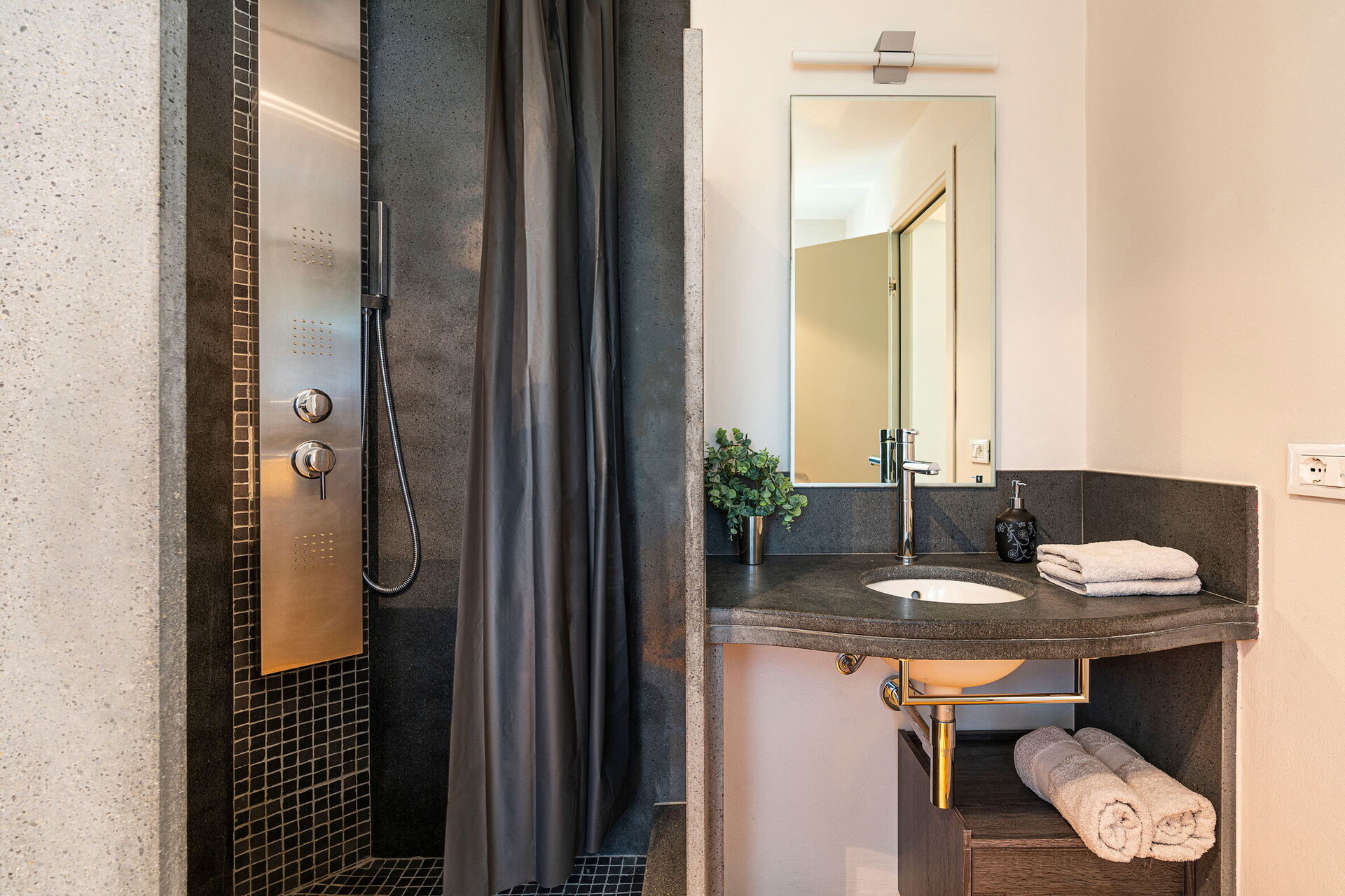 Erdgeschoss (von außen zugänglich): offener Raum mit Doppelbett (Klimaanlage), Einzelschlafcouch und Kochnische (Herd, Kühlschrank) und Badezimmer mit Dusche;