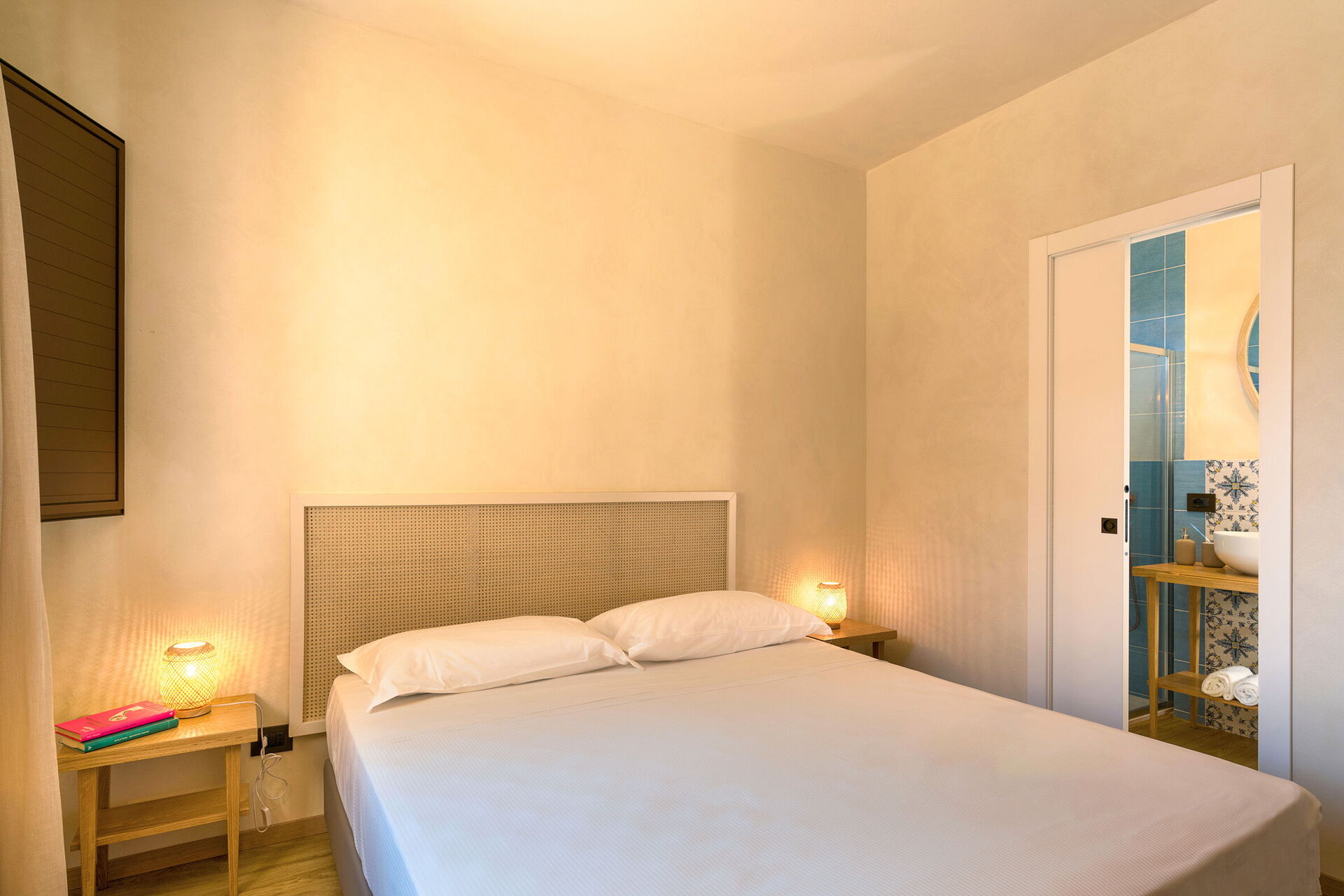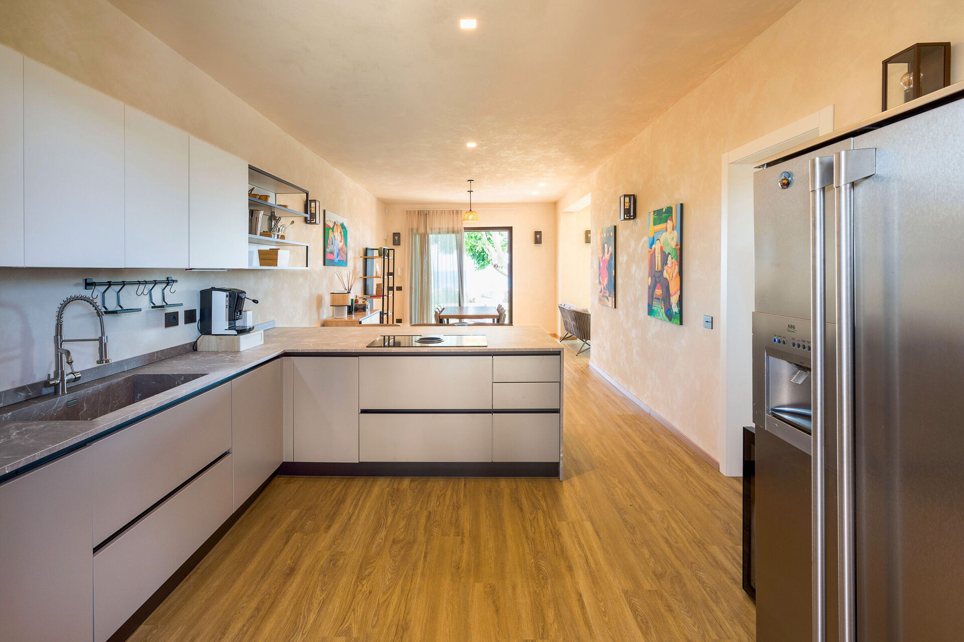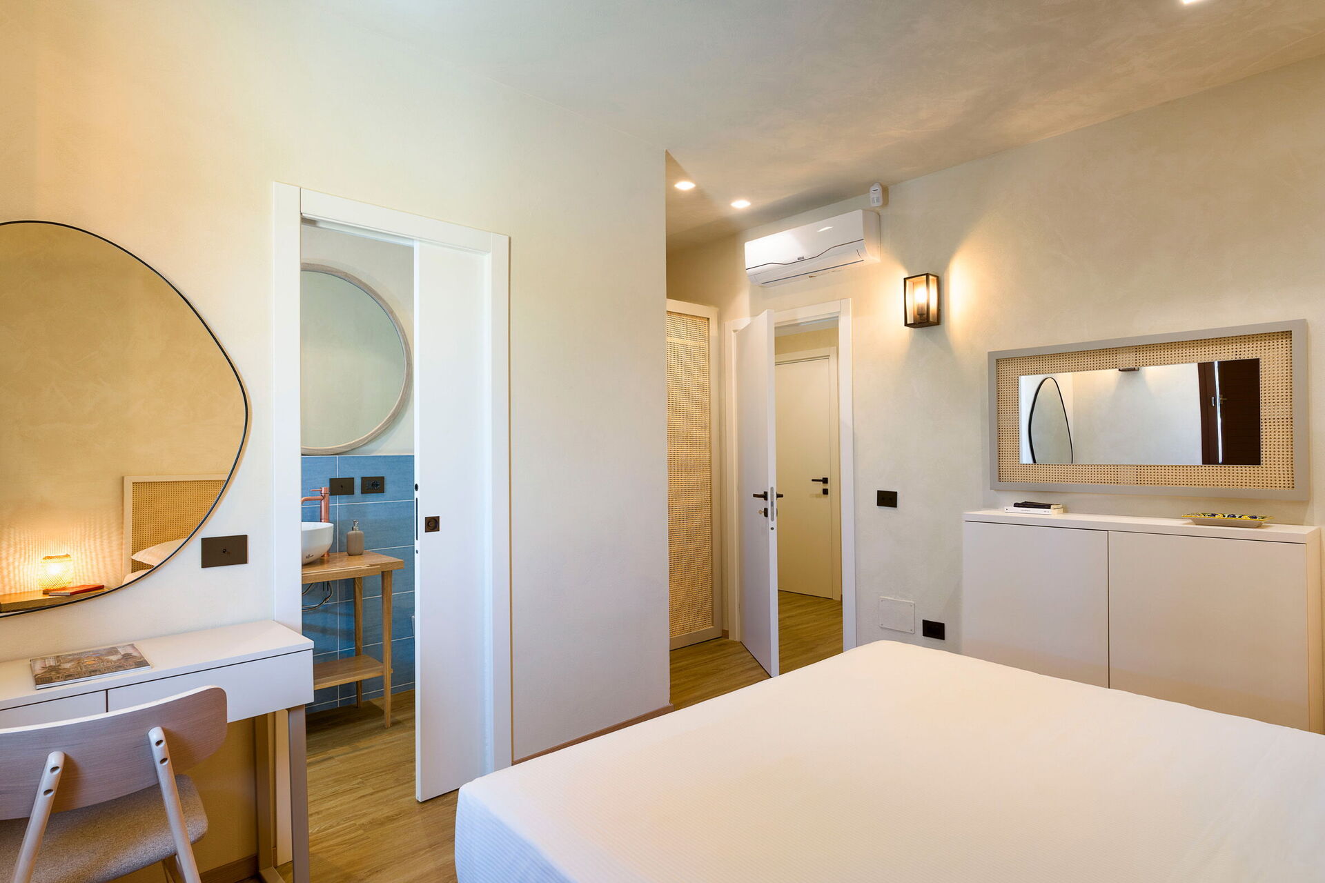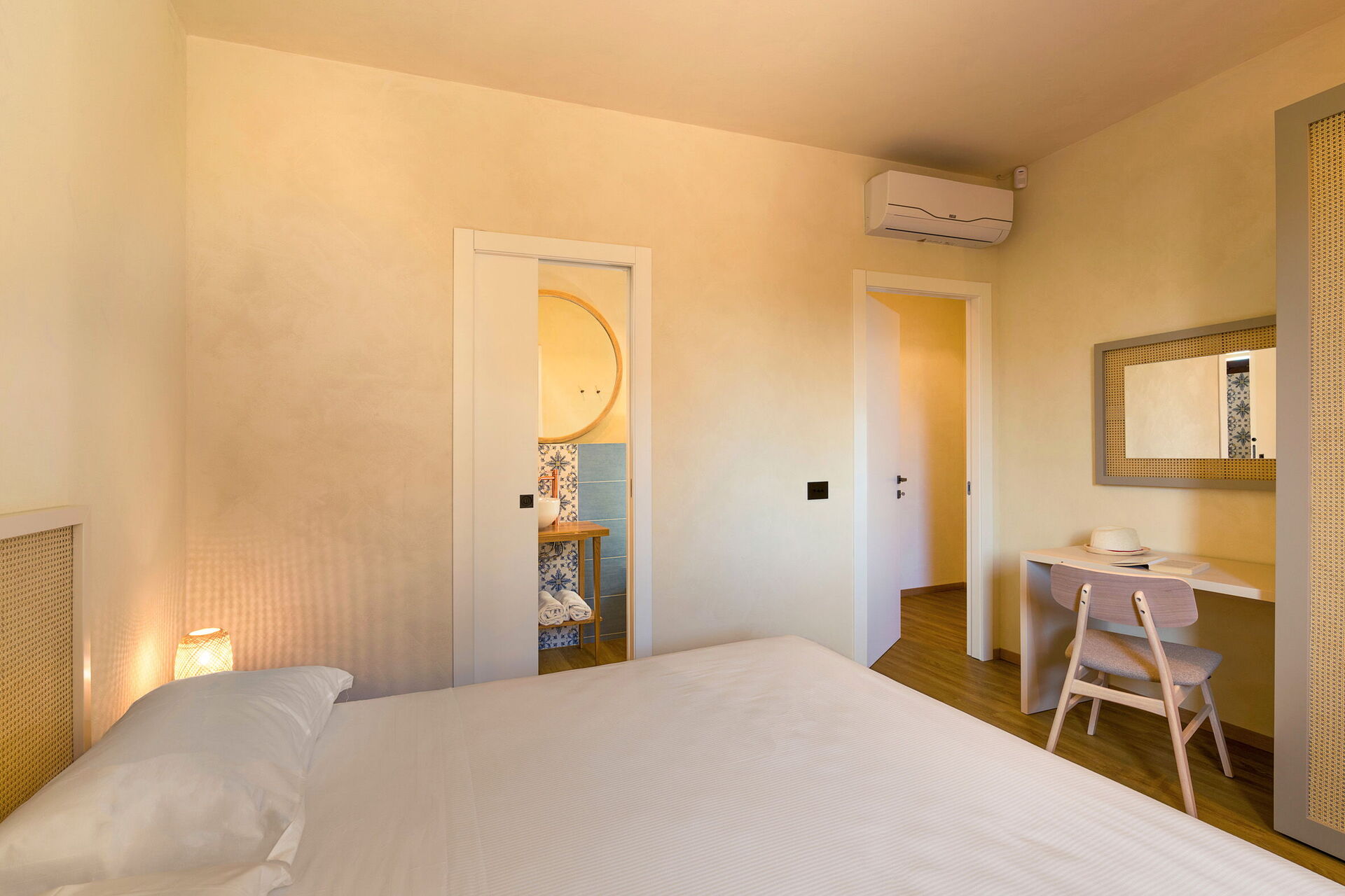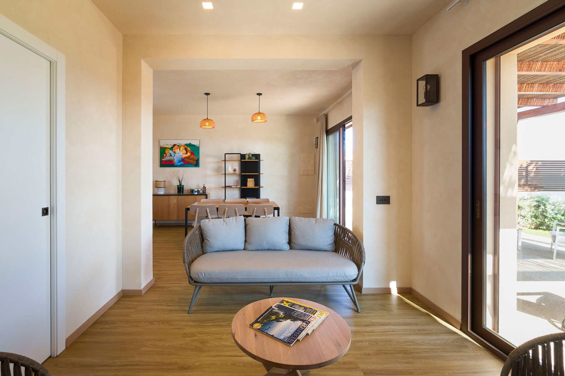 Das Anwesen besteht aus der Hauptvilla (2 Personen) und einem Nebengebäude (6 Personen), das nur wenige Meter von der Villa entfernt liegt. Insgesamt bietet die Unterkunft, dank seiner 4 Schlafzimmer und Gemeinschaftsräume bequem Platz für bis zu 8 Personen. Die Innenräume sind einladend, hell und zeichnen sich durch moderne und schlichte Möbel aus.