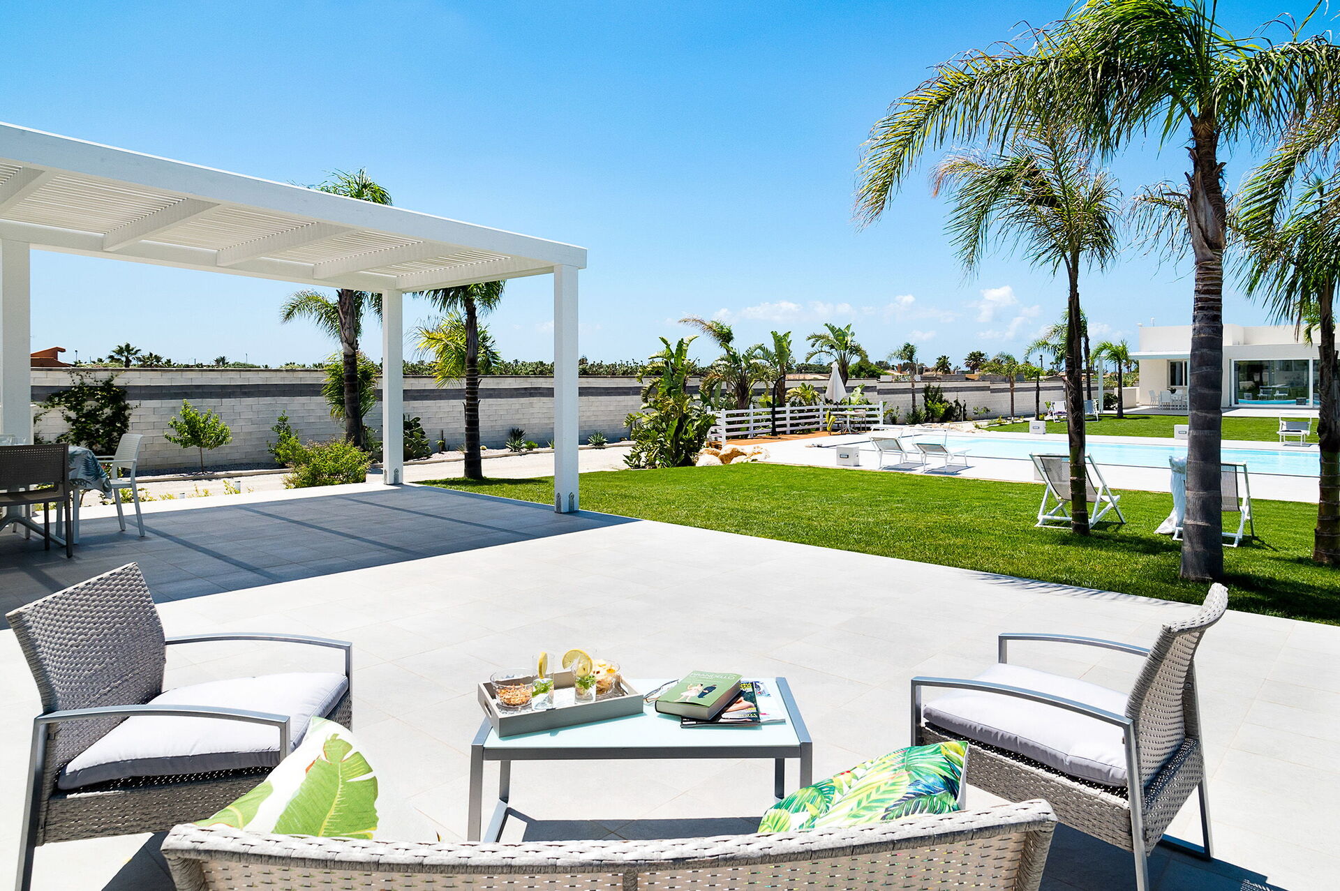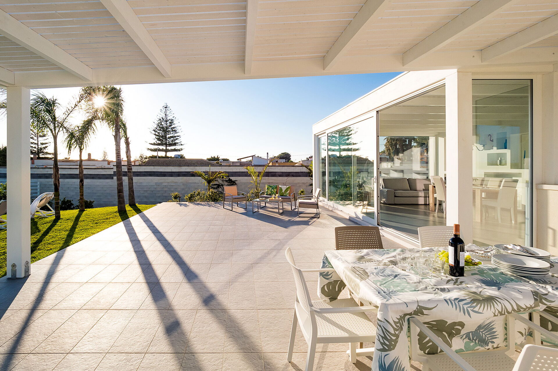 Eine veranda im Außenbereich lädt zum gemeinsamen Essen im Freien ein. Zusammen mit den weiteren Außenbereichen garantieren sie entspannte Momente und schaffen Urlaubserlebnisse, die Sizilien unverwechselbar machen.