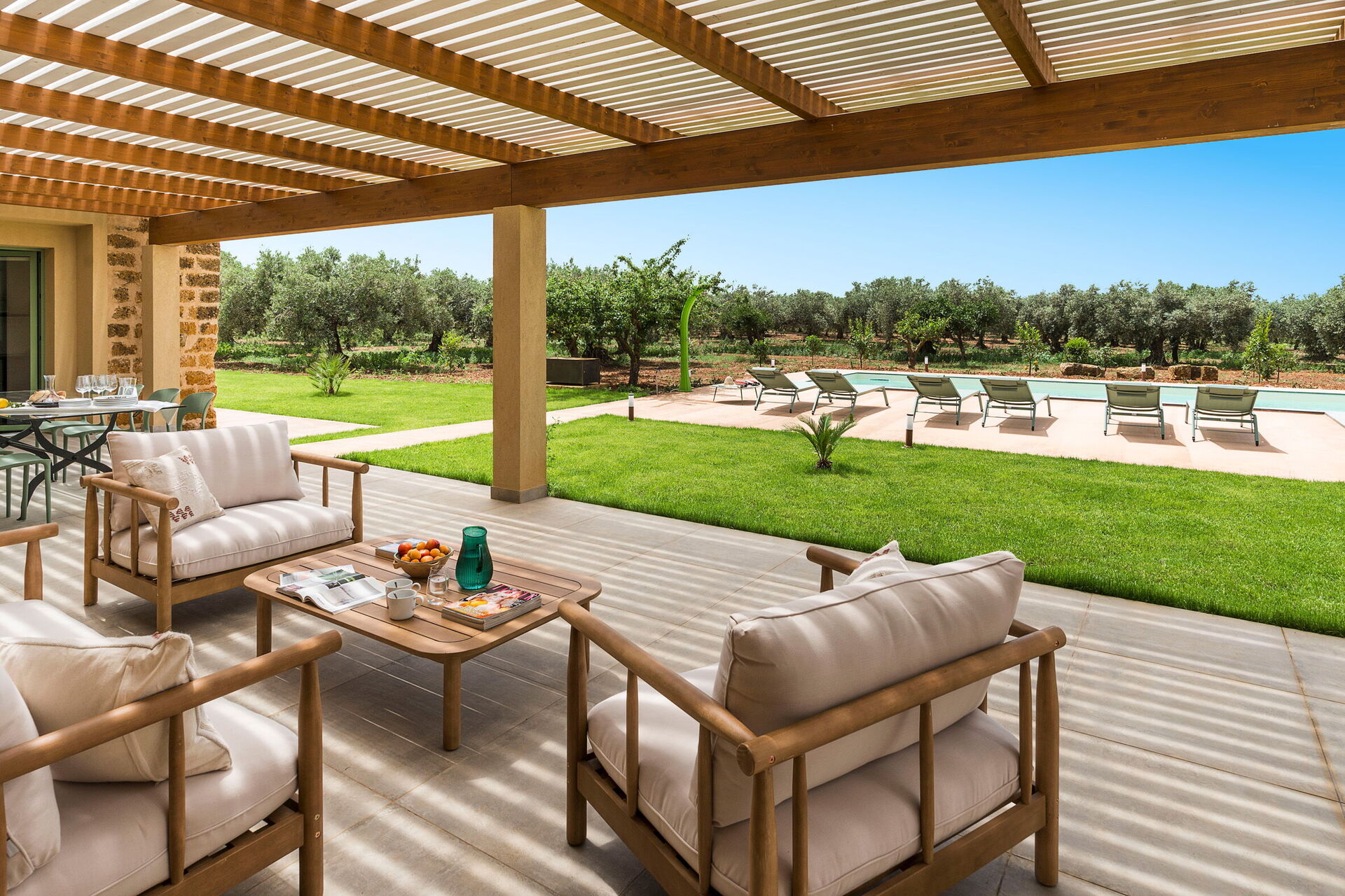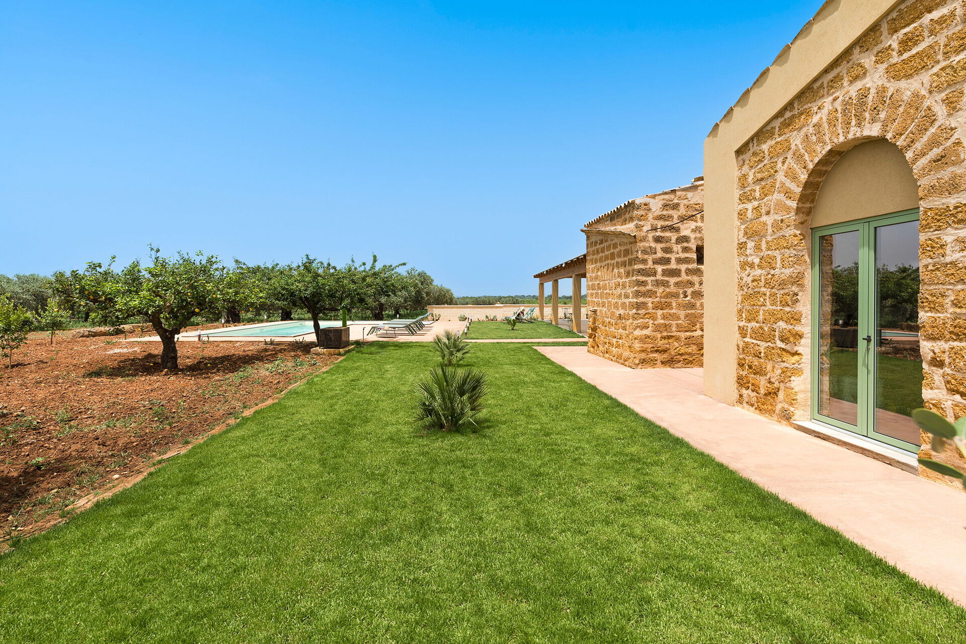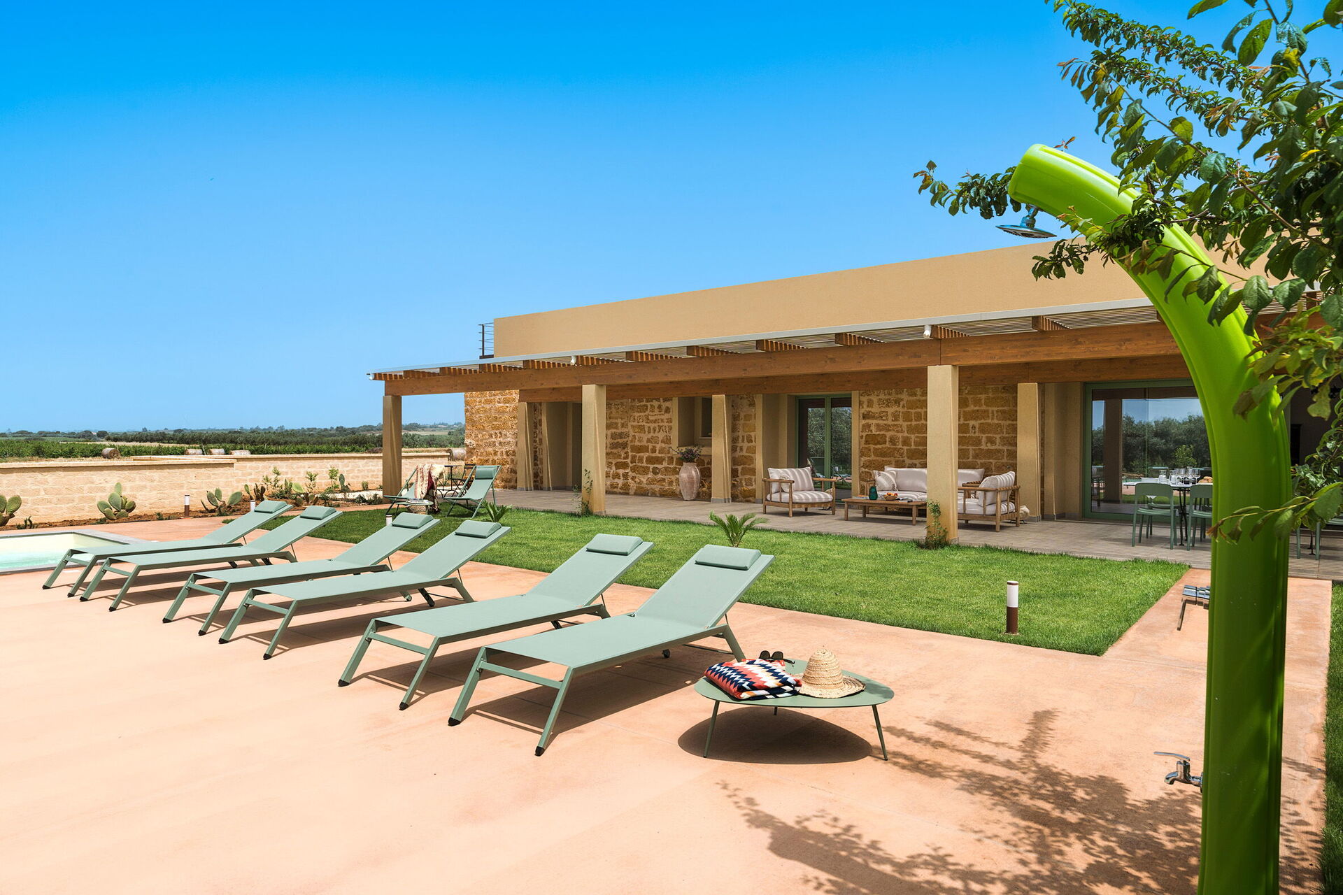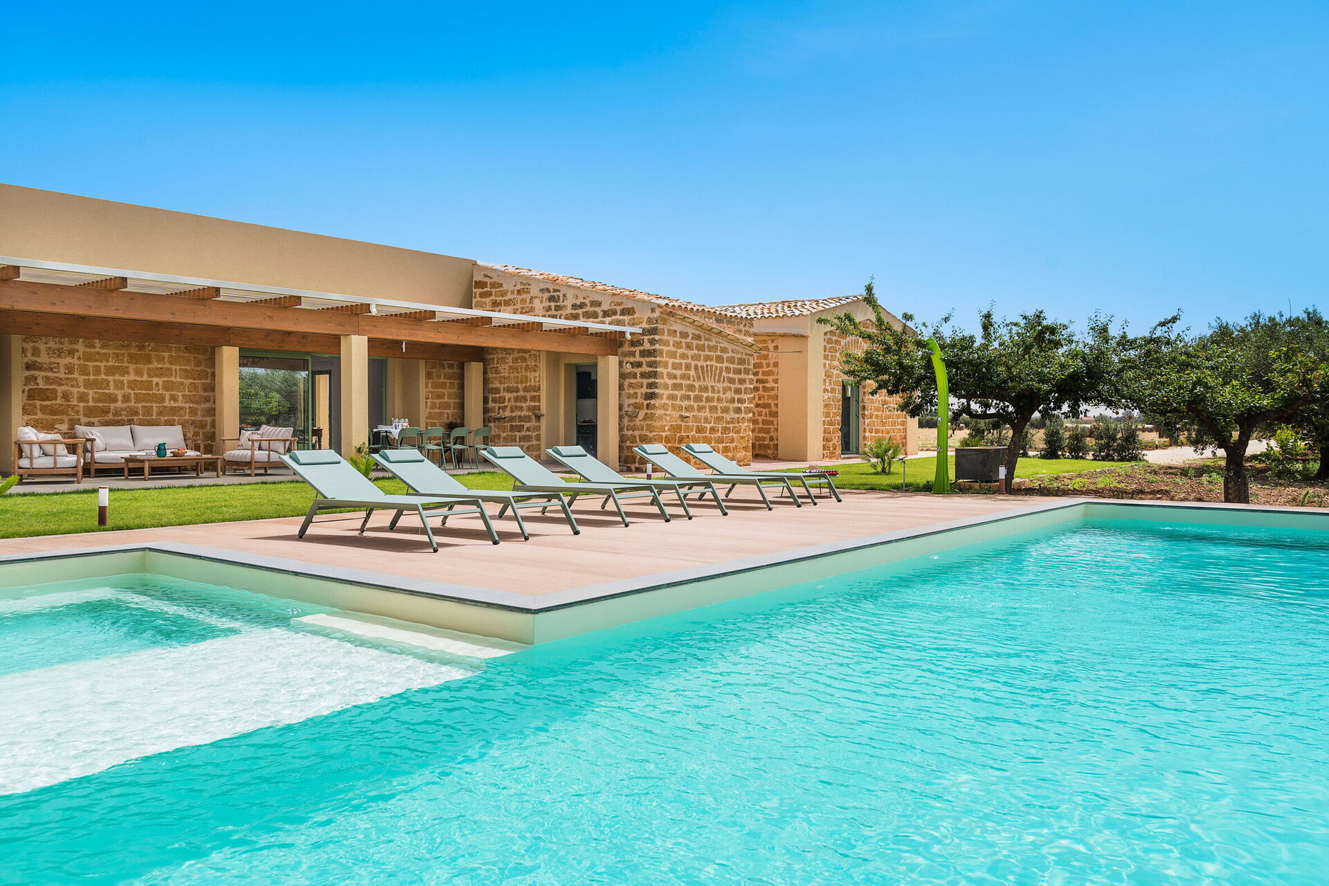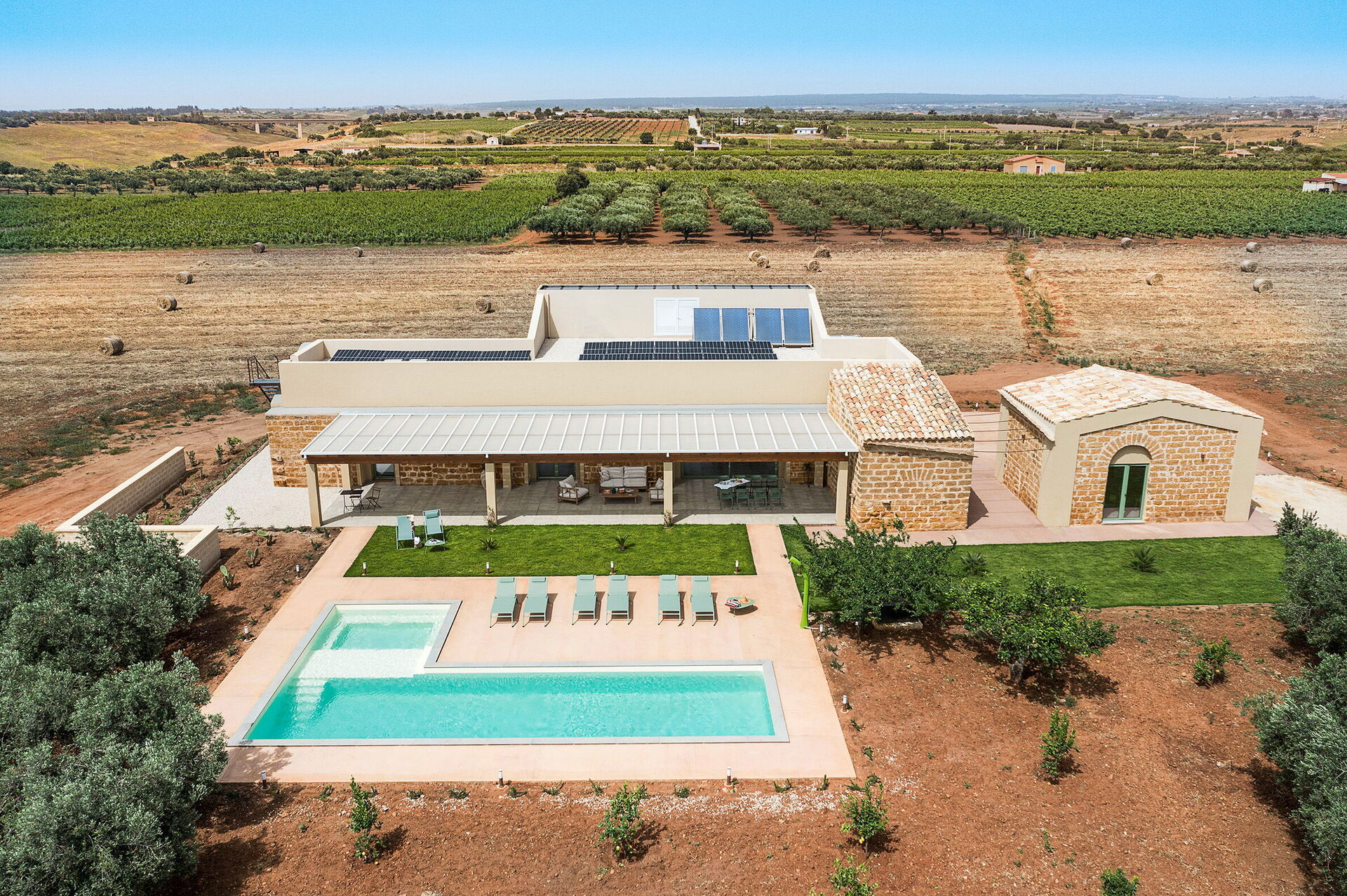 Im Außenbereich befindet sich ein großes Schwimmbad mit Hydromassage-Ecke und Salzreinigungssystem, ausgestattet mit einer großen Sonnenterrasse mit Sonnenliegen: der ideale Ort, um sich an sonnigen Sommertagen zu entspannen und zu erfrischen und die Ruhe und Stille der Landschaft un die wundervollen Sonnenuntergänge zu genießen.