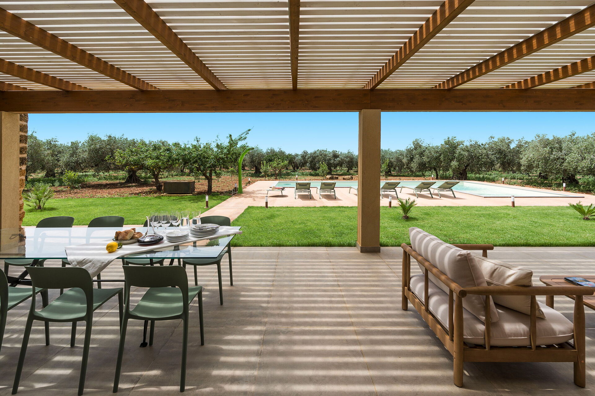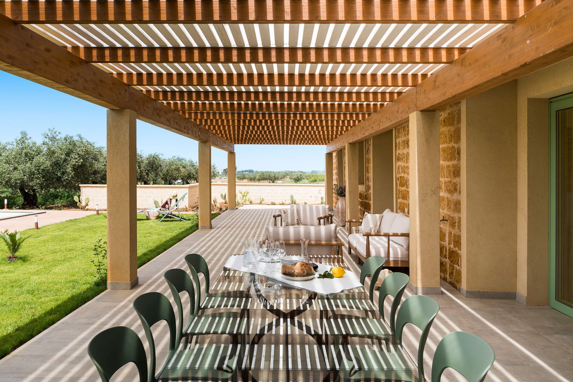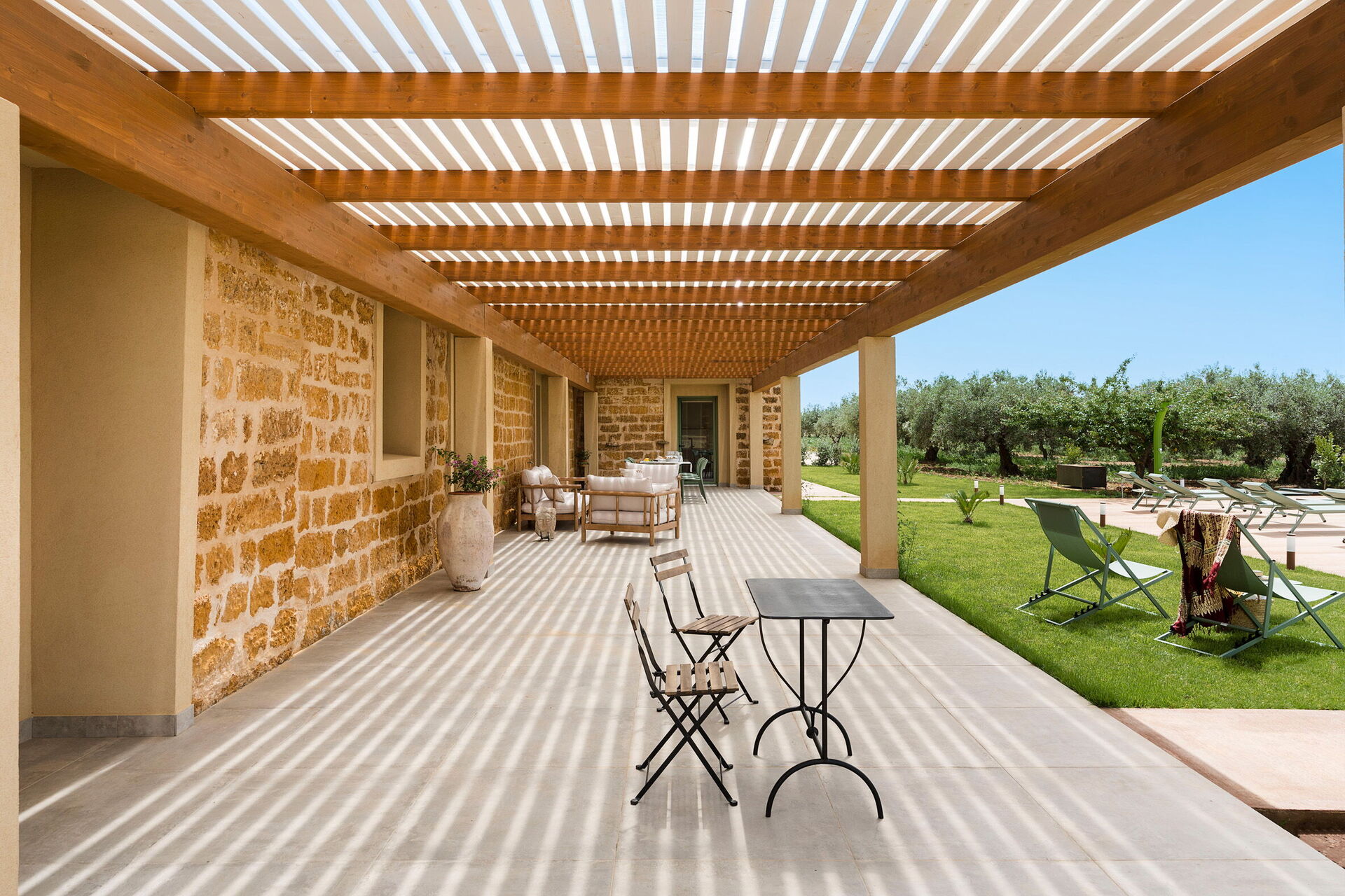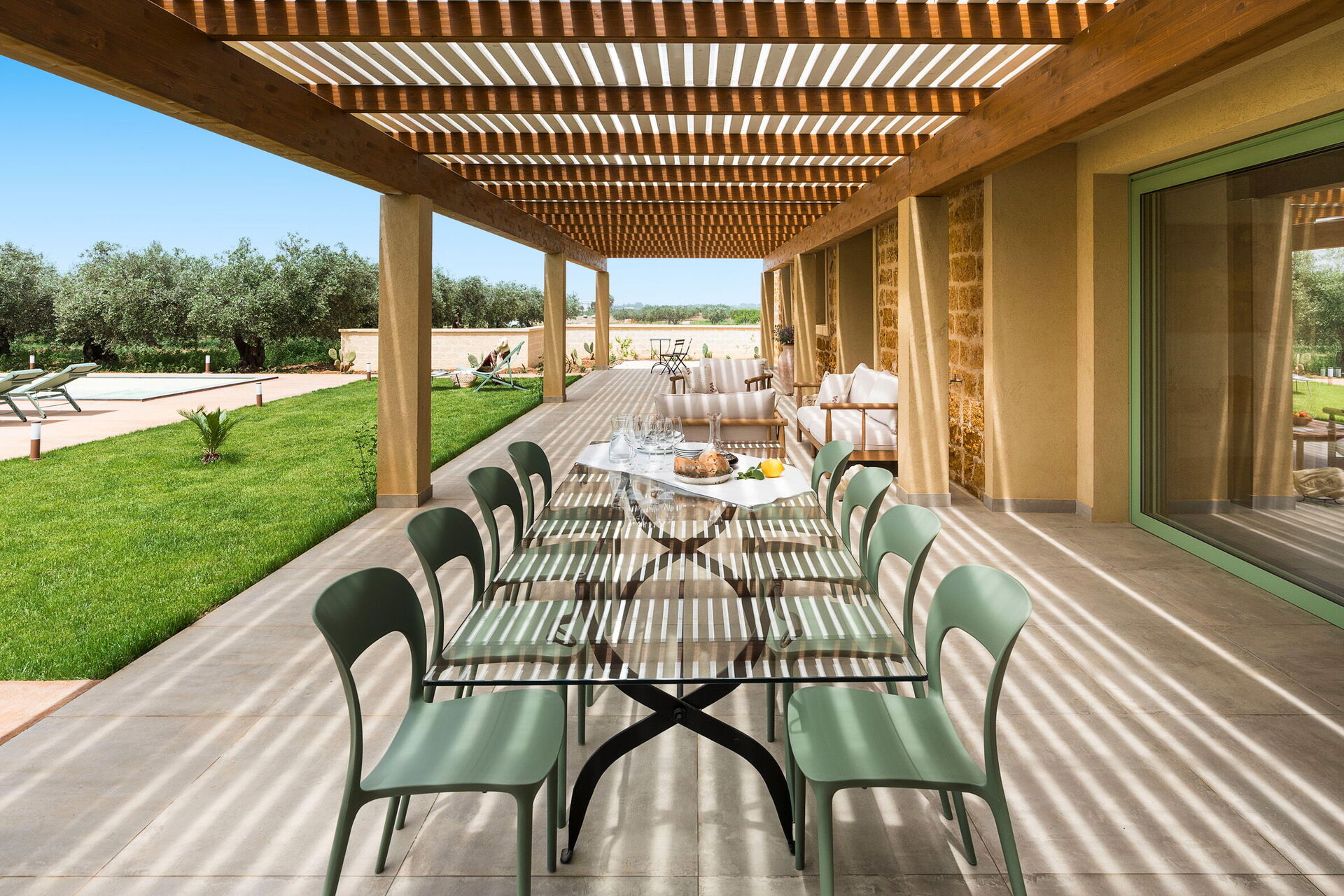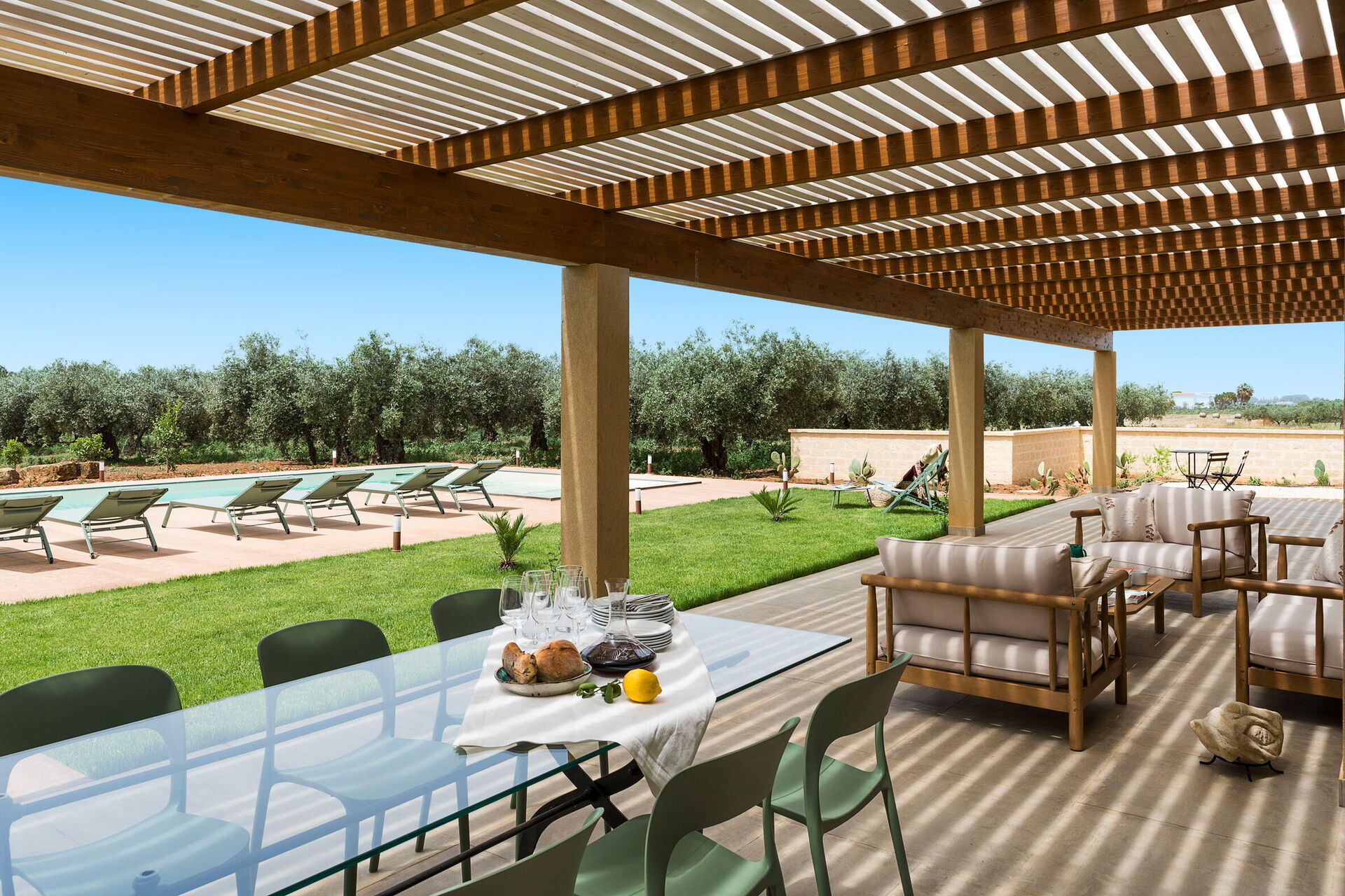 Im Außenbereich befindet sich ein großes Schwimmbad mit Hydromassage-Ecke und Salzreinigungssystem, ausgestattet mit einer großen Sonnenterrasse mit Sonnenliegen: der ideale Ort, um sich an sonnigen Sommertagen zu entspannen und zu erfrischen und die Ruhe und Stille der Landschaft un die wundervollen Sonnenuntergänge zu genießen.