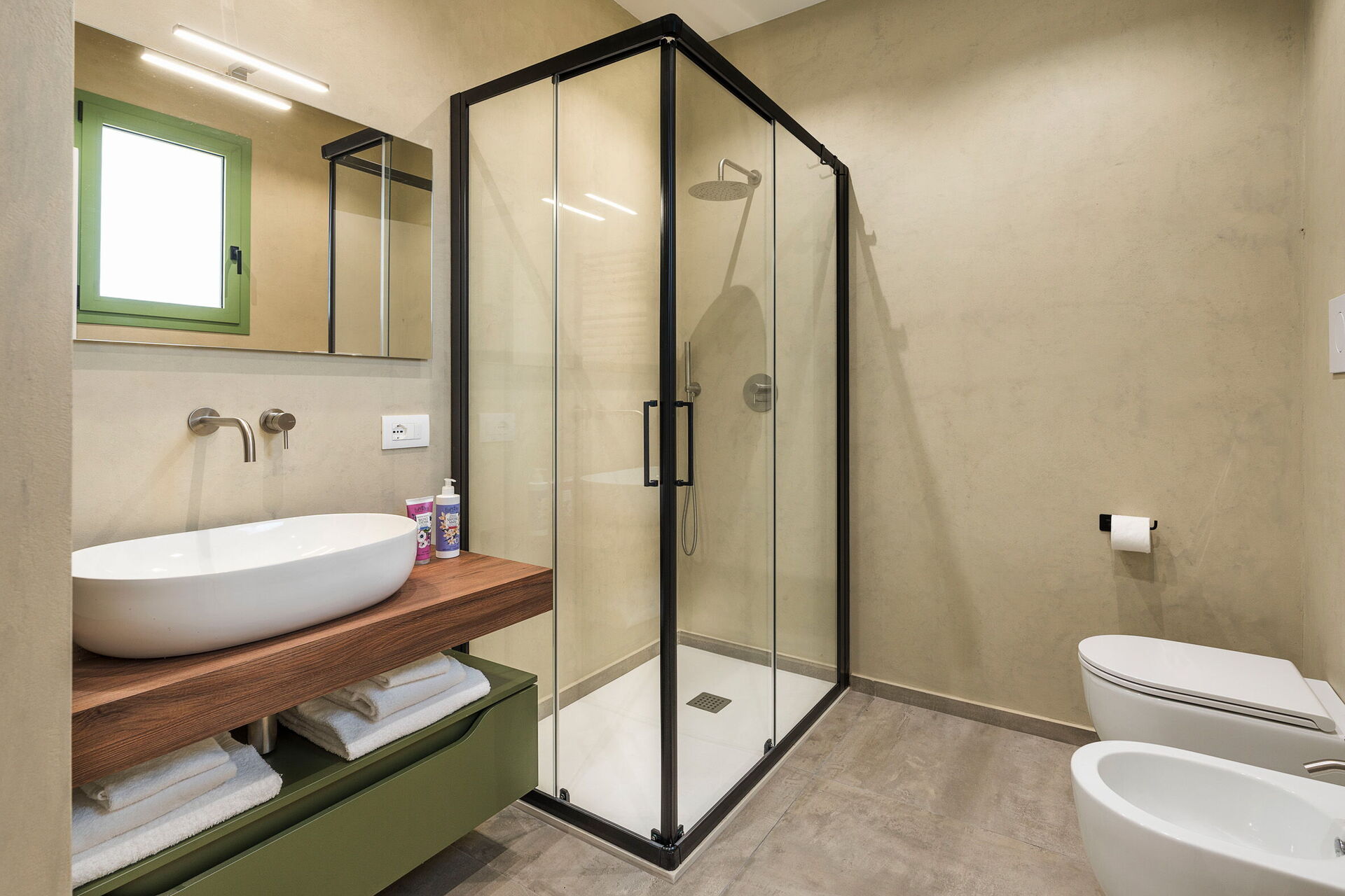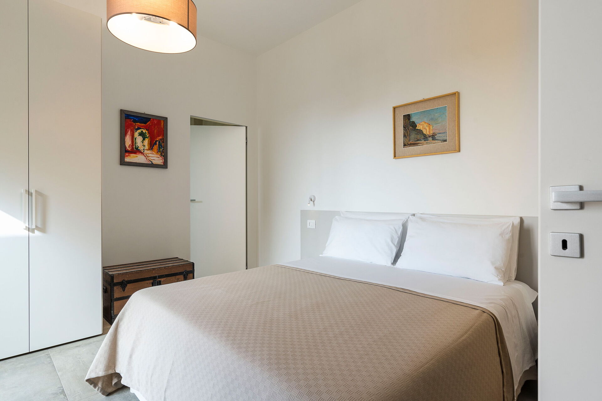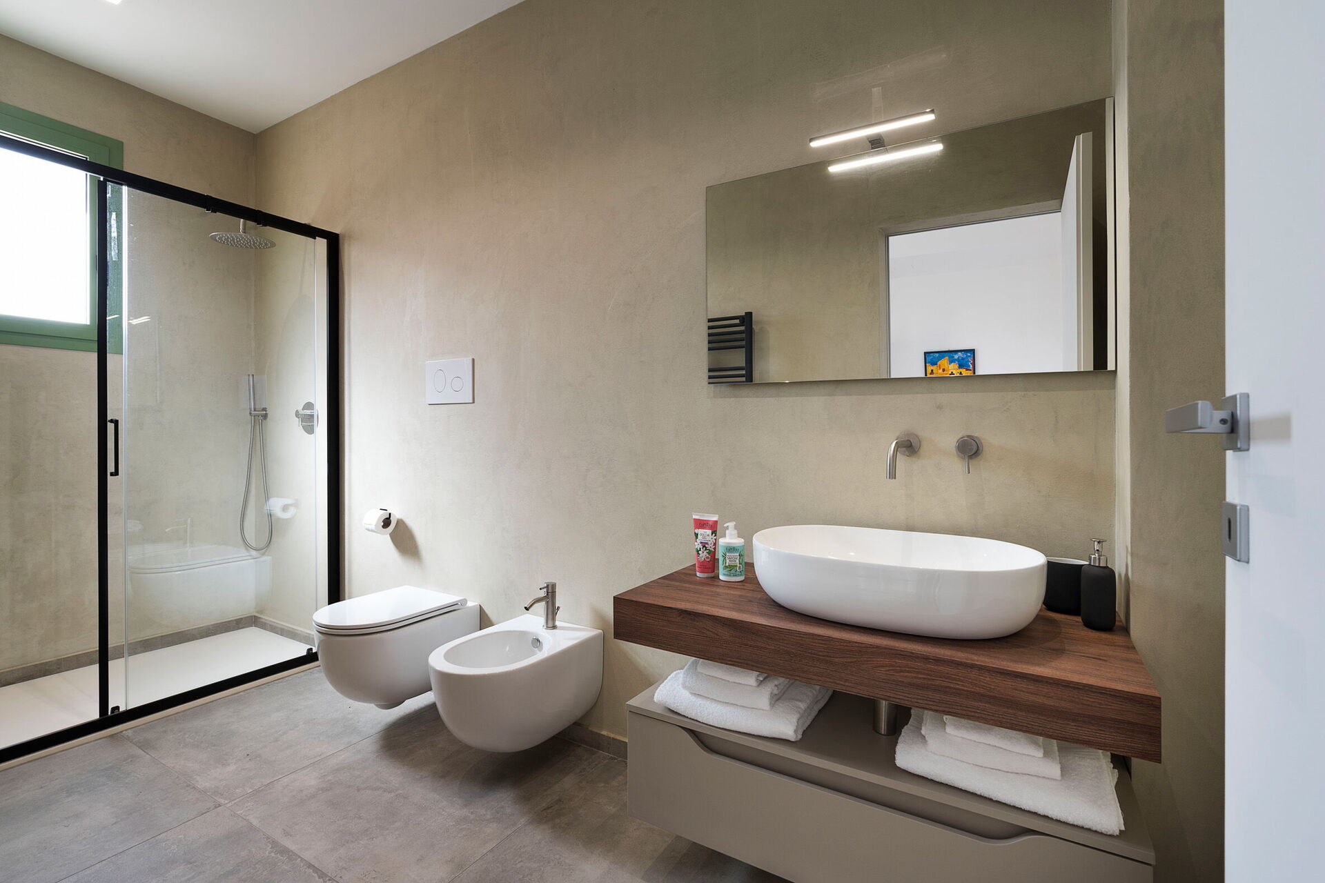 Erdgeschoss: Wohnzimmer (Klimaanlage, TV) mit Essbereich und Küche (Herd, Backofen, Kühlschrank, Gefrierschrank, Geschirrspüler, Mikrowelle, Toaster, Espressomaschine, amerikanische Kaffeemaschine), Toilette, 3 Doppelzimmer (Klimaanlage), jeweils mit privatem Bad mit Dusche. Dependance