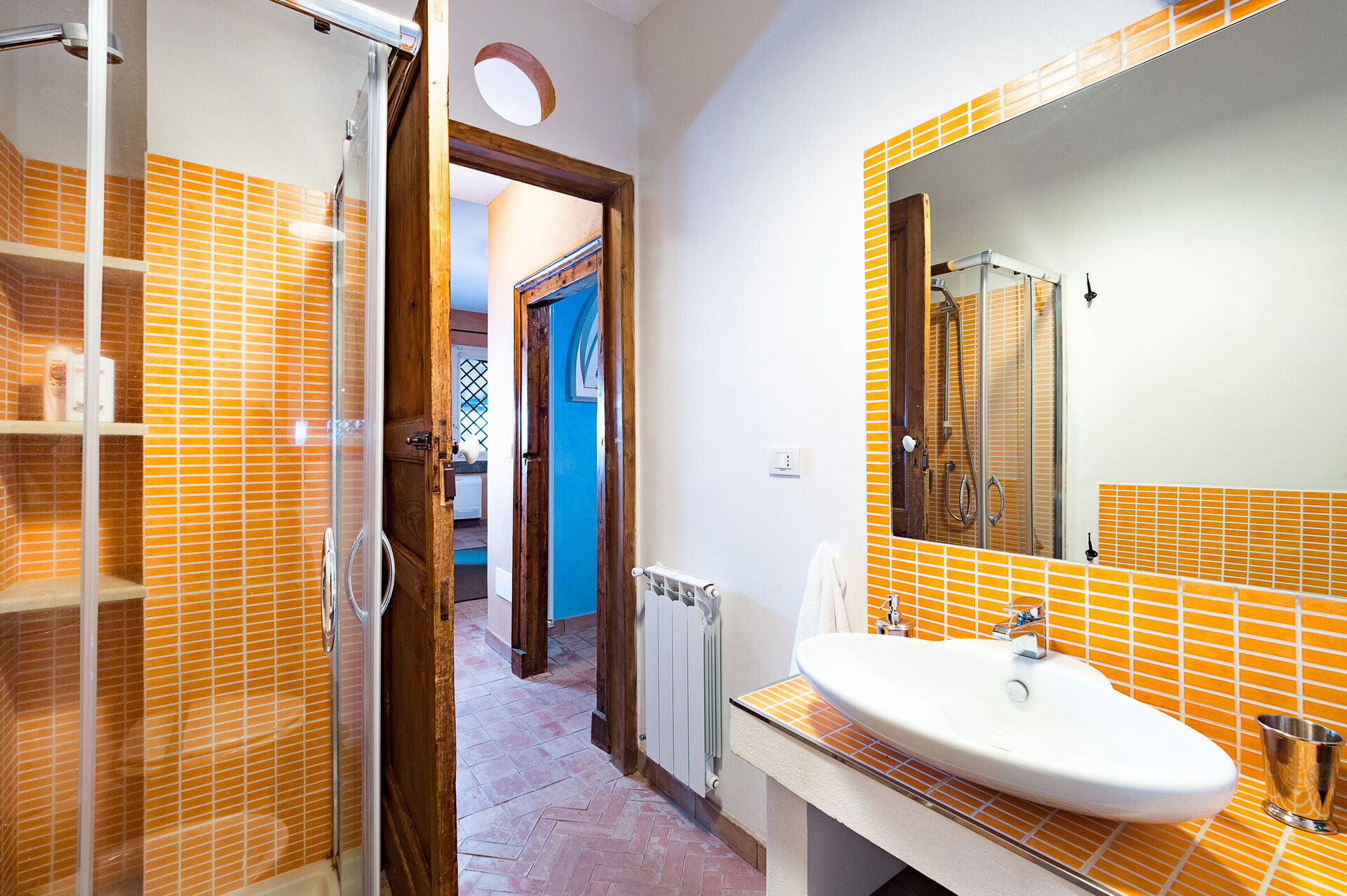 Erster Stock: 2 Doppelzimmer jeweils mit Ehebett und jedes mit privatem Bad mit Dusche, Doppelzimmer mit Ehebett, Bad mit Dusche.