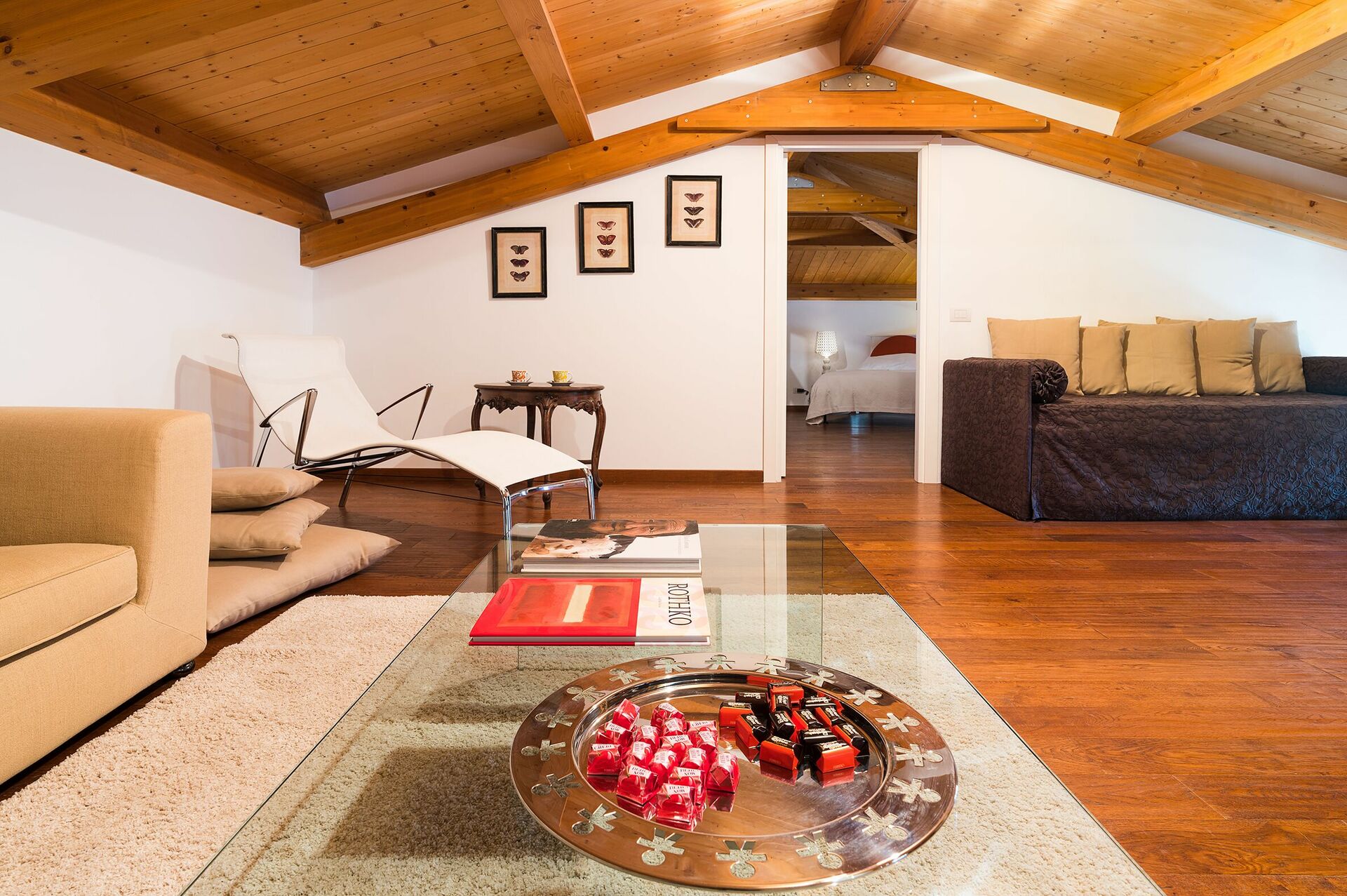 2.Stock (in der Mansarde): Suite mit Doppelzimmer und Ehebett und privatem Bad mit Badewanne und Dusche.