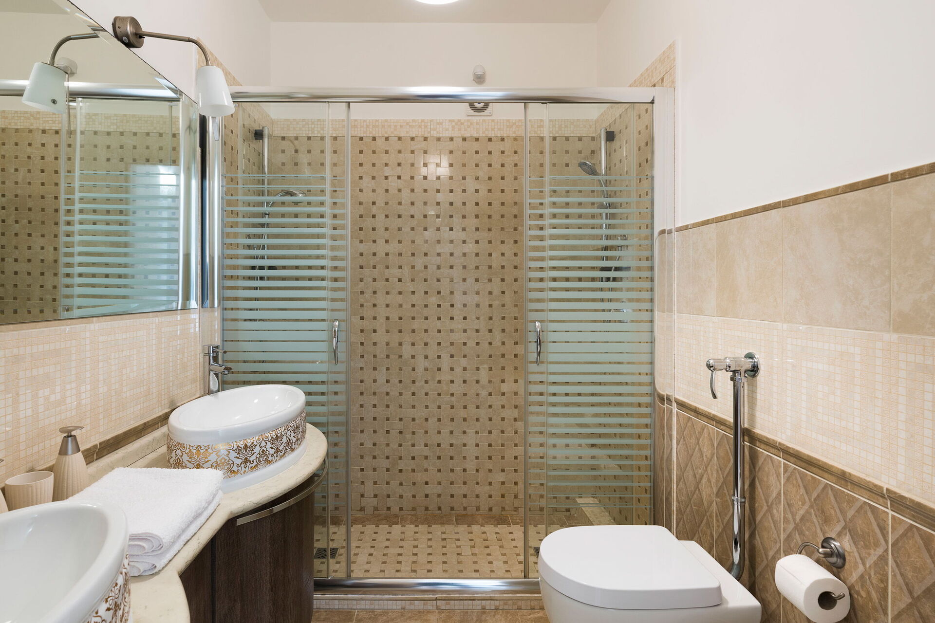 Erdgeschoss: Wohnzimmer mit Essbereich und Küche, 1 Doppelzimmer mit Bad mit Dusche, 1 Doppelzimmer, Zweibettzimmer, 1 Bad mit Dusche.