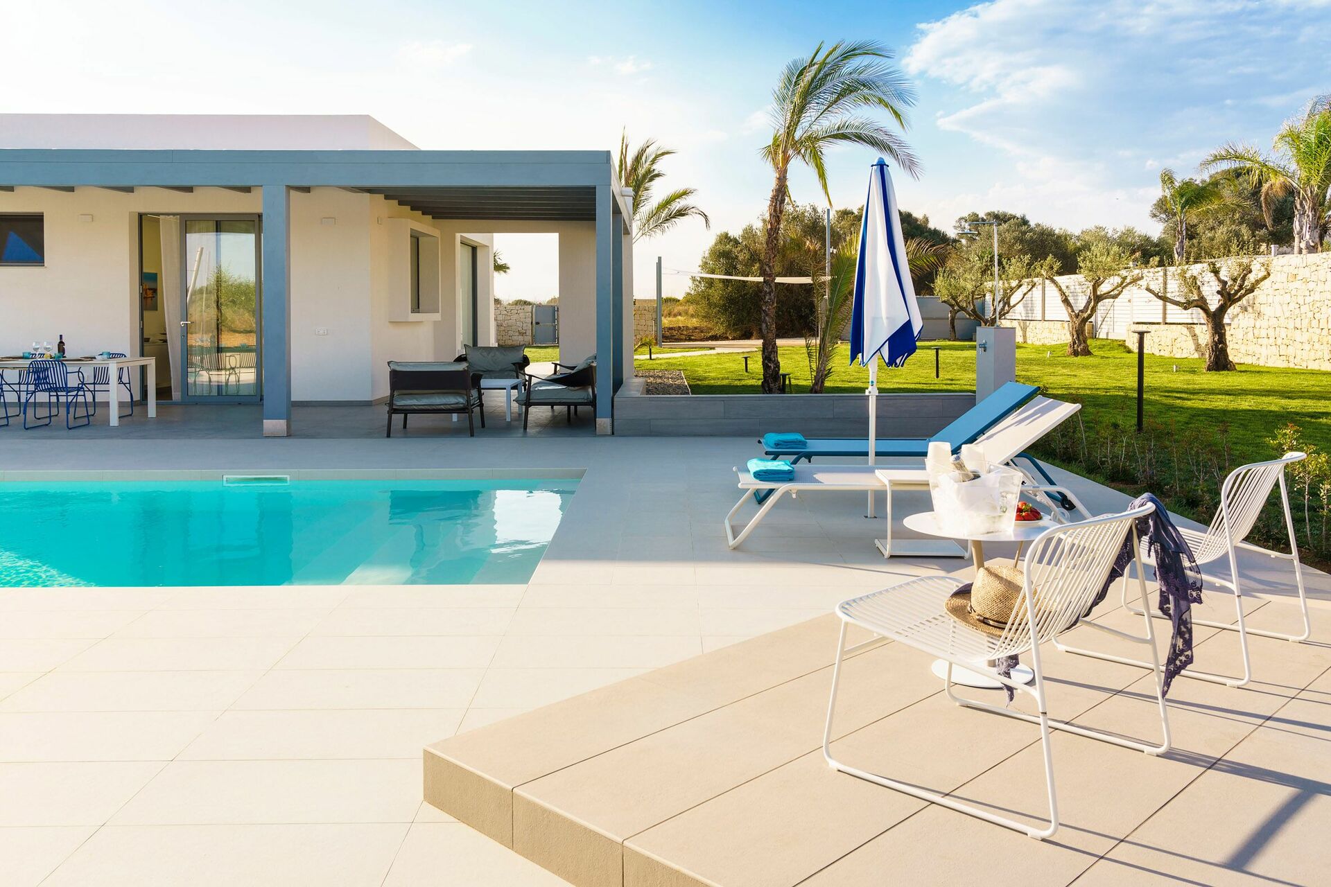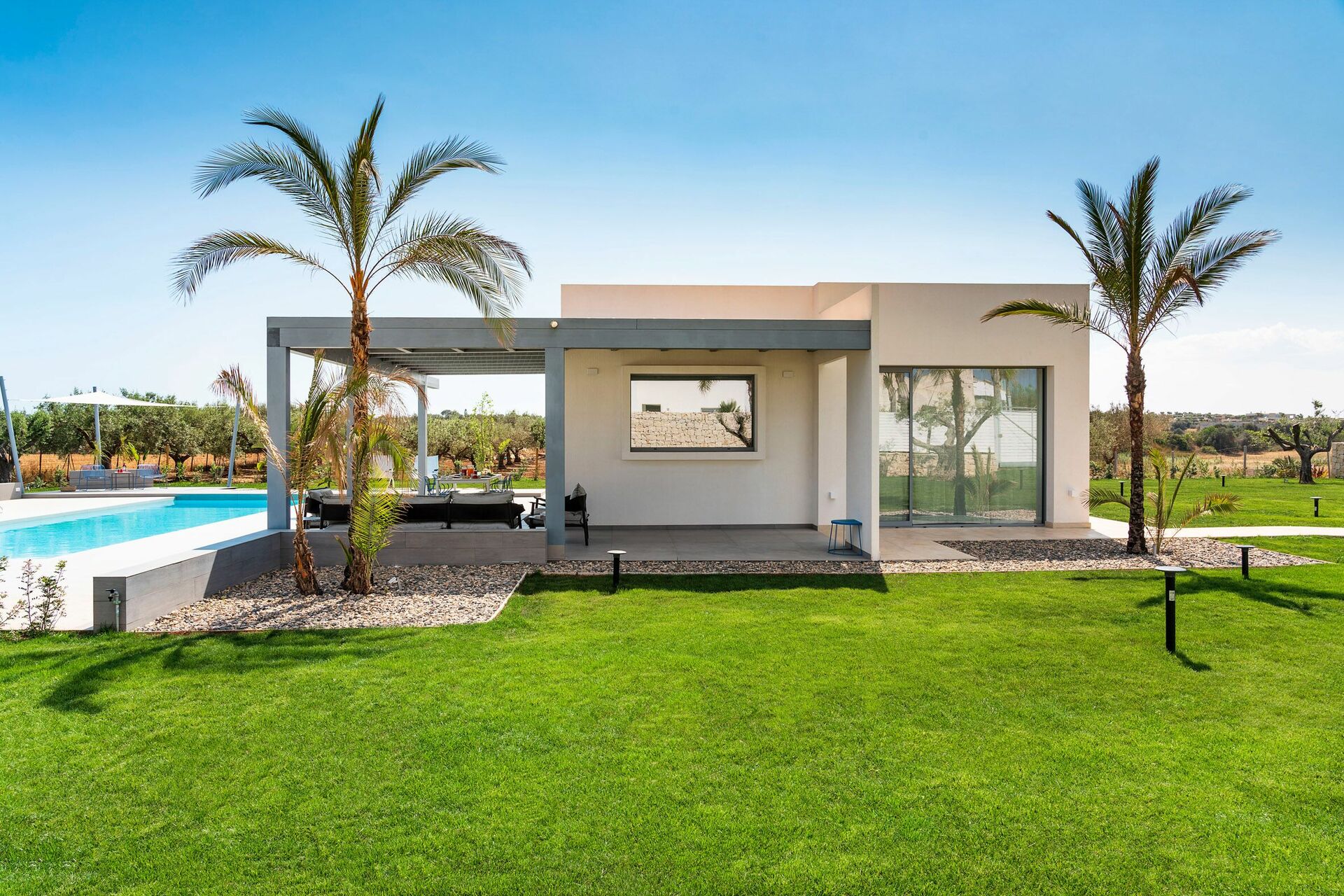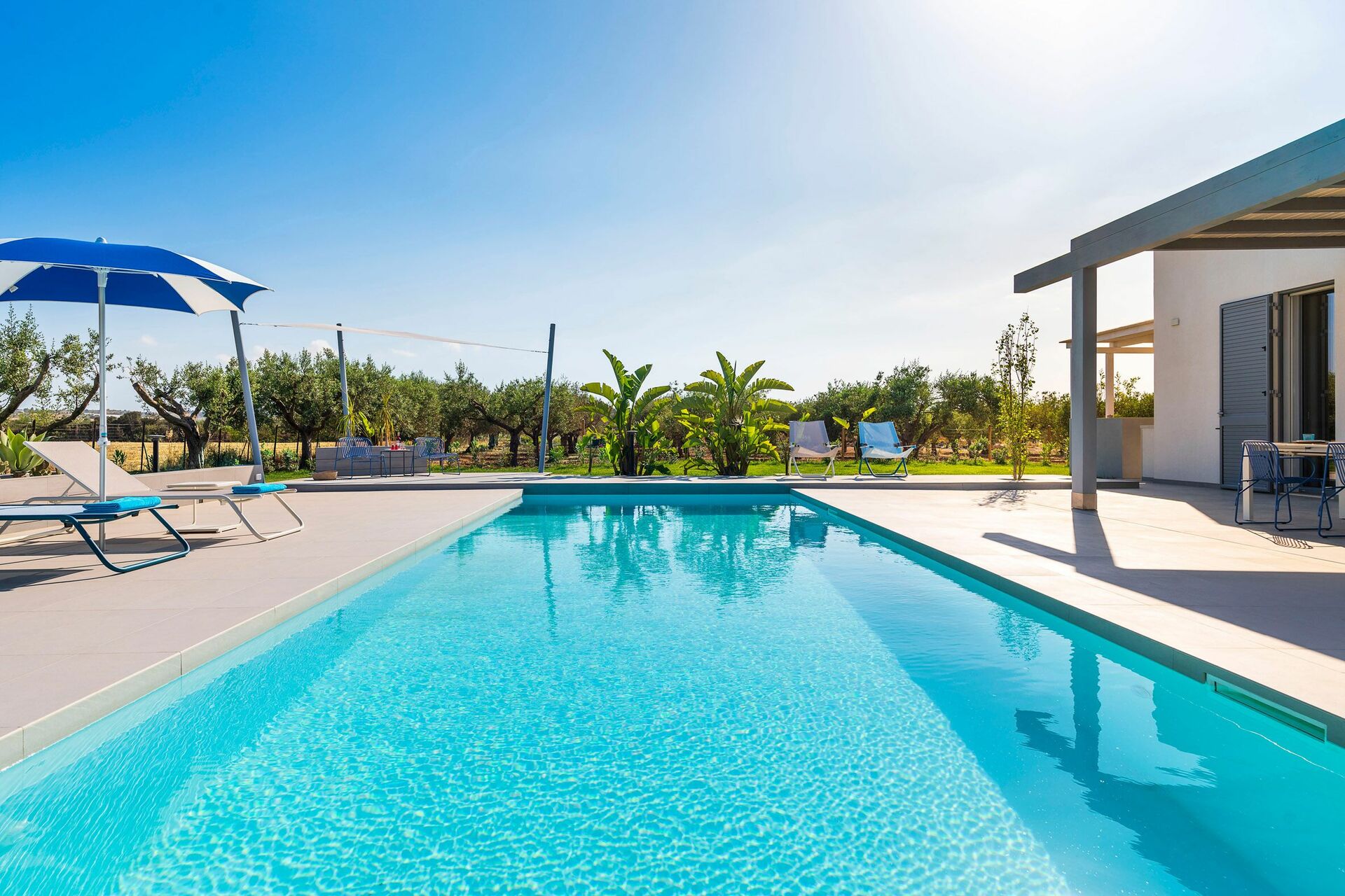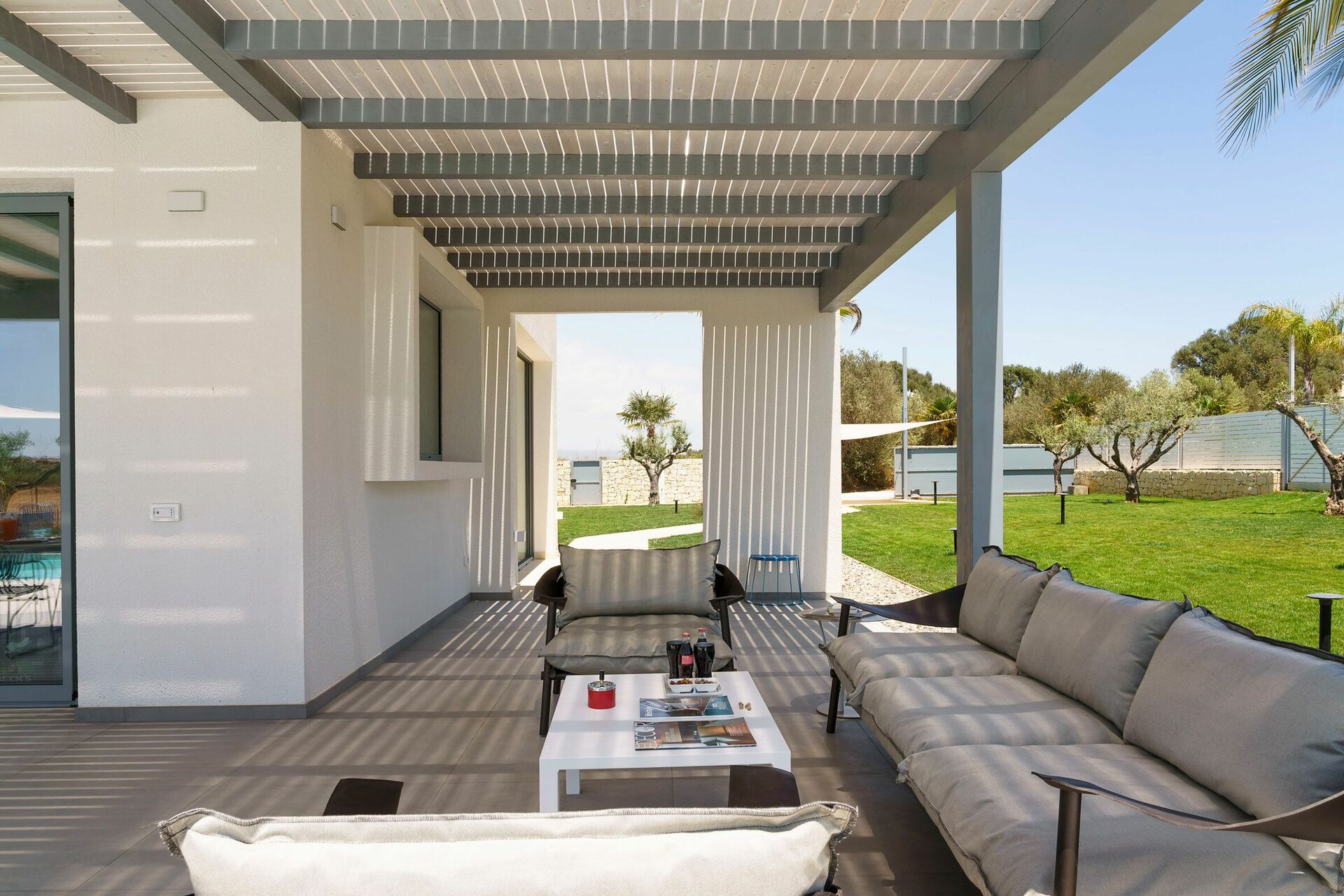 Die Außenbereiche sind sicherlich die Stärke des Hauses: Große Terrassen umgeben die Villa und ein gepflegter und üppiger mediterraner Garten beherbergt ein fantastisches Schwimmbad mit Salzreinigungsanlage, in dem man sich an den heißen Sommertagen in Sizilien erholen und erfrischen kann.