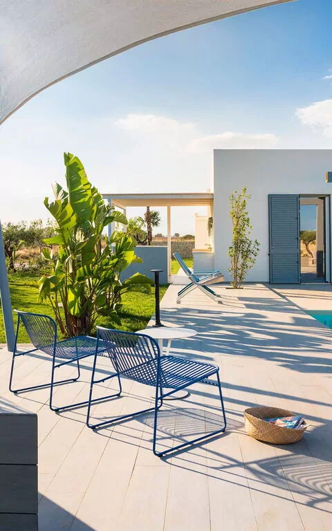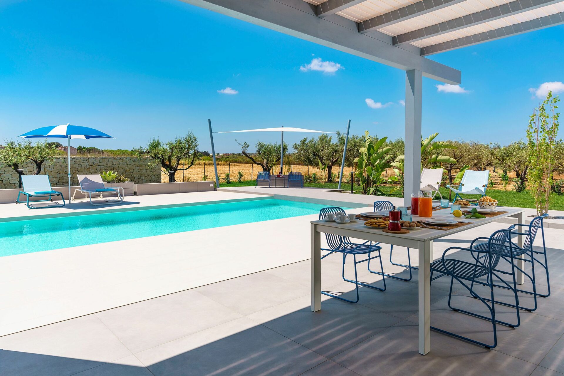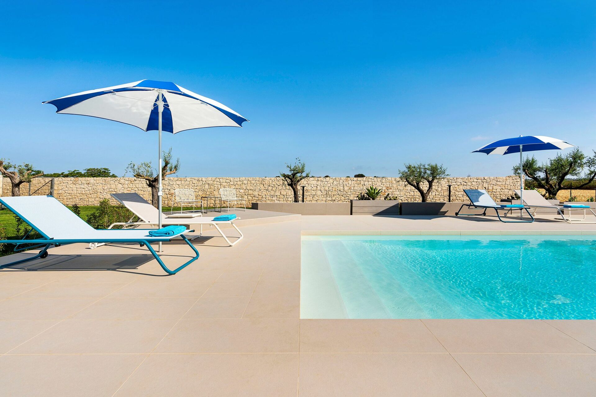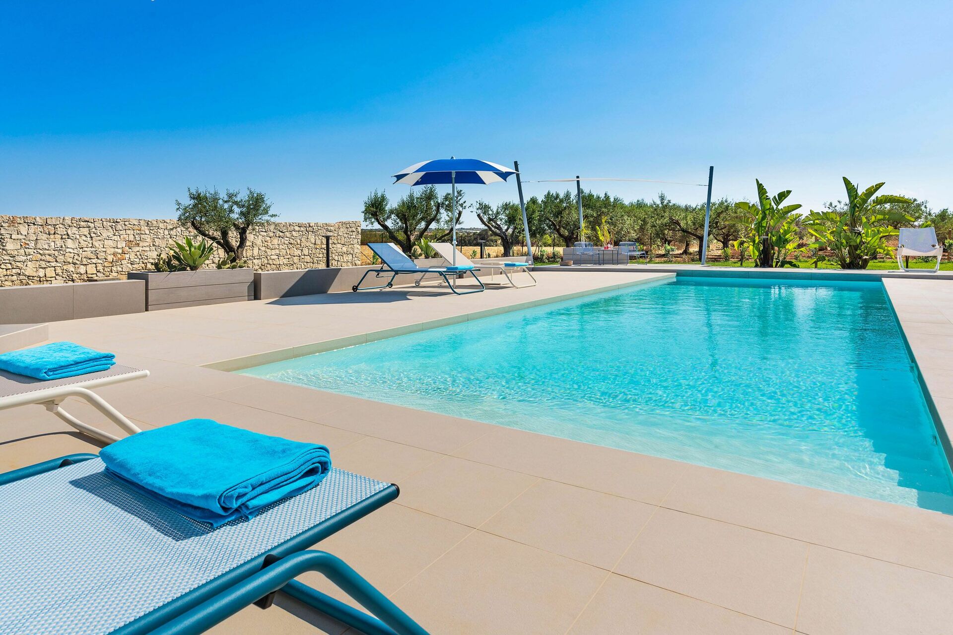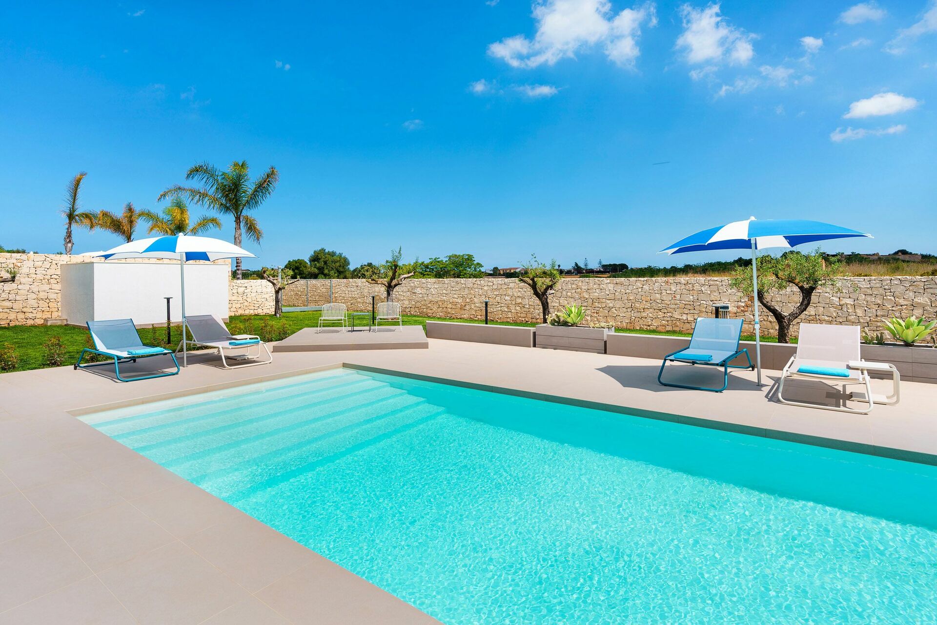 Die Außenbereiche sind sicherlich die Stärke des Hauses: Große Terrassen umgeben die Villa und ein gepflegter und üppiger mediterraner Garten beherbergt ein fantastisches Schwimmbad mit Salzreinigungsanlage, in dem man sich an den heißen Sommertagen in Sizilien erholen und erfrischen kann.