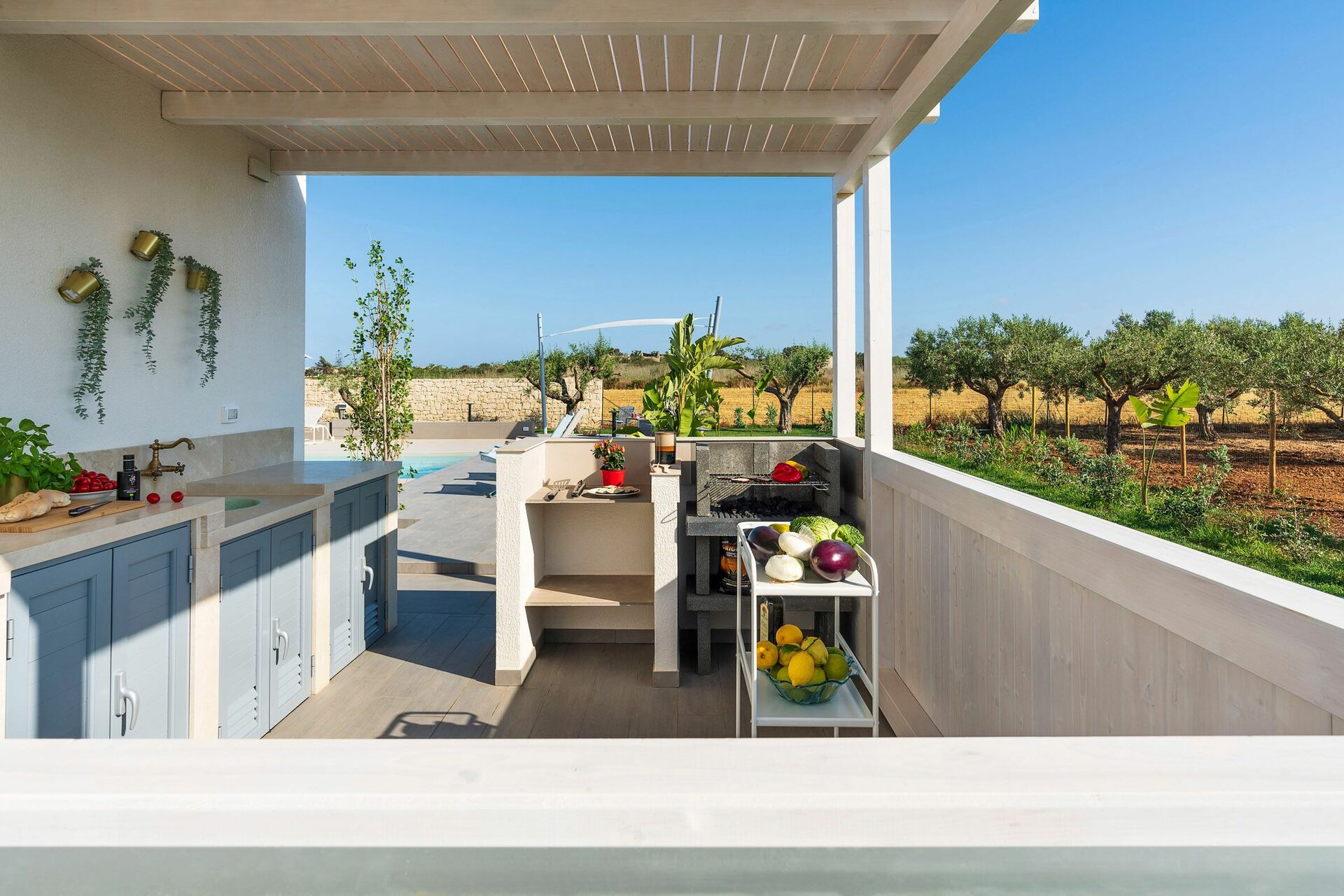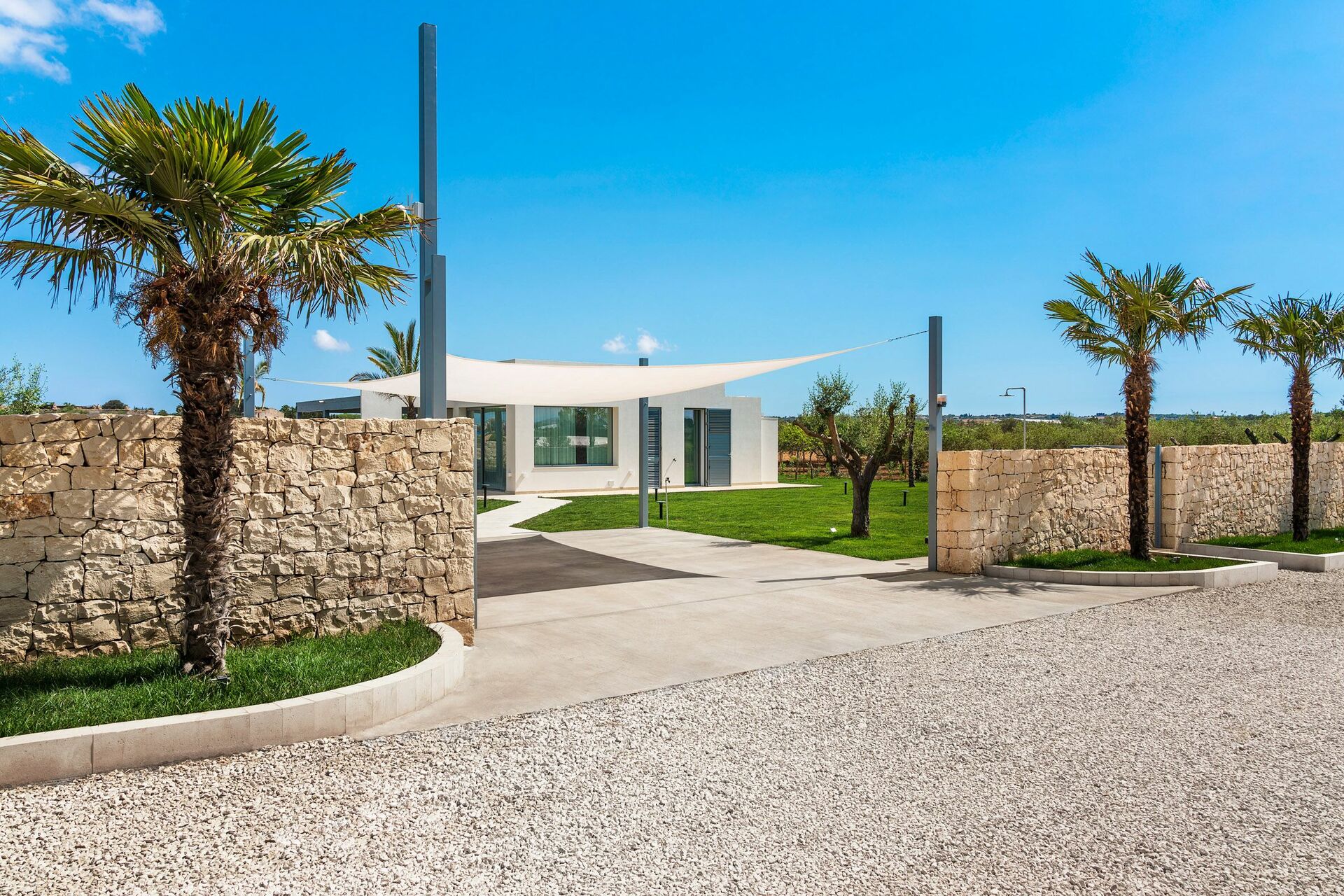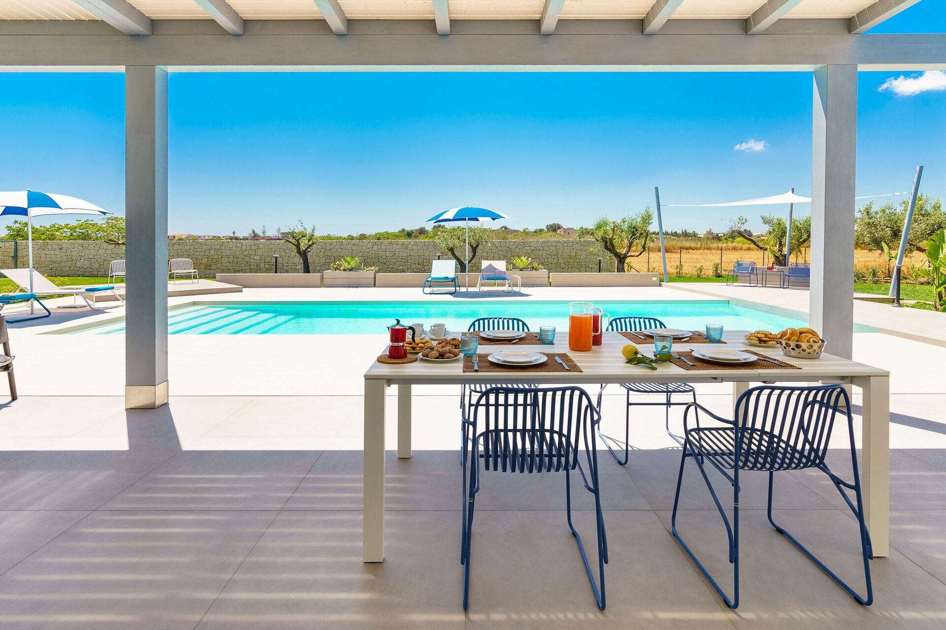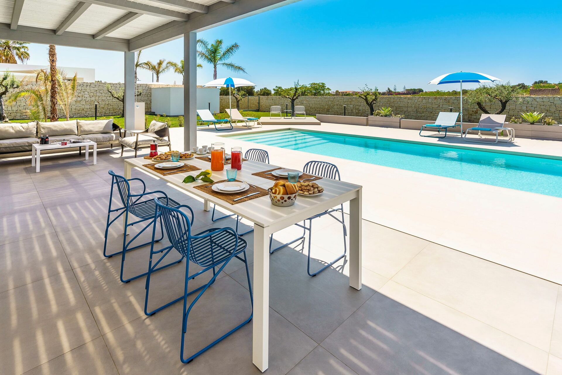 Die Außenbereiche sind sicherlich die Stärke des Hauses: Große Terrassen umgeben die Villa und ein gepflegter und üppiger mediterraner Garten beherbergt ein fantastisches Schwimmbad mit Salzreinigungsanlage, in dem man sich an den heißen Sommertagen in Sizilien erholen und erfrischen kann.