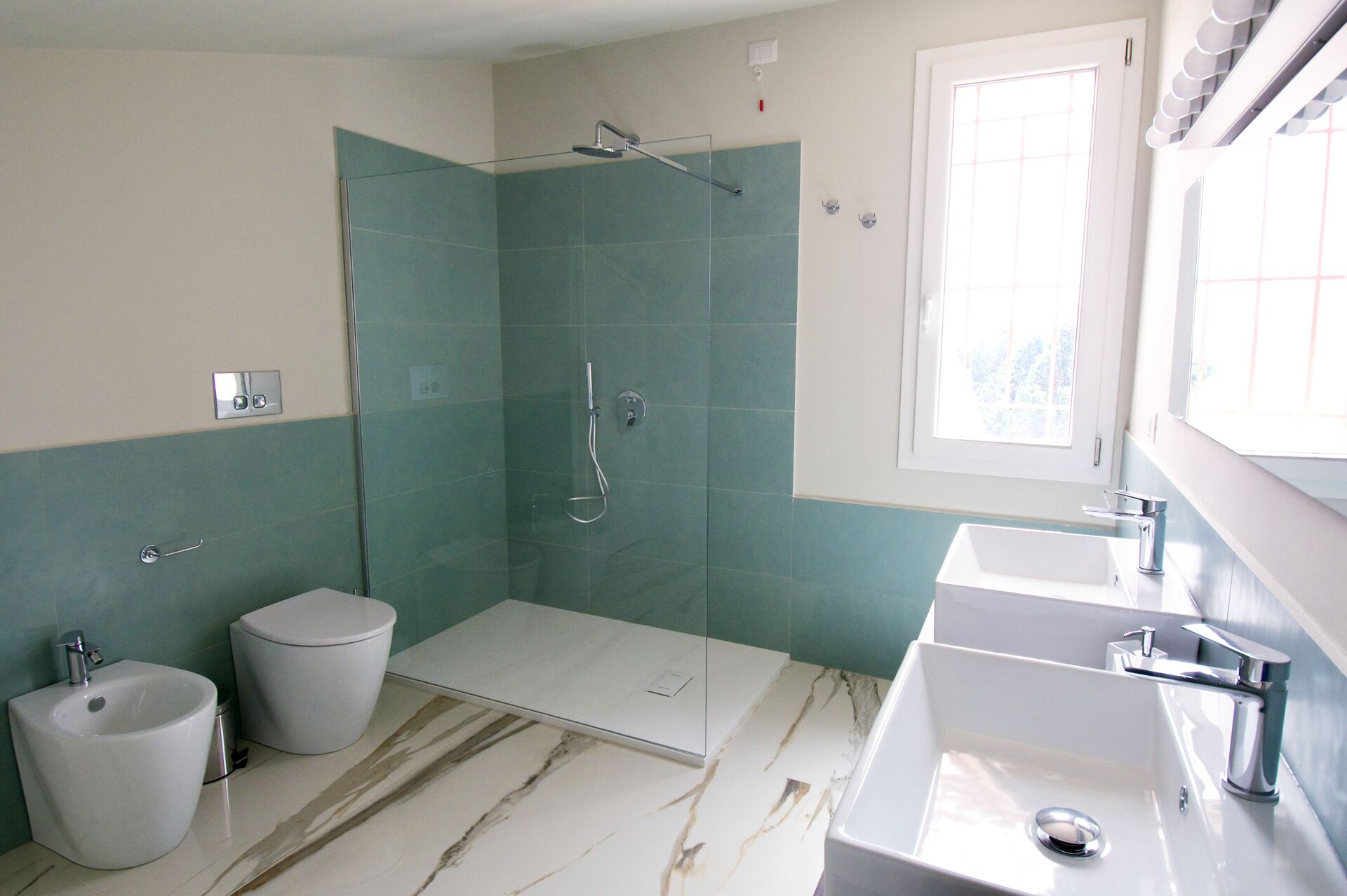 Erdgeschoss: großer Wohnbereich mit Wohnzimmer, Essbereich und Küche (Backofen, Gefrierschrank, Geschirrspüler, Mikrowelle, Espressomaschine), WC mit Waschmaschine, 2 Doppelzimmer jeweils mit eigenem Bad mit Dusche.