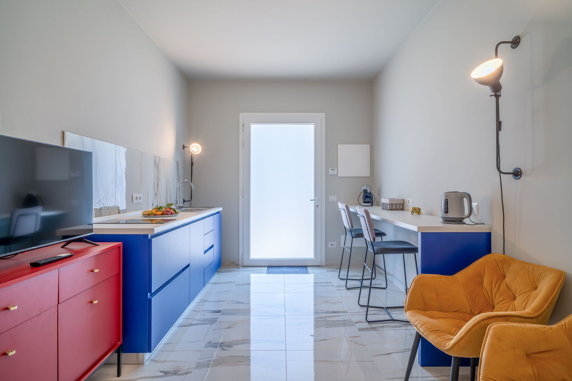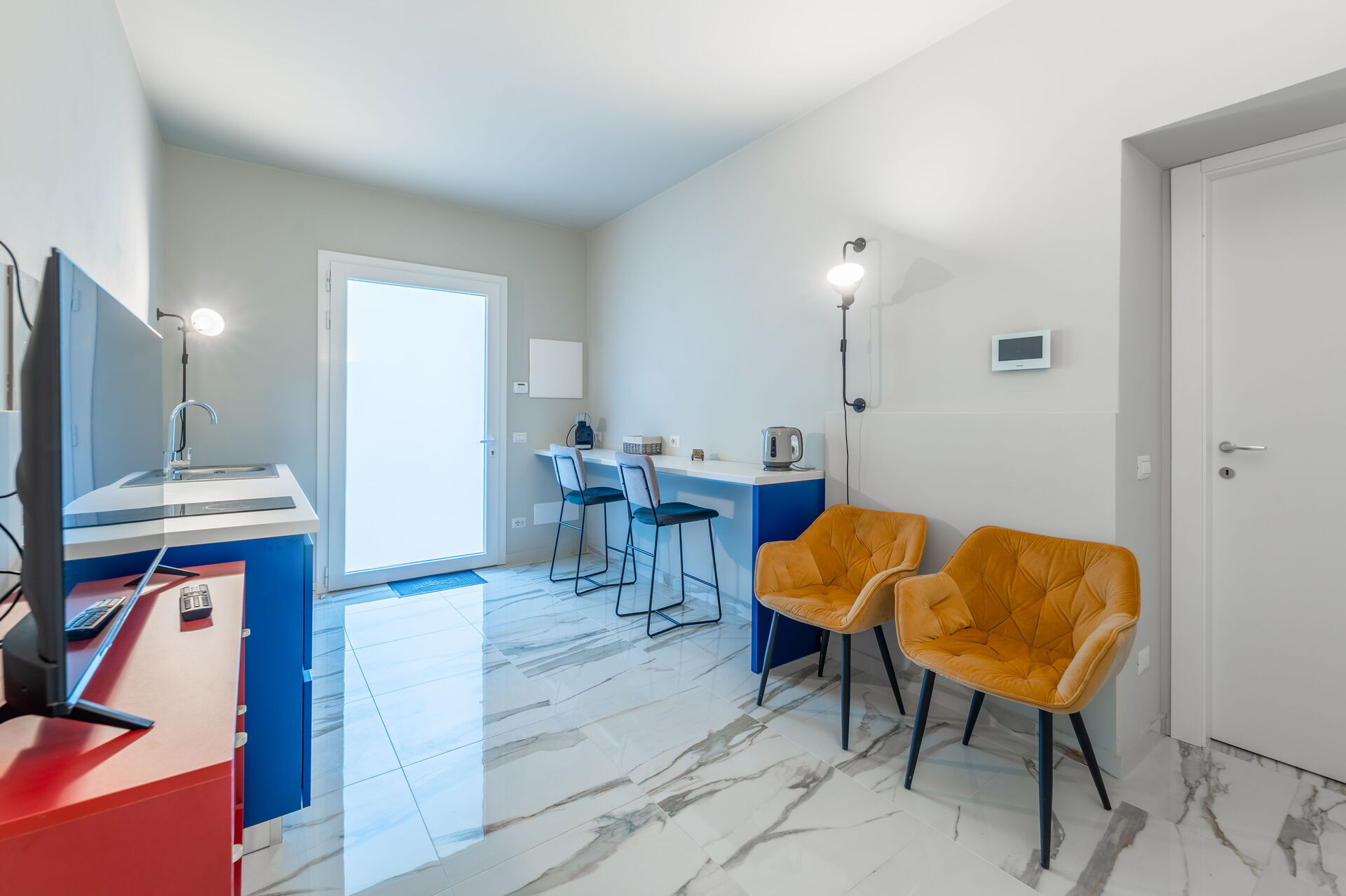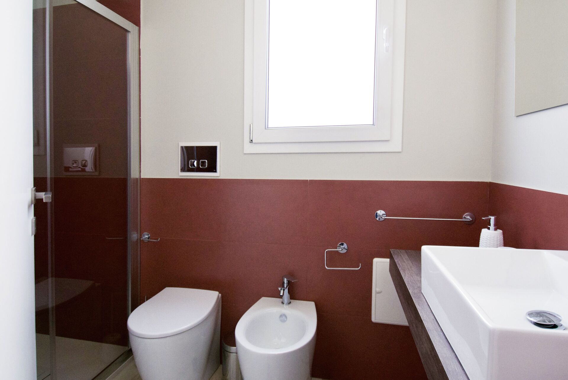 Erdgeschoss (nicht intern mit dem Rest des Hauses verbunden): Eingang mit Küche (Induktionskochfeld) und Theke, 2 Doppelzimmer jeweils mit eigenem Bad mit Dusche.