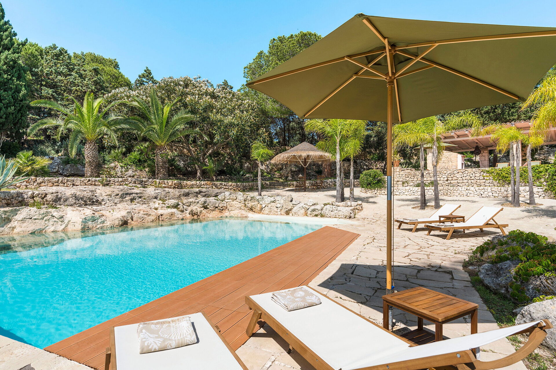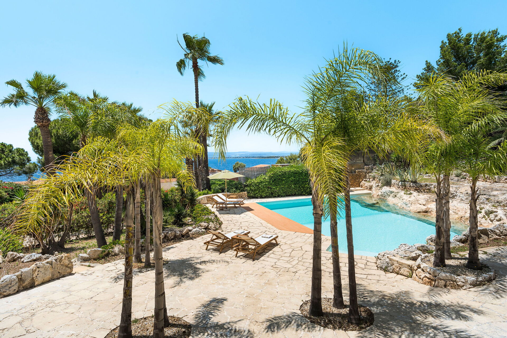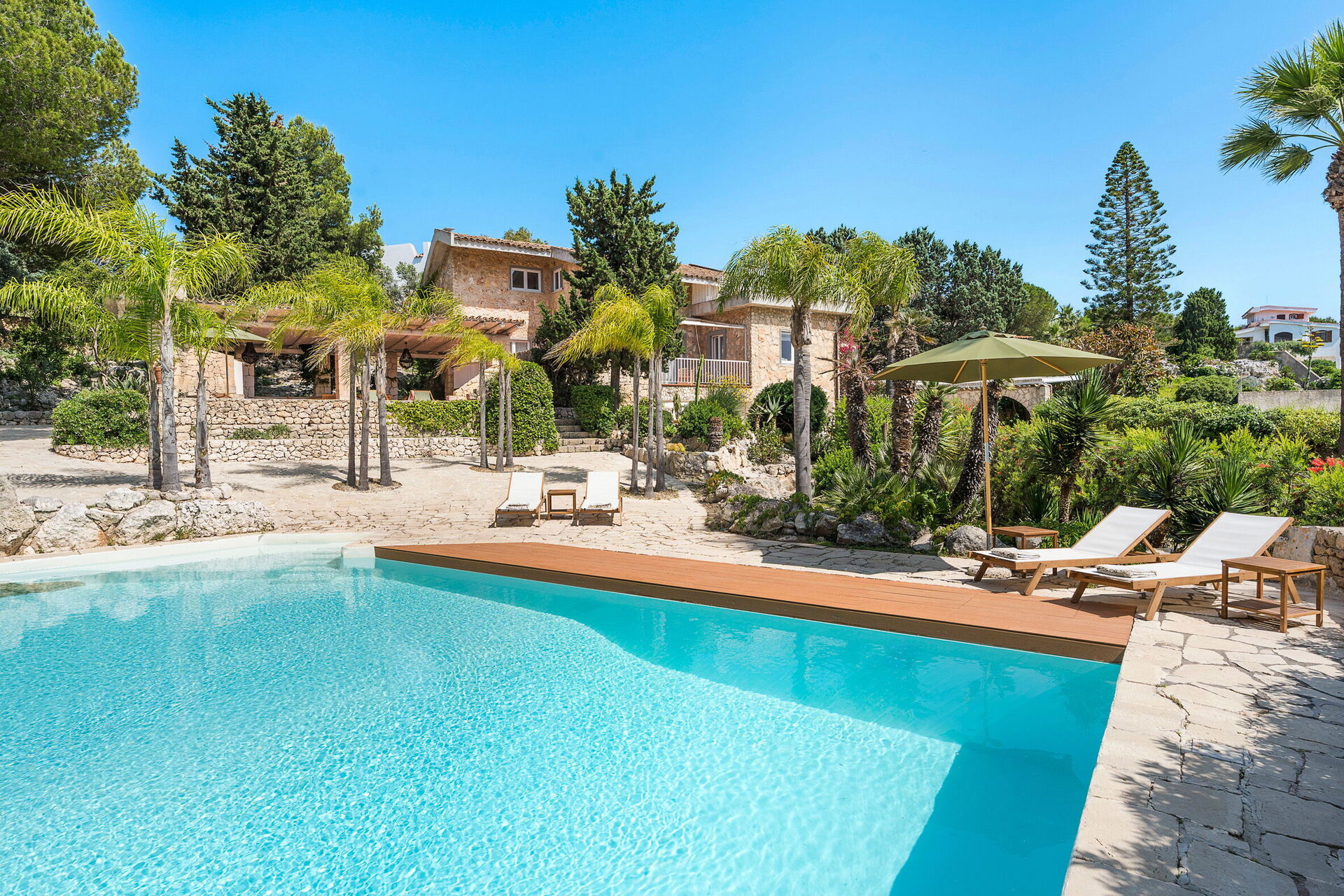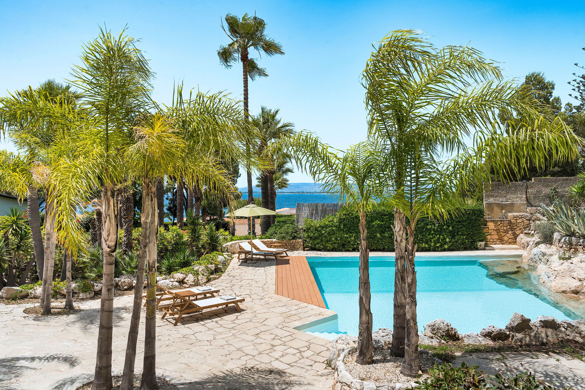 Villa Madda ist über eine Palmenallee erreichbar und liegt inmitten eines Gartens mit mediterranen Pflanzen, in dem sich ein charakteristisches, von Felsen umgebenes Schwimmbad befindet.