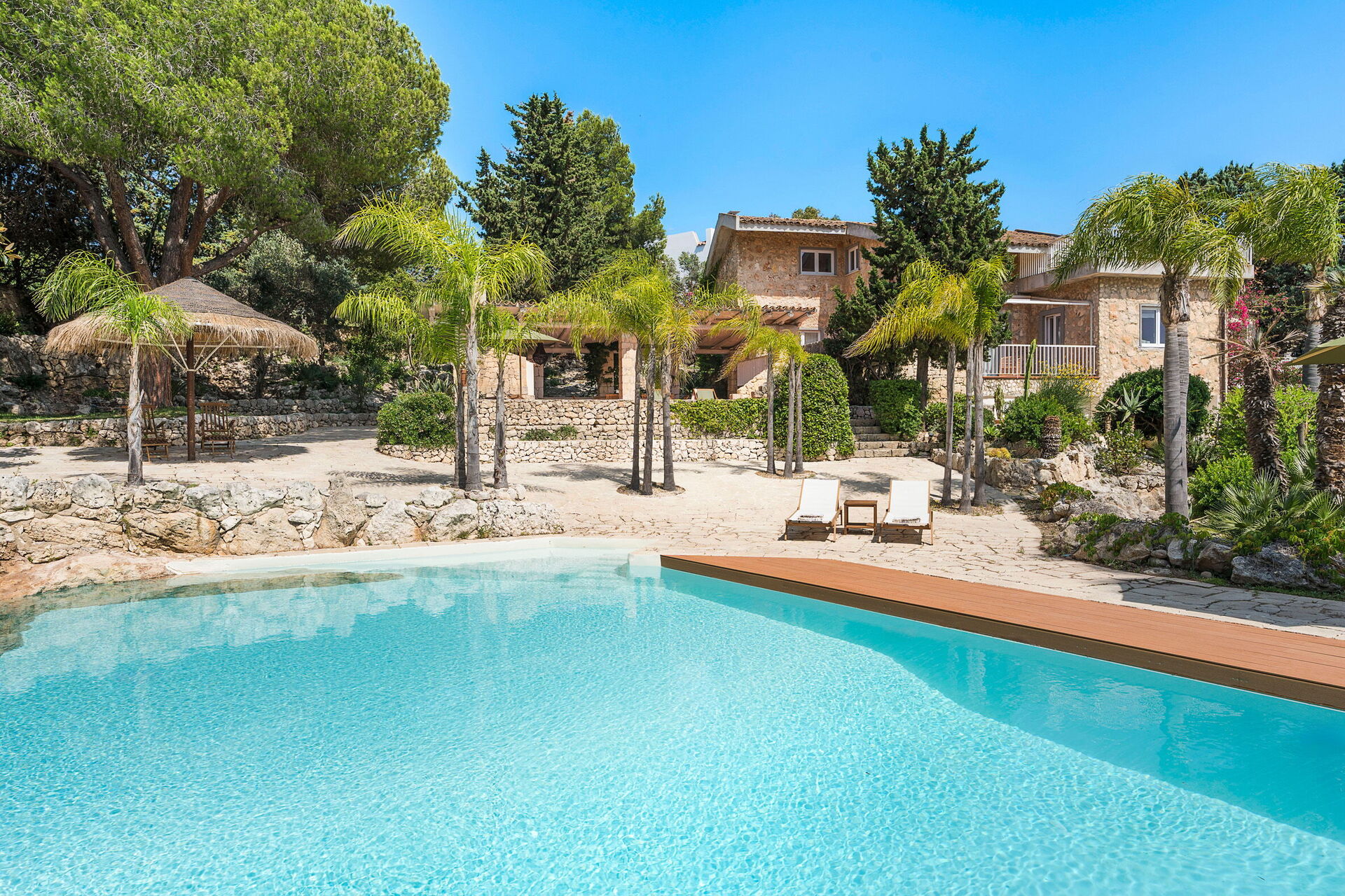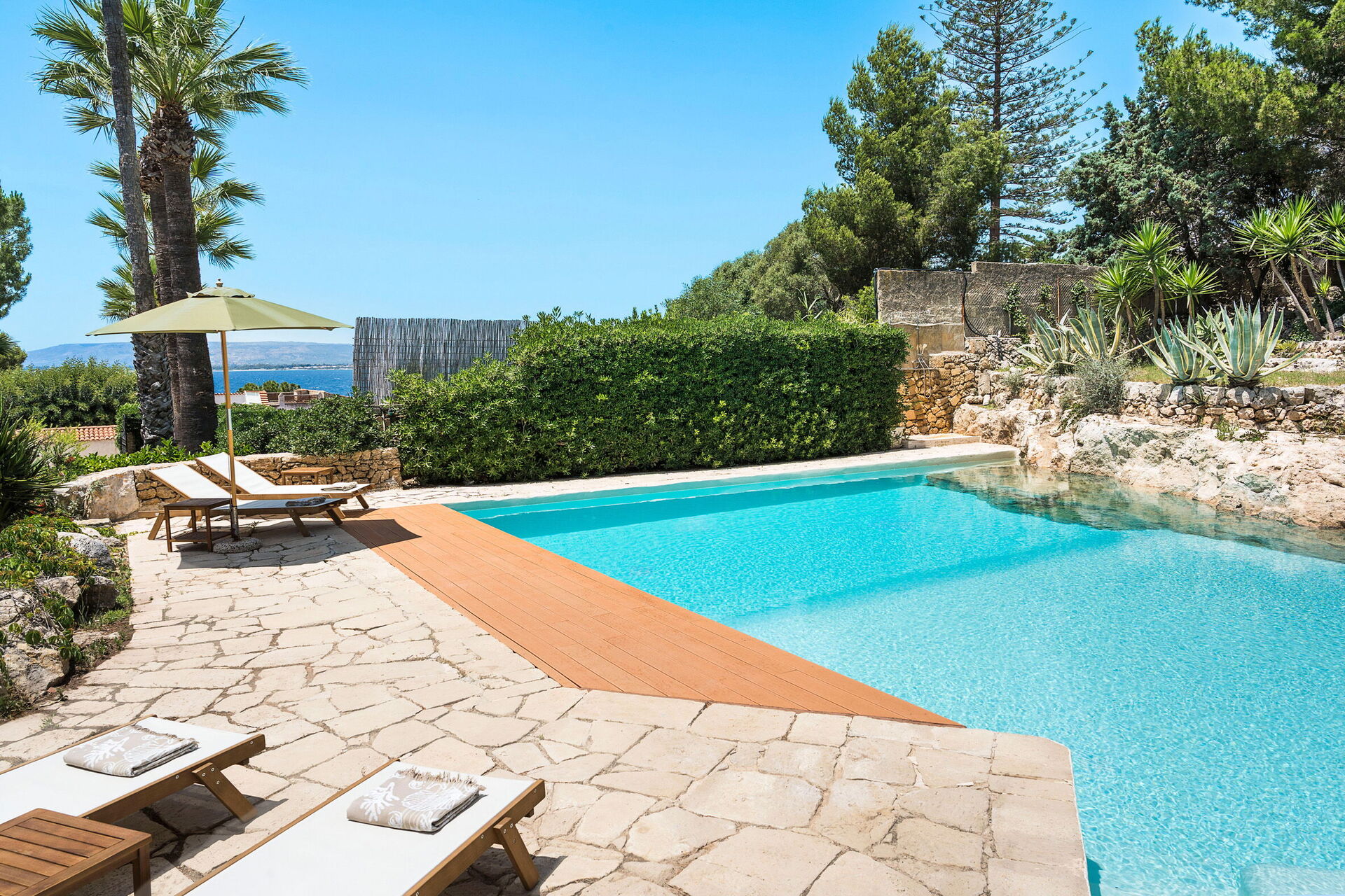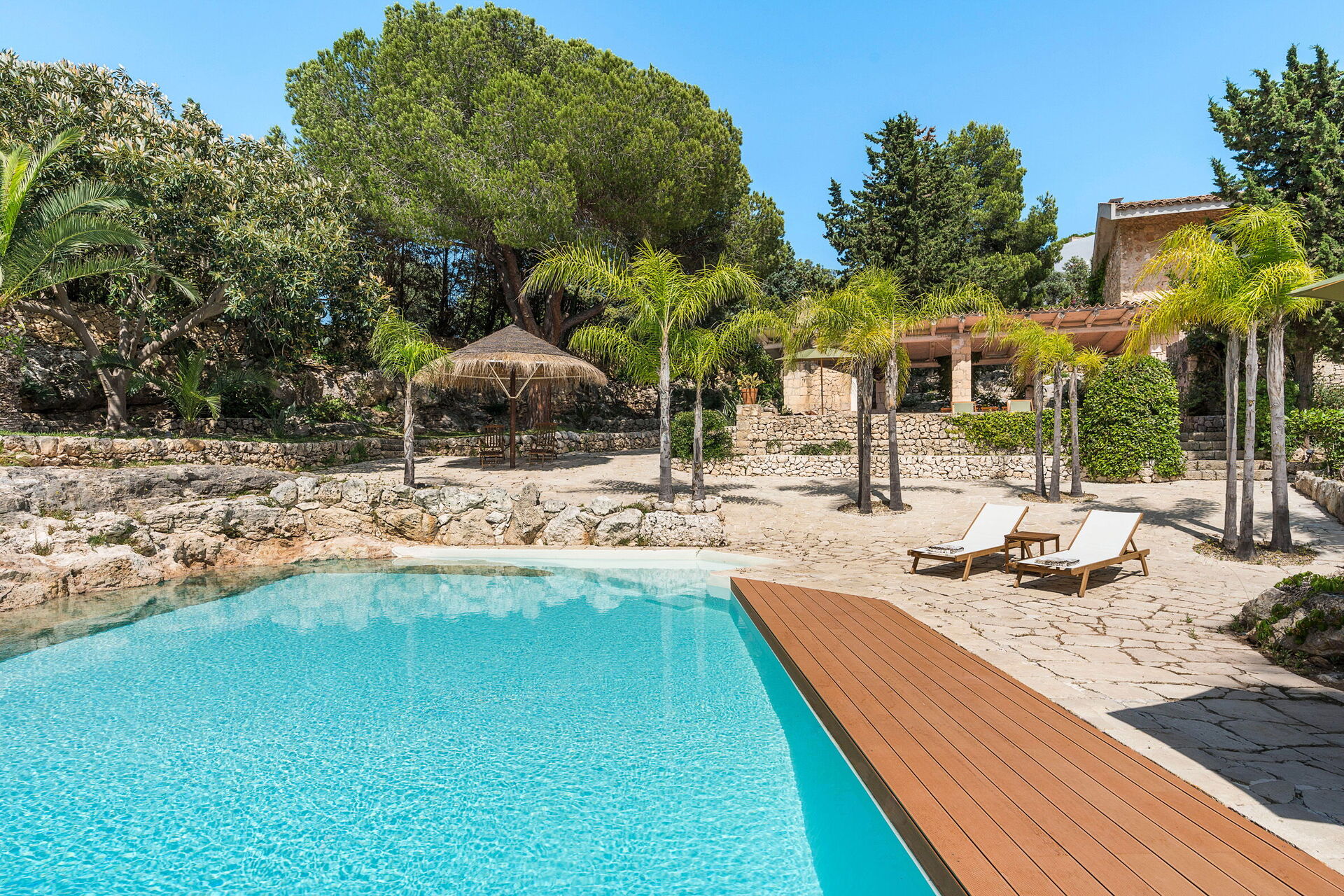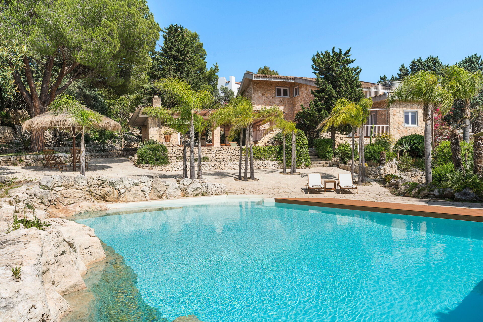 Villa Madda ist über eine Palmenallee erreichbar und liegt inmitten eines Gartens mit mediterranen Pflanzen, in dem sich ein charakteristisches, von Felsen umgebenes Schwimmbad befindet.