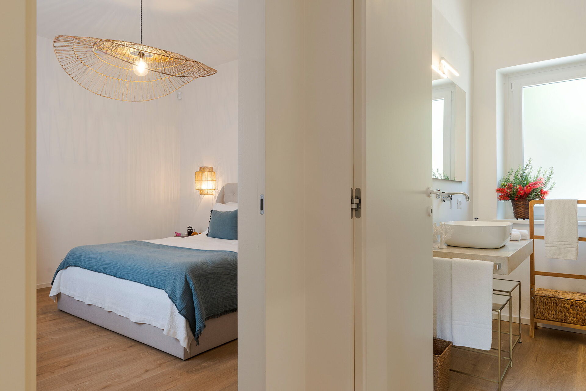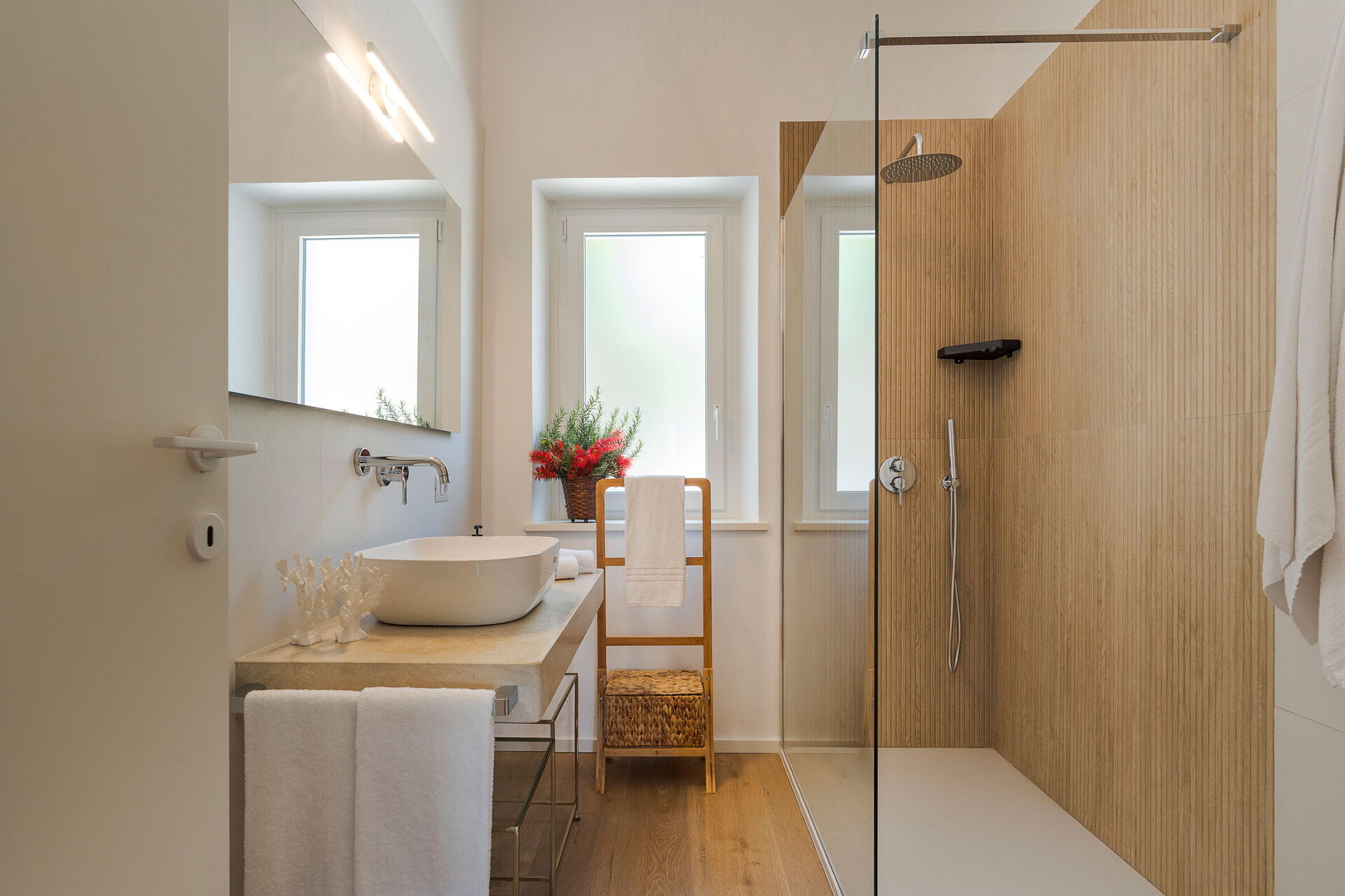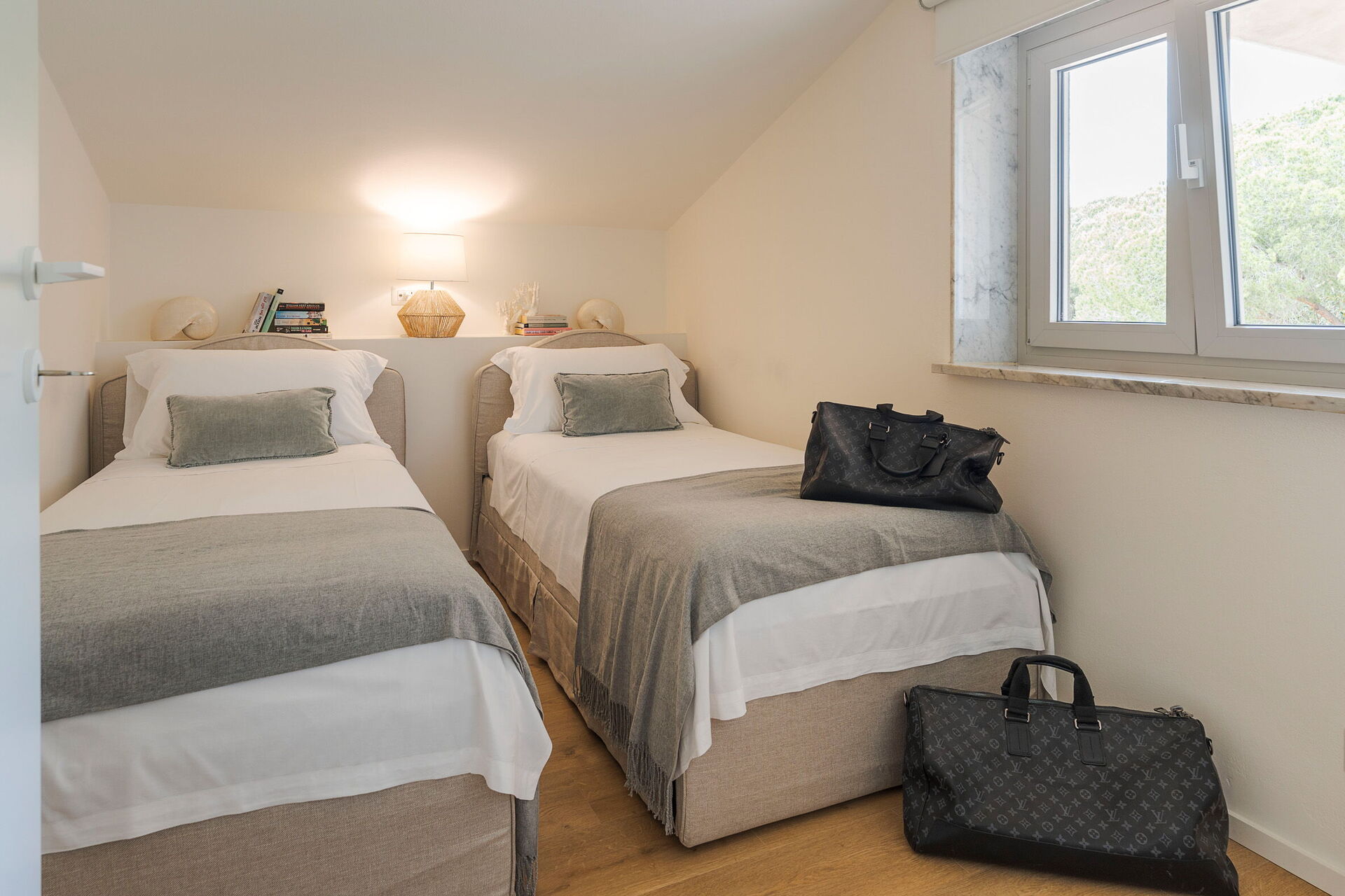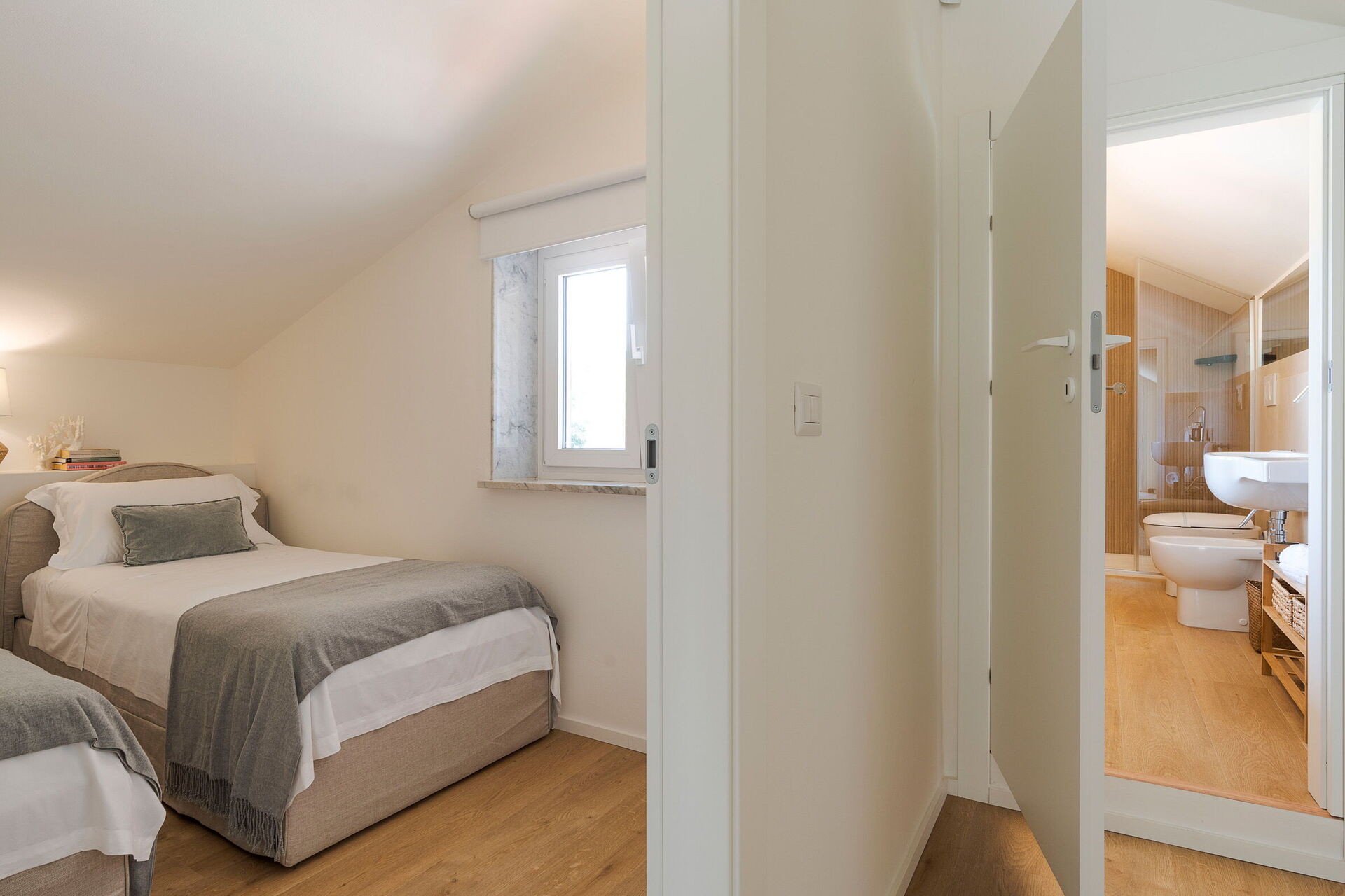 Zweiter Stock: Doppelzimmer (Klimaanlage), Zweibettzimmer (Klimaanlage), Badezimmer mit Dusche.