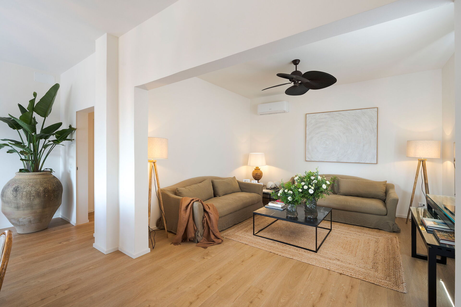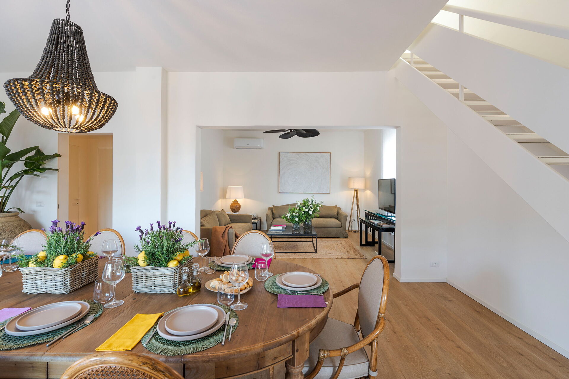 Erster Stock: großes Wohnzimmer (TV, Klimaanlage) mit Essbereich, Küche (Herd, Backofen, Gefrierschrank, Geschirrspüler, Kaffeemaschine, Mikrowelle, Kühlschrank), Schlafzimmer mit Doppelbett (Klimaanlage), Badezimmer mit Dusche.