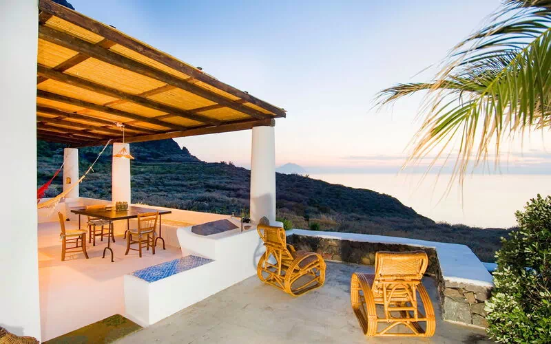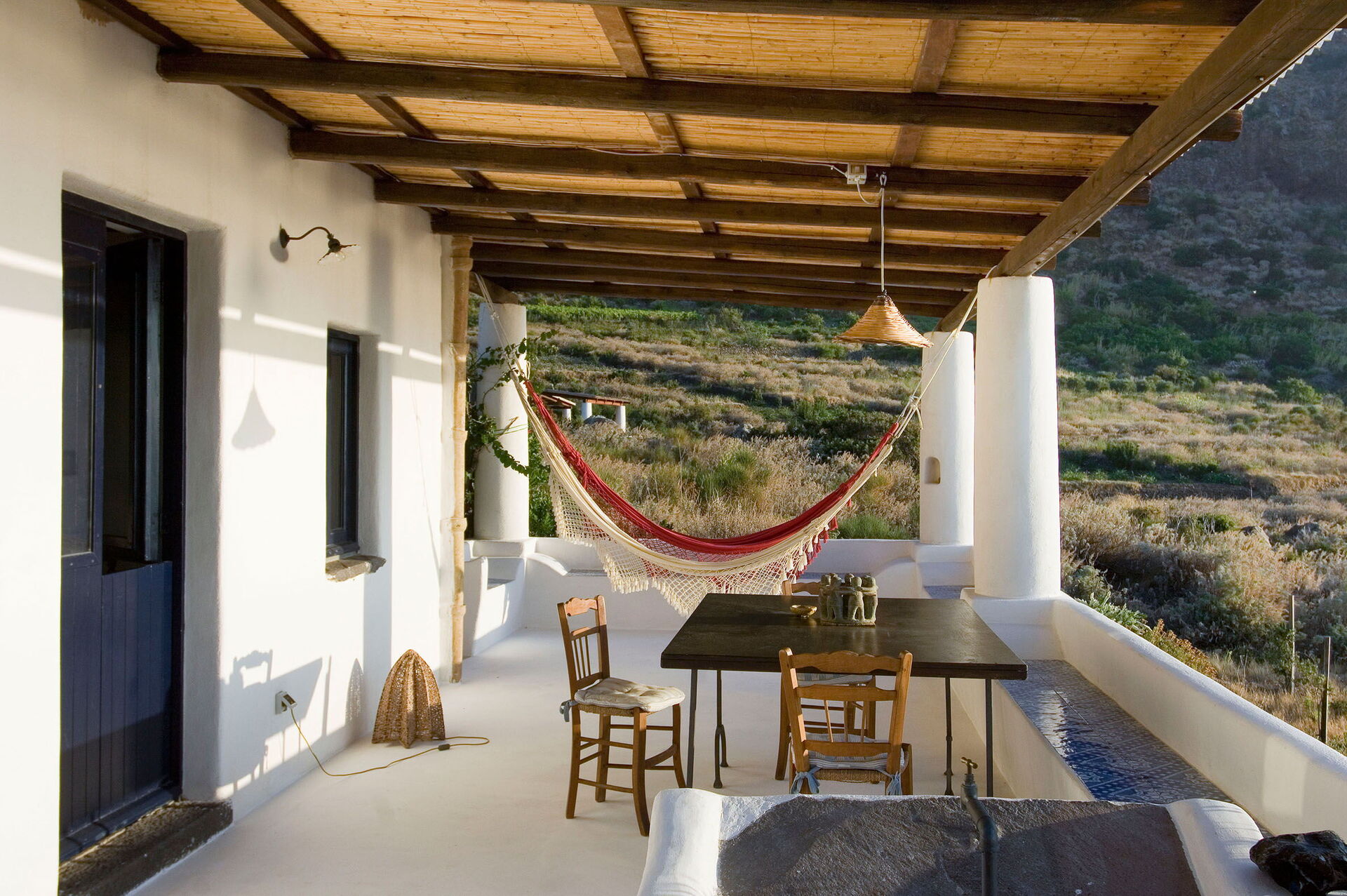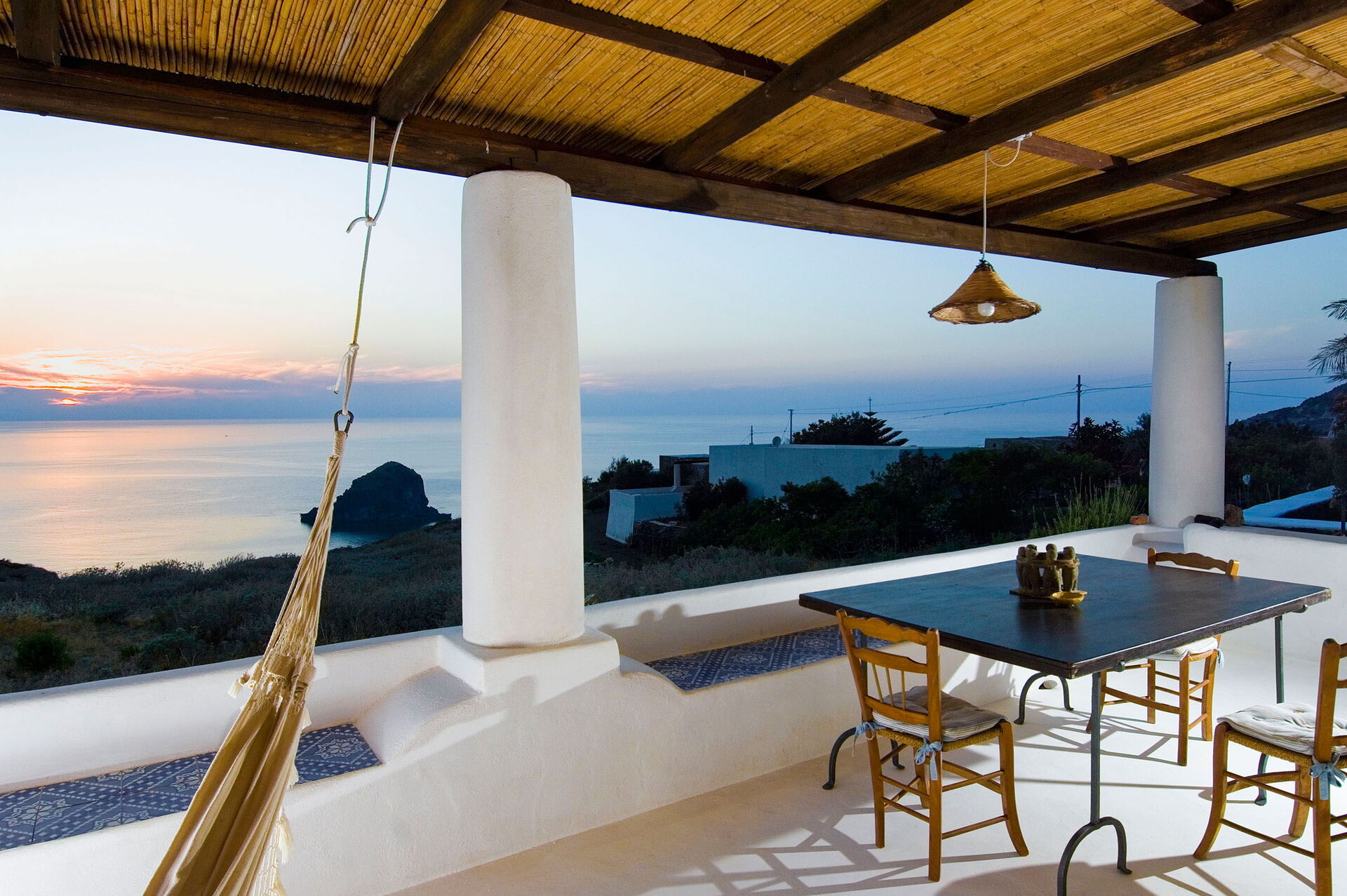 Der Essbereich im Freien, der sich unter der Veranda des Hauses befindet, ist besonders beeindruckend: man kann sich entspannen und im Freien essen und gleichzeitig einen fantastischen, atemberaubenden Panoramablick auf das Meer mit den Inseln Alicudi und Filicudi am Horizont genießen. Unter der Veranda befinden sich zwei Hängematten. Die großen Flächen, die als Sonnenterrasse genutzt werden, machen diese Villa zum idealen Ort, um mit Freunden und der Familie unter der warmen sizilianischen Sonne zu entspannen.