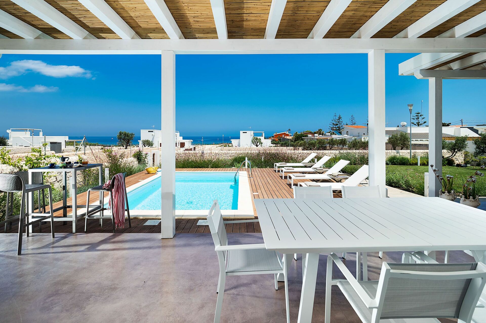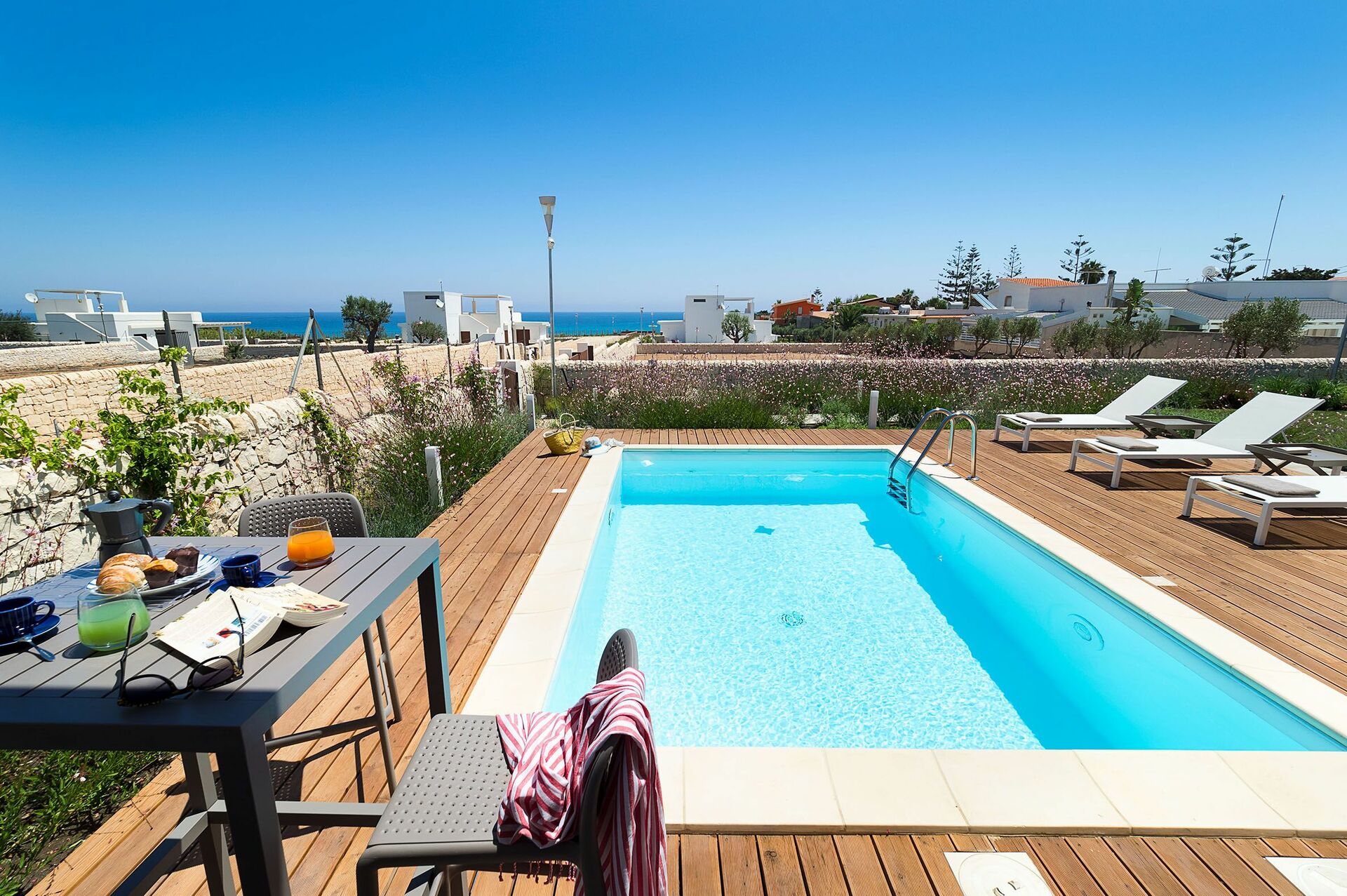 Dieses schöne, gemütliche Haus ist von einem gepflegten Garten und großen Panoramaterrassen mit Meerblick umgeben und verfügt über einen kleines privates Schwimmbad. Die kürzlich erbaute Villa verfügt über helle, komfortable Zimmer, die geschmackvoll und funktional eingerichtet sind.
