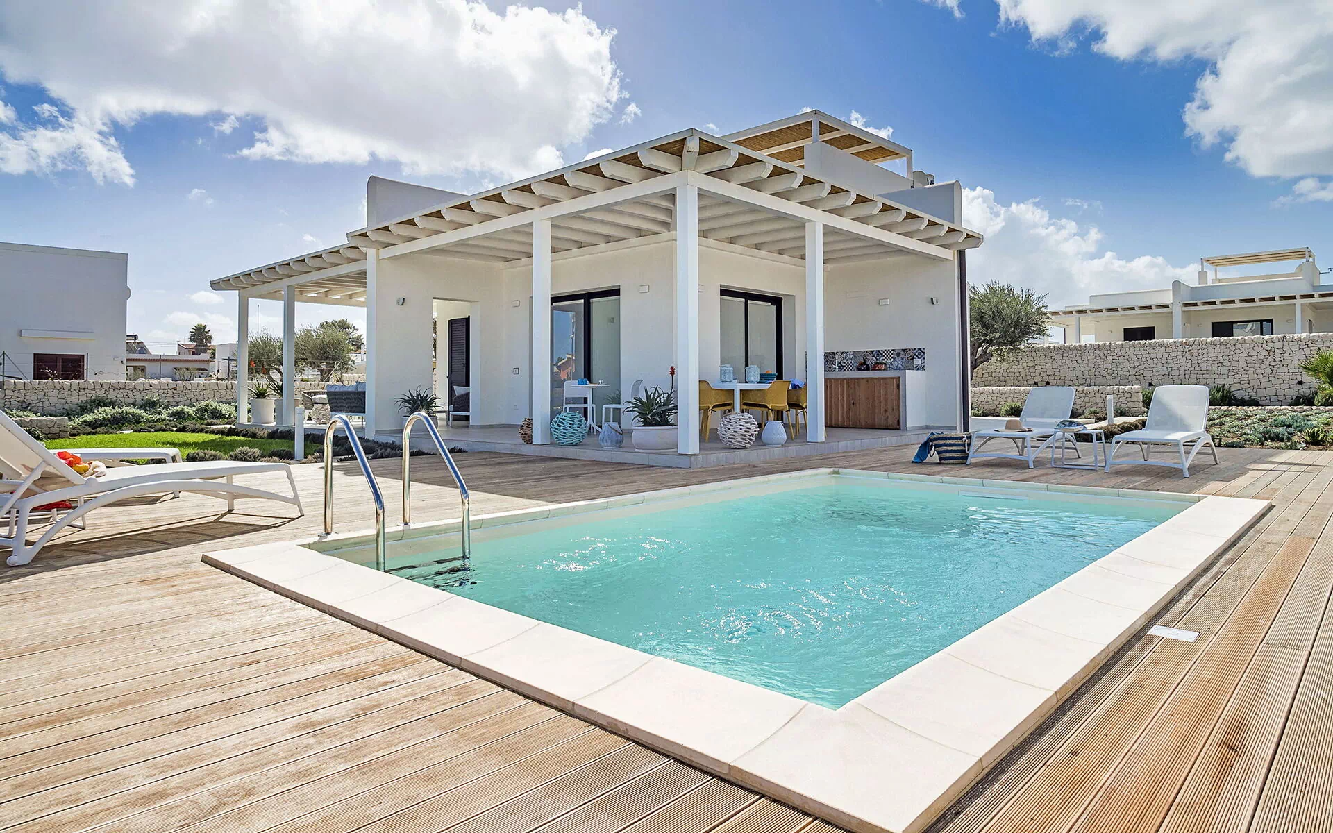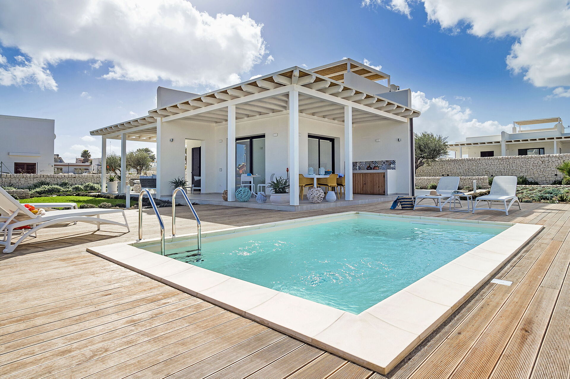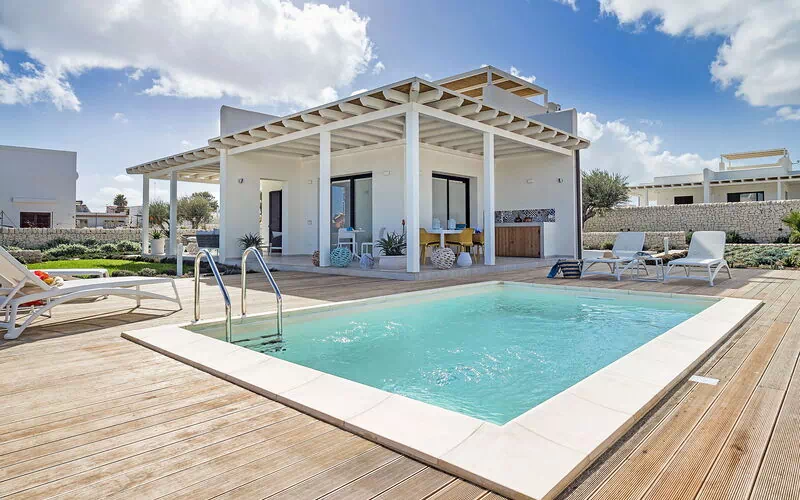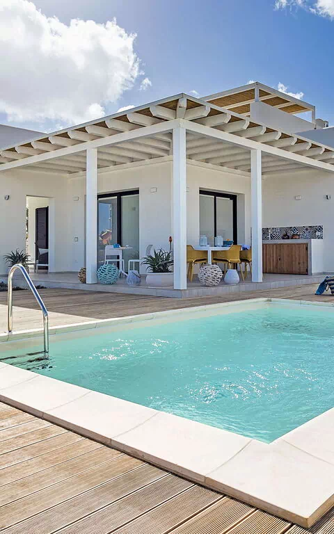 Umgeben von einem gepflegten Garten und großen Panoramaterrassen mit Meerblick, bietet diese schöne und komfortable Ferienvilla ein kleines privates Scnwimmbad und einen exklusiven Whirlpool auf der Sonnenterrasse des Hauses. Der Whirlpool kann auf Anfrage beheizt werden.