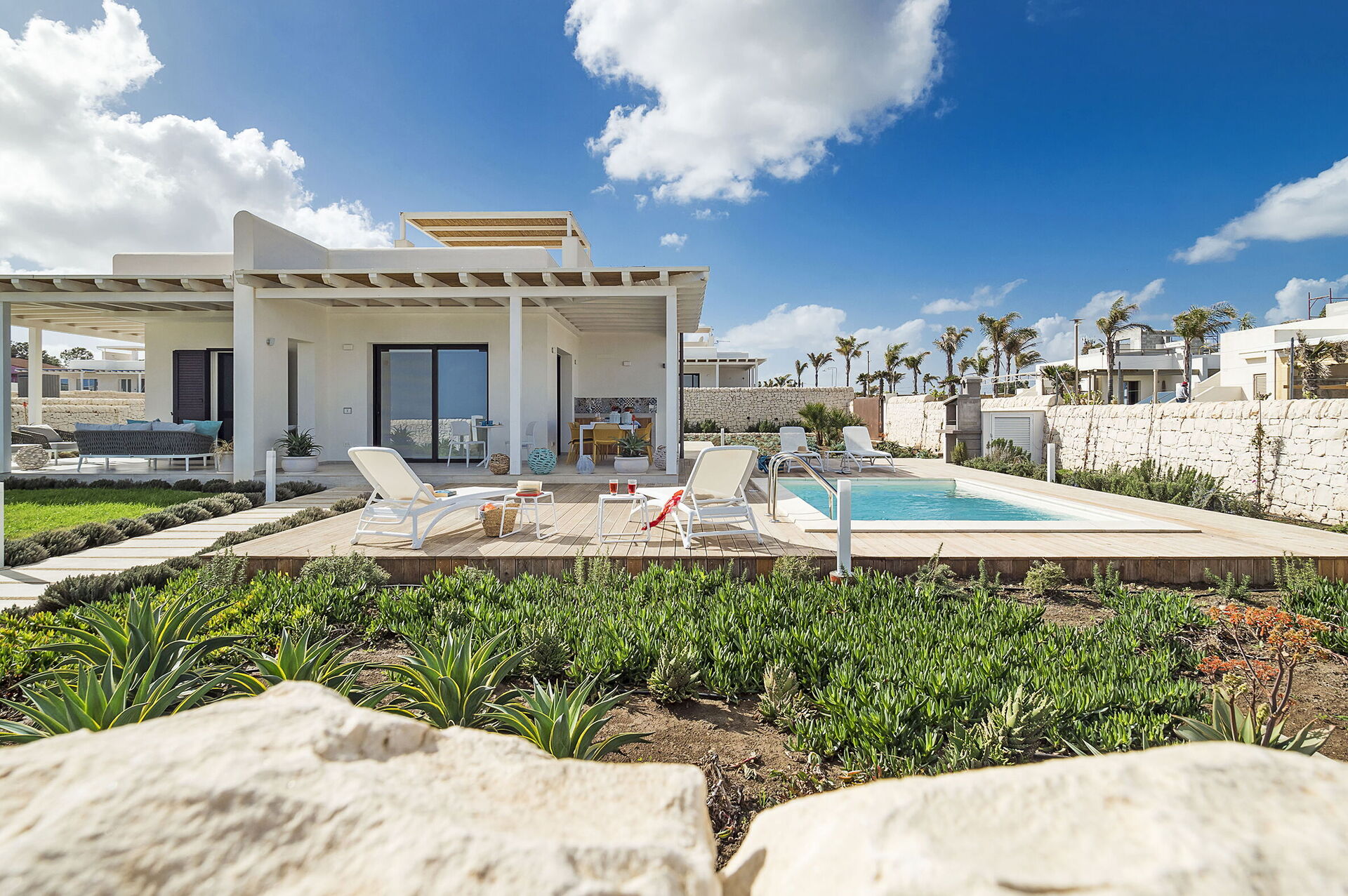 Entfernungen: Meer mit Felsen 100 m, Strand 300 m, Geschäfte aller Art 3 km, Noto 20 km, Syrakus 40 km, Ragusa 70 km, Flughafen Catania 100 km, Taormina 140 km.