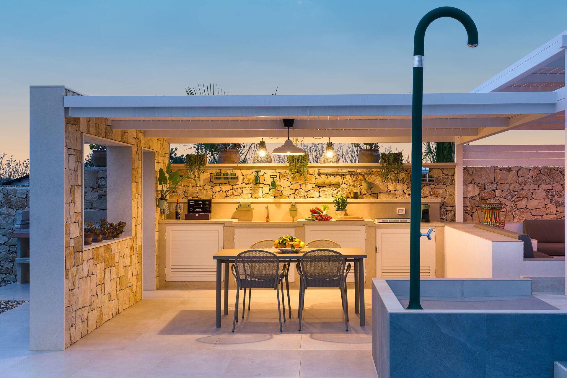 It was clean with equipped indoor and outdoor kitchens which were excellent. The garden furniture around the house and the variety of seating areas were all very comfortable and allowed you to follow the sun. The pool was large and clean regularly by Corrado who popped in every few days. The property was enclosed and with the electronic gate, and not being overlooked, provided privacy.