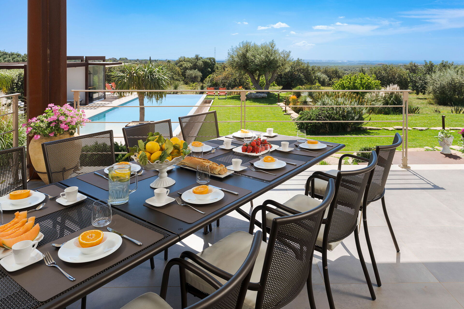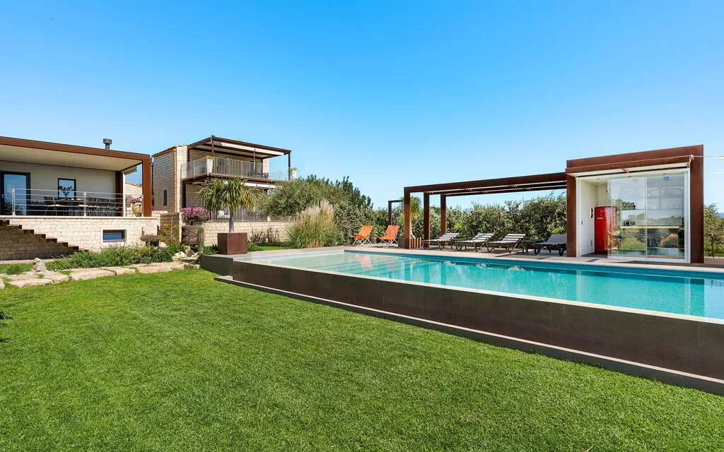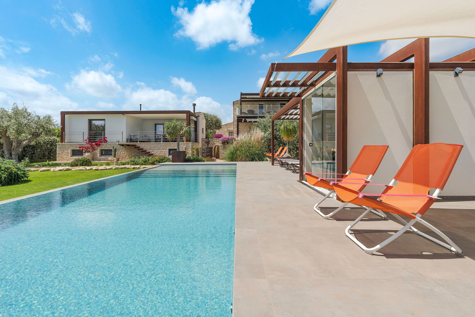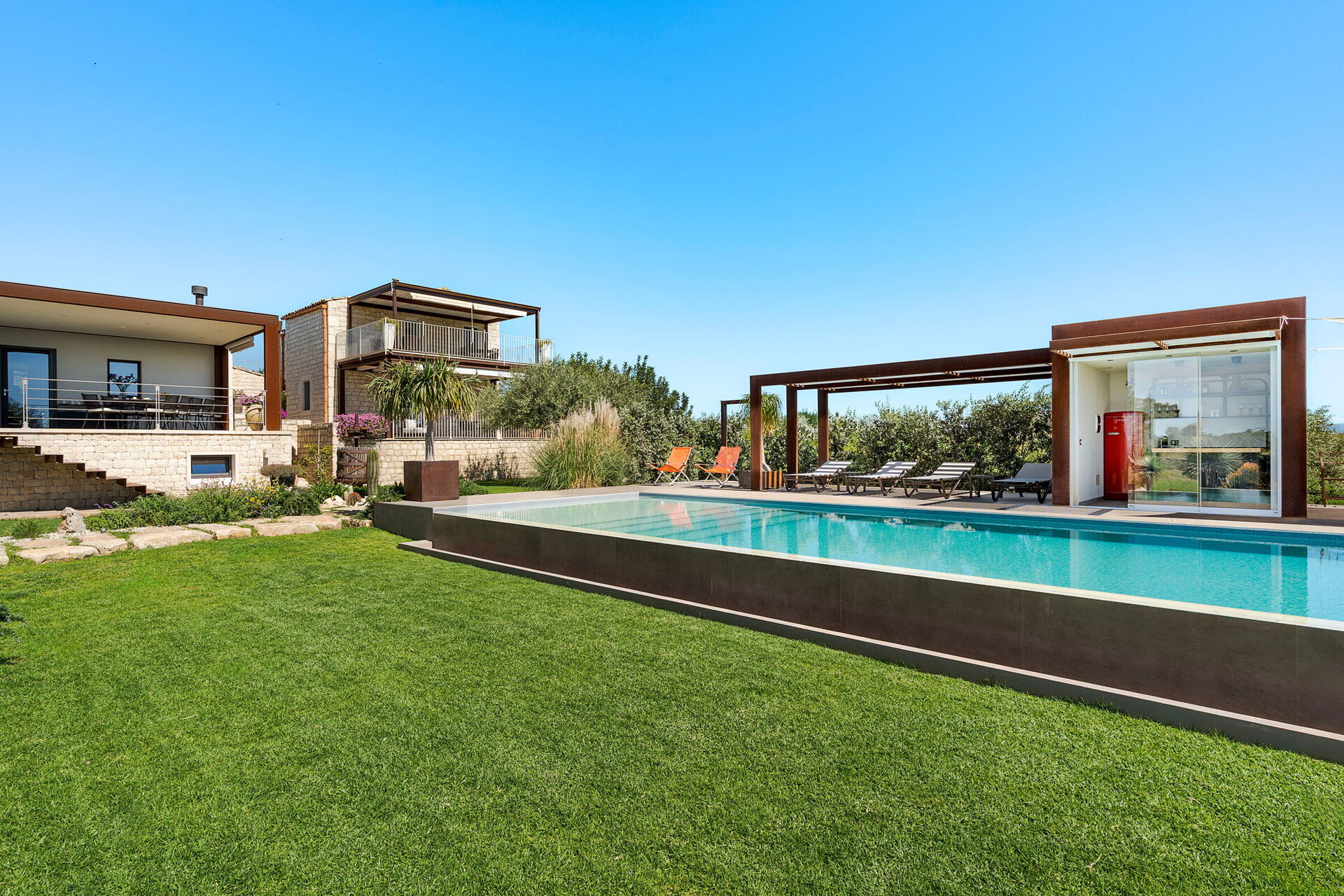 Die Villa Corte Antigua ist harmonisch in die charakteristische sizilianische Landschaft eingebettet, von einem gepflegten Garten umgeben und verfügt über ein schönes privates Schwimmbad sowie großzügige, möblierte Bereiche wie eine Veranda und eine Terrasse, die sich ideal zum Entspannen im Freien eignen.