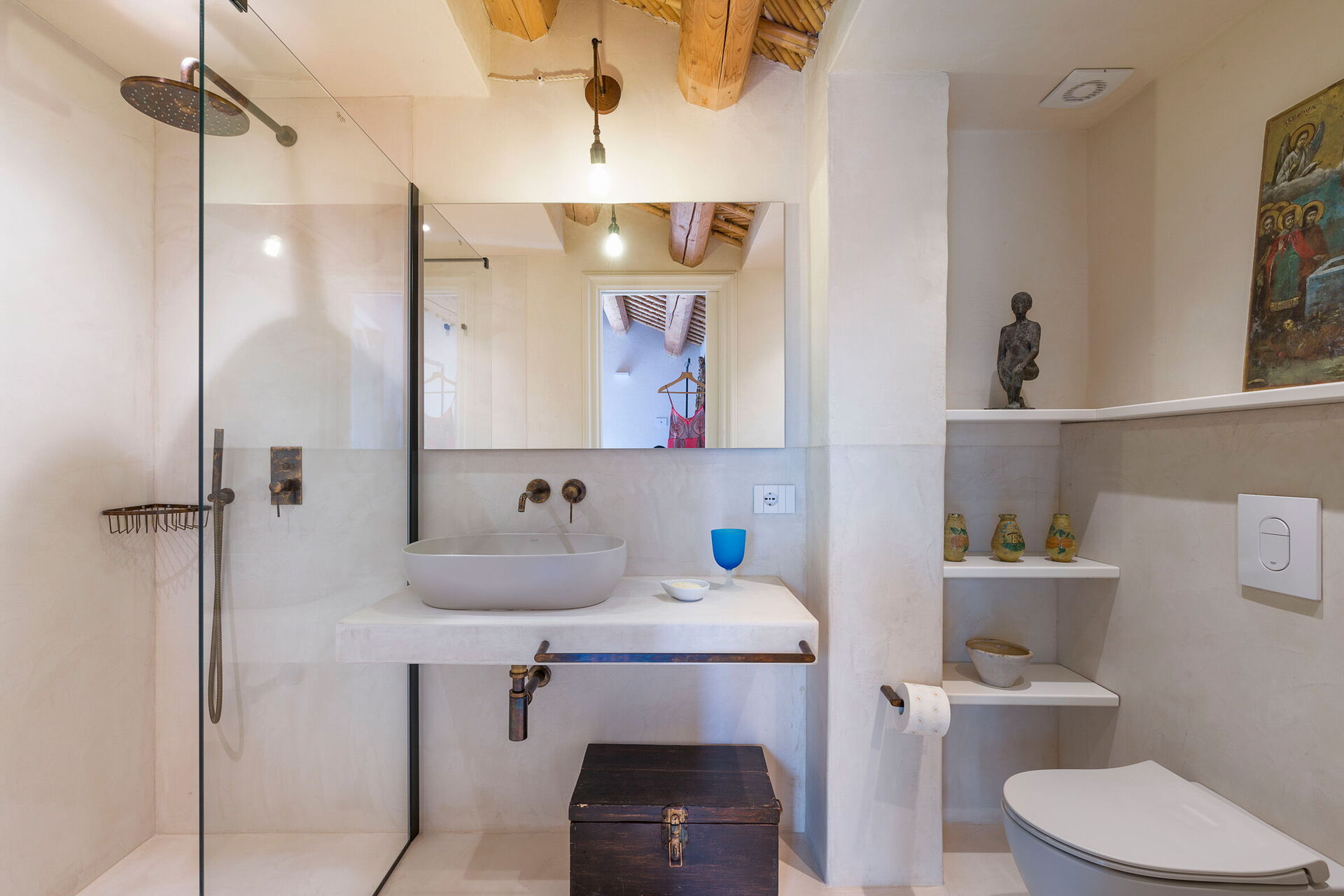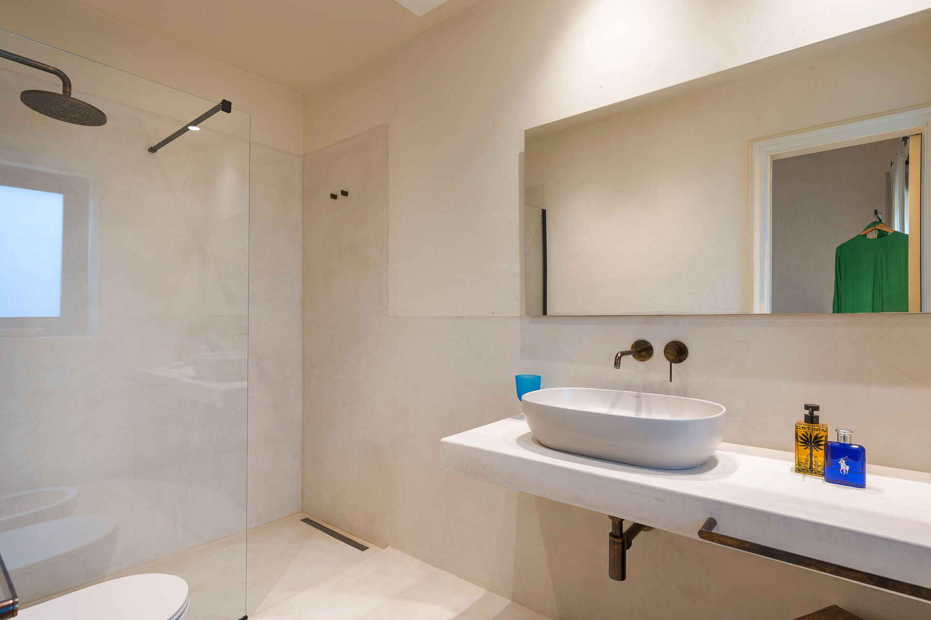 Erdgeschoss: Küche (Herd, Backofen, Gefrierschrank, Kühlschrank, Geschirrspüler, Kaffeemaschine, Toaster), Esszimmer, Panorama-Wohnzimmer (Smart-TV), 1 Doppelzimmer (Klimaanlage, Kingsize-Bett) mit privatem Bad mit Dusche, 2 Doppelzimmer (Klimaanlage) jeweils mit privatem Bad mit Dusche.