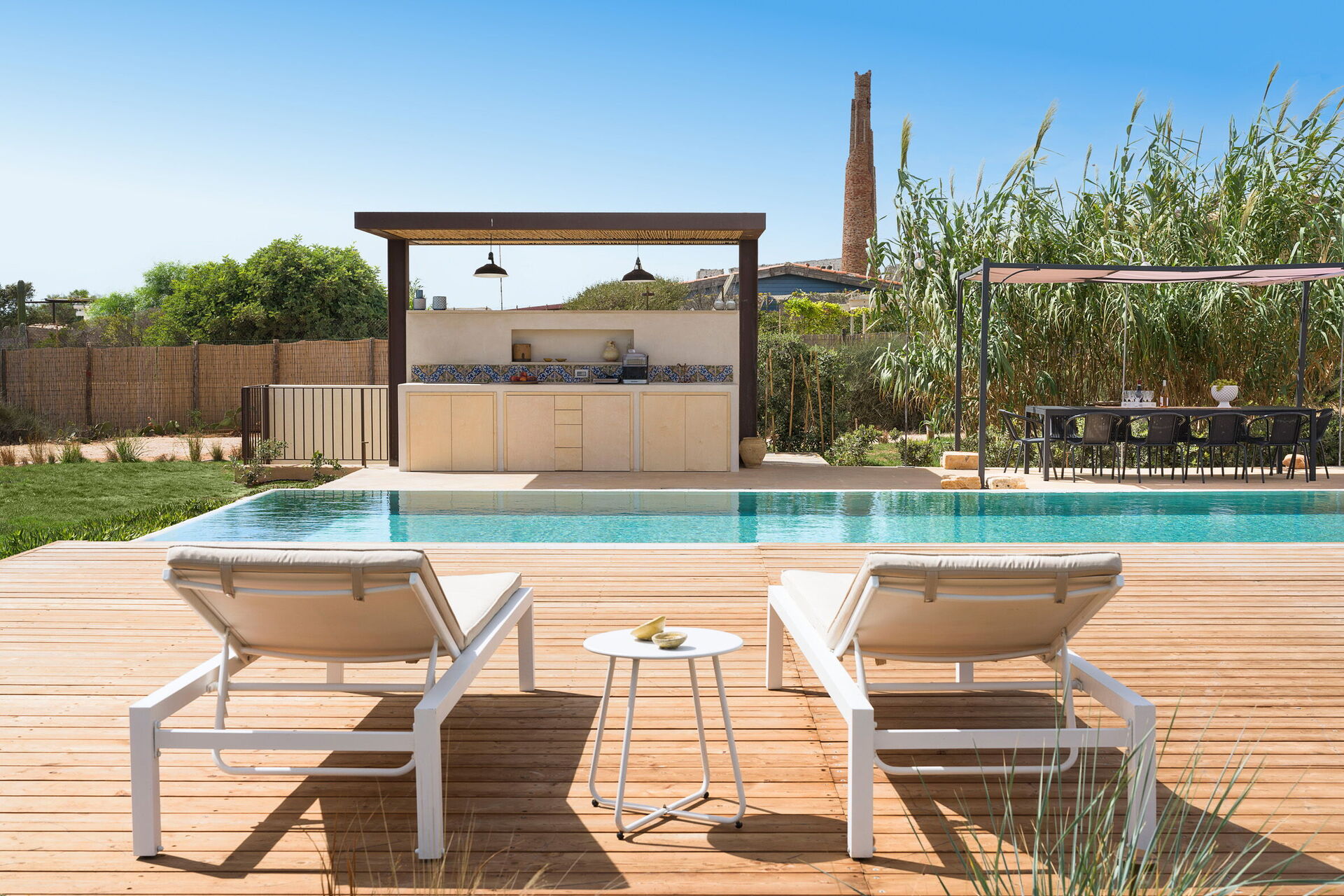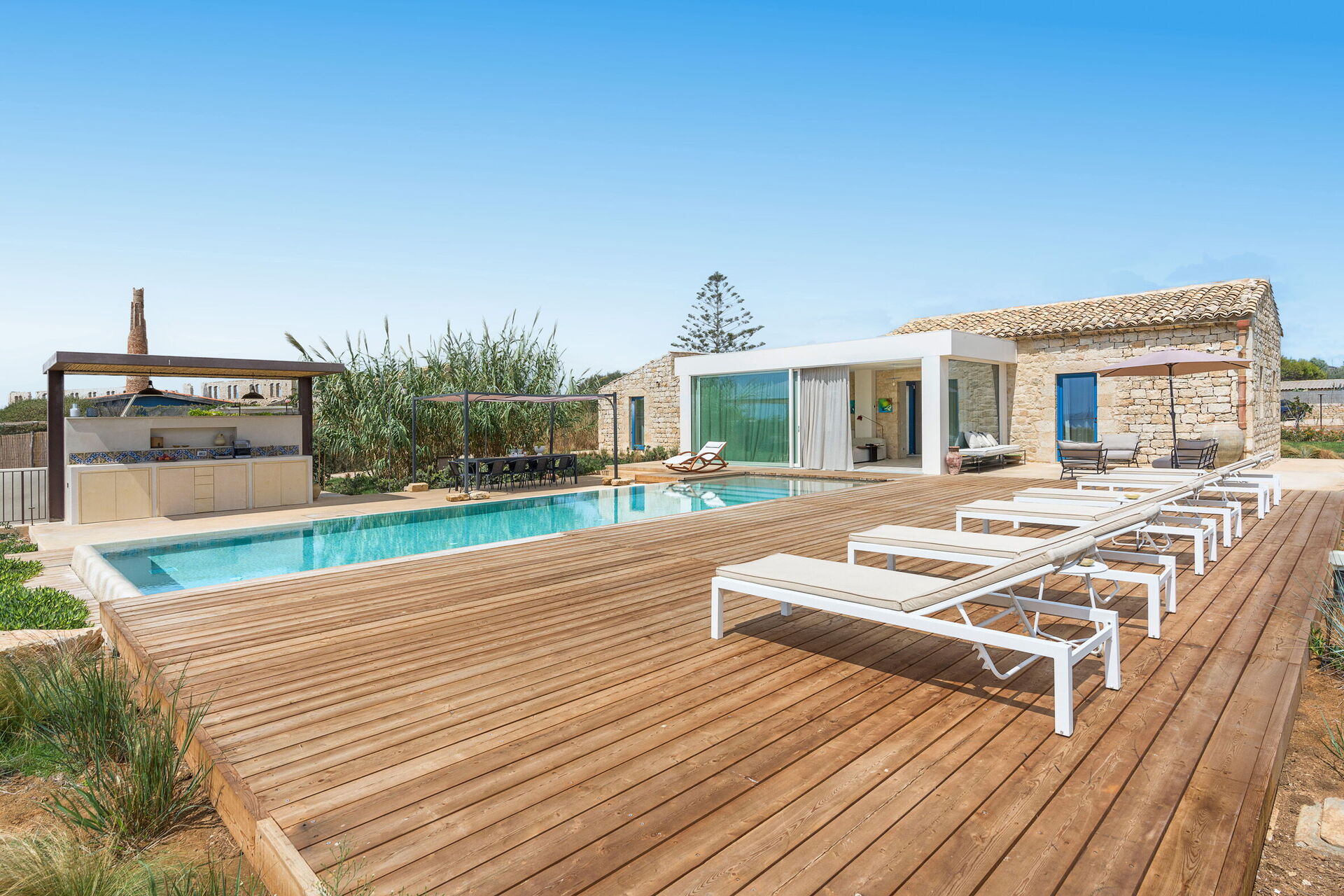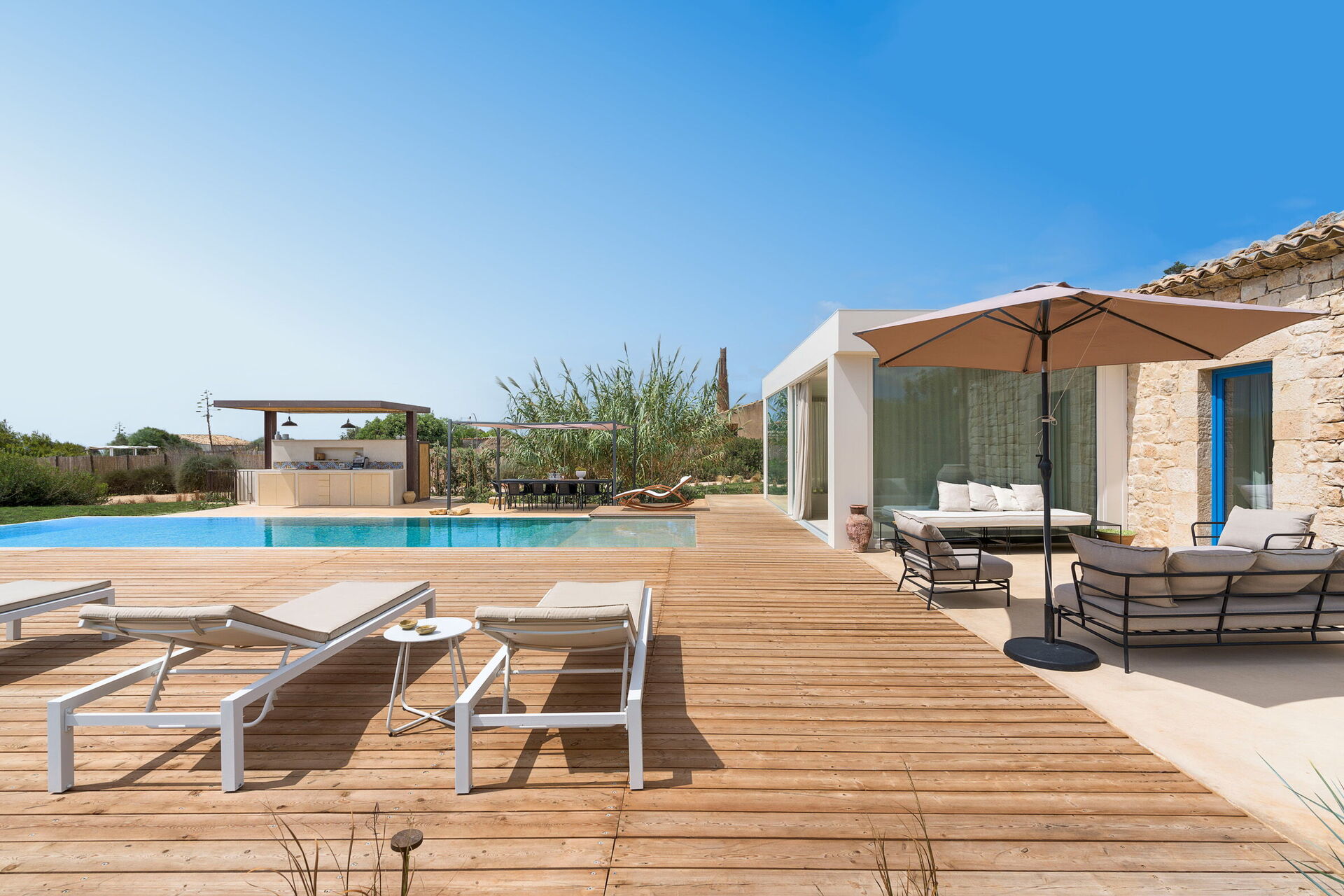 Die Residenz ist von einem großen Garten umgeben und verfügt über einen großen Sonnenterrassenbereich und ein privates Schwimmbad, das den Gästen exklusiv zur Verfügung steht. Ausserdem gibt es im Aussenbereich einen Pavillon mit Grill, Stühlen und Tischen für Mahlzeiten im Freien und Momente der Entspannung, die den Urlaub auf Sizilien einzigartig machen.