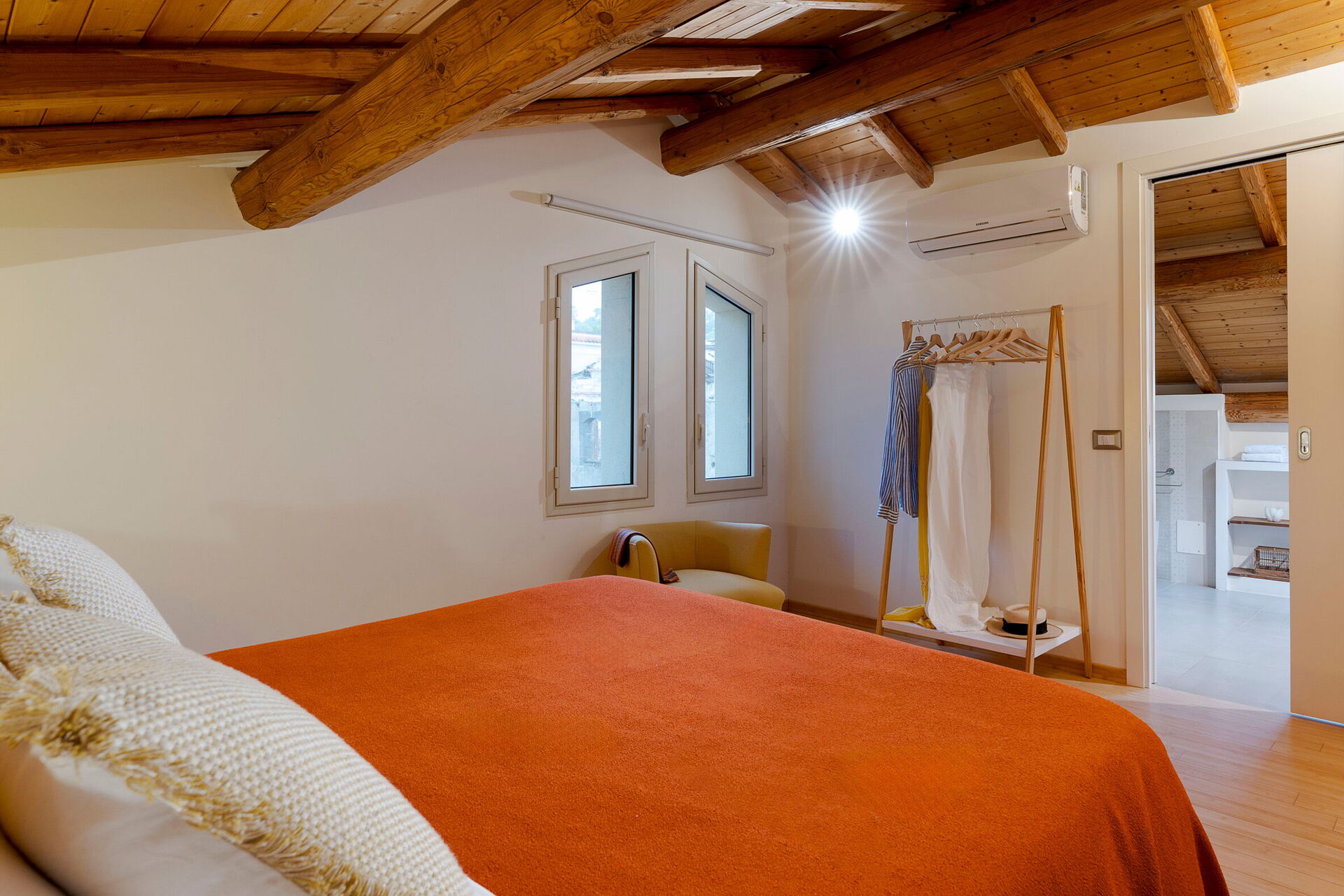 1.Stock (Loft): Großes Wohnzimmer, Doppelzimmer (Klimaanlage, Moskitonetze) mit privatem Bad mit Whirlpool-Badewanne.