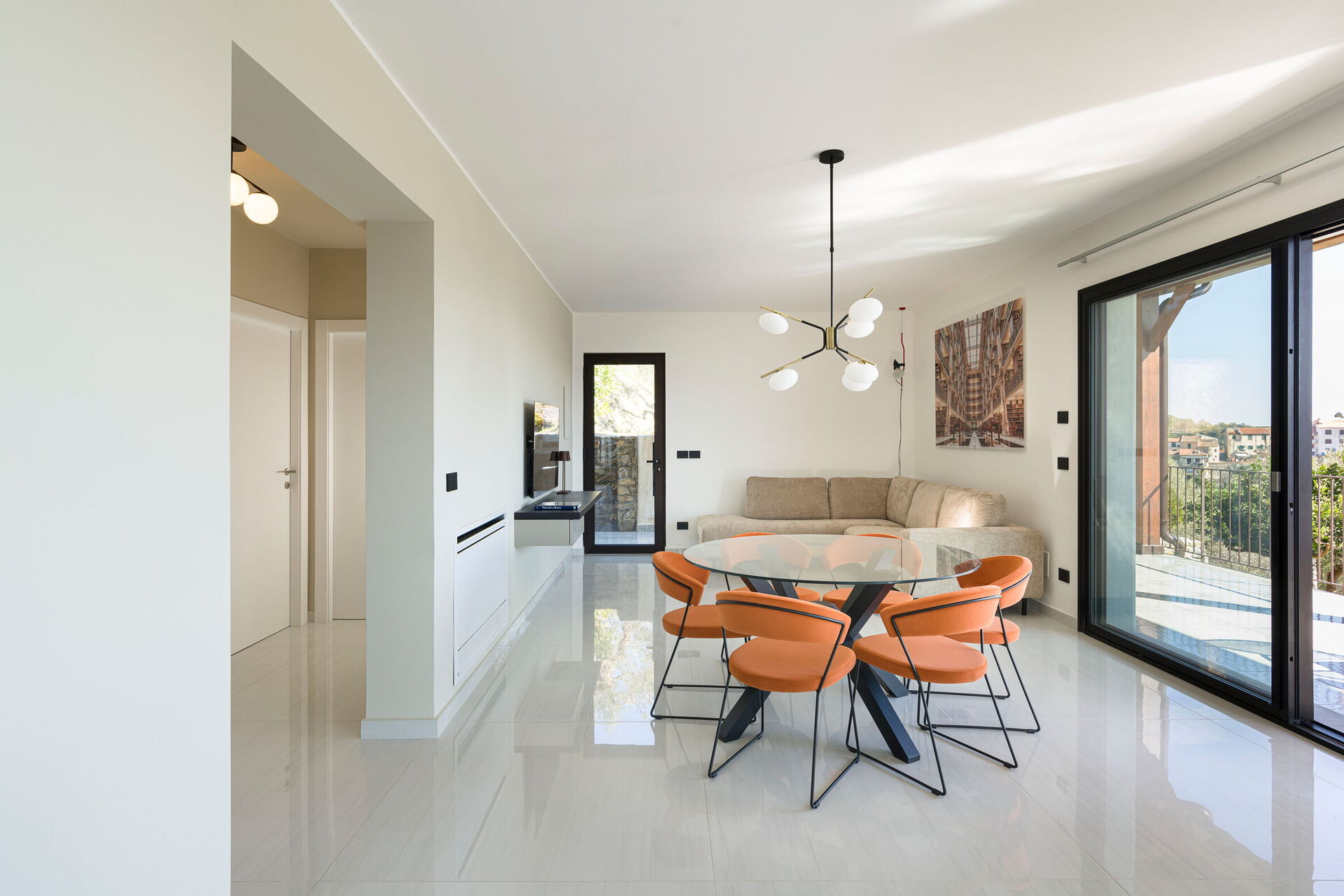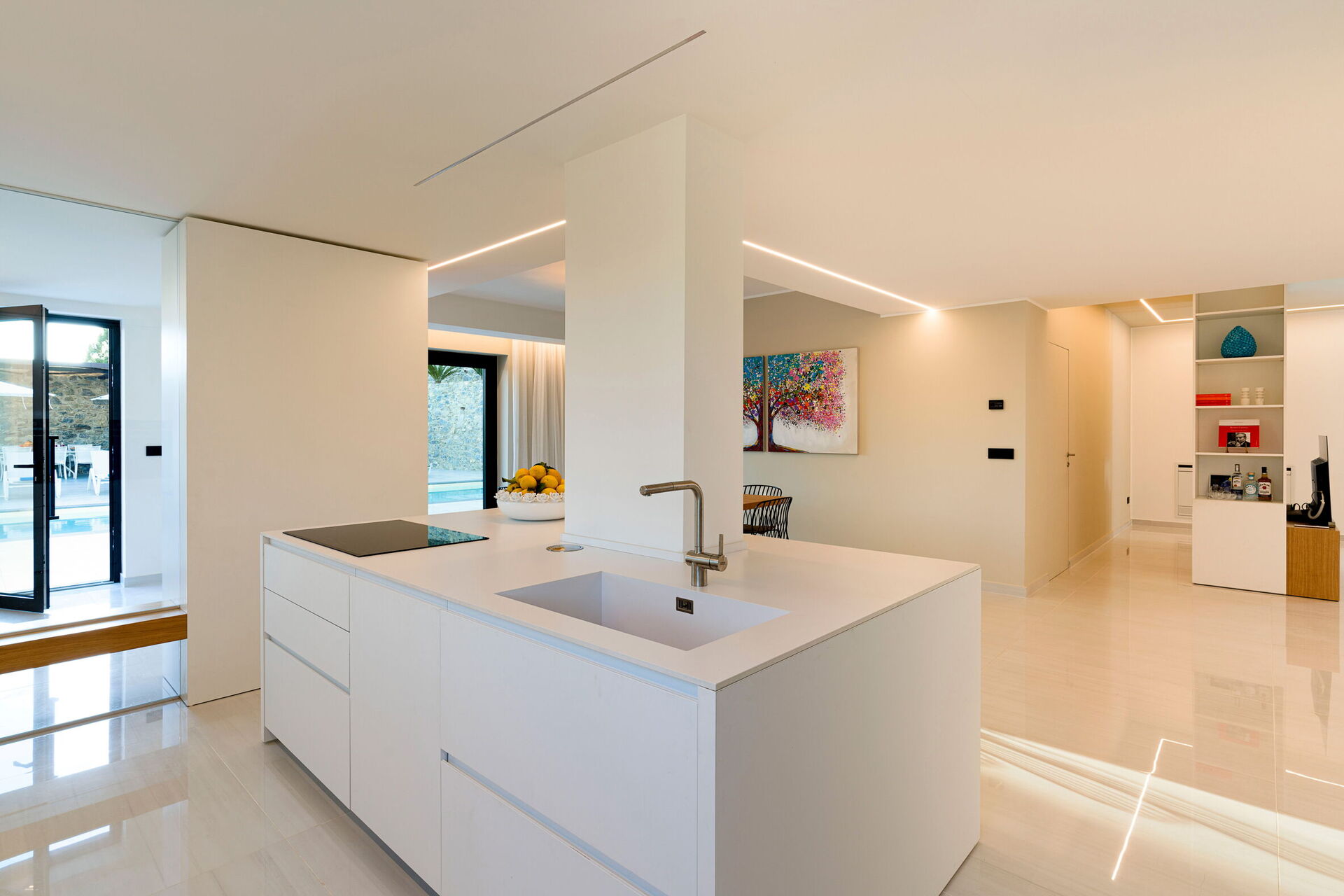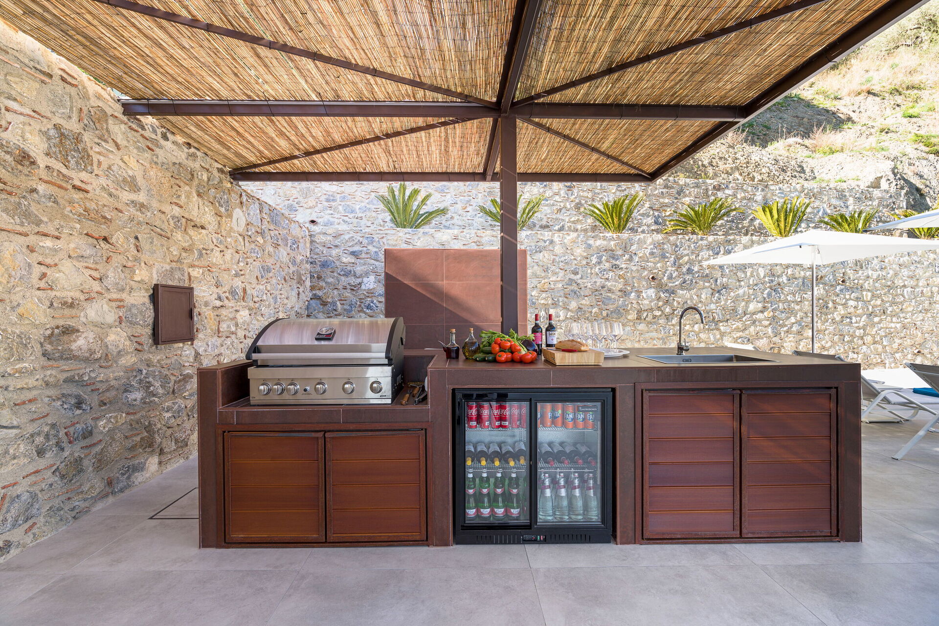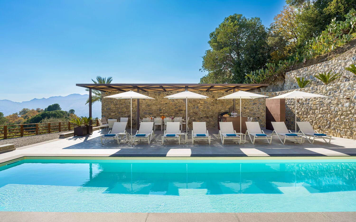 Große Außenbereiche wie die Sonnenterrassen am Schwimmbad, stehen den Gästen zum Entspannen in Gesellschaft von Freunden oder der Familie in absoluter Privatsphäre zur Verfügung. Ein ausgestatteter Bereich unter einem Pavillon mit Grill, Bar, Tischen und Stühlen ermöglicht es den Gästen, draußen zu essen und dabei den Panoramablick zu genießen.