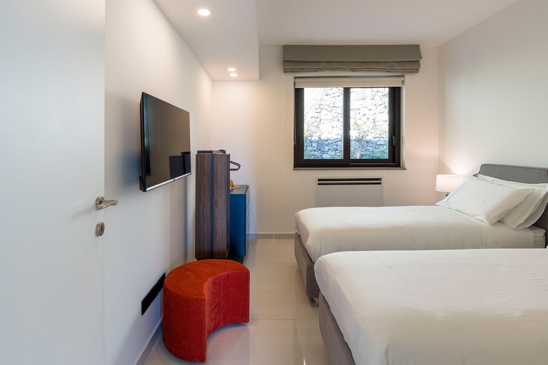 Erster Stock: (nur von außen zugänglich und intern nicht mit dem Rest der Villa verbunden): Wohnzimmer – Küche (Herd, Backofen, Kühlschrank, Gefrierschrank, Geschirrspüler, Mikrowelle, Toaster, Espressomaschine , amerikanische Kaffeemaschine) mit Essbereich und Zugang zur überdachten Panoramaterrasse, Doppelzimmer (Klimaanlage, TV, Moskitonetz) mit privatem Bad mit Dusche, Doppelzimmer (Klimaanlage, TV, Moskitonetz), Zweibettzimmer ( Klimaanlage, TV, Moskitonetz), 1 Badezimmer mit Dusche.